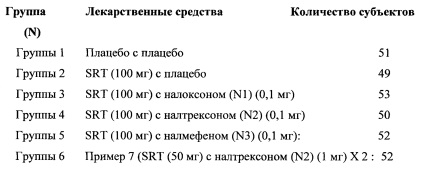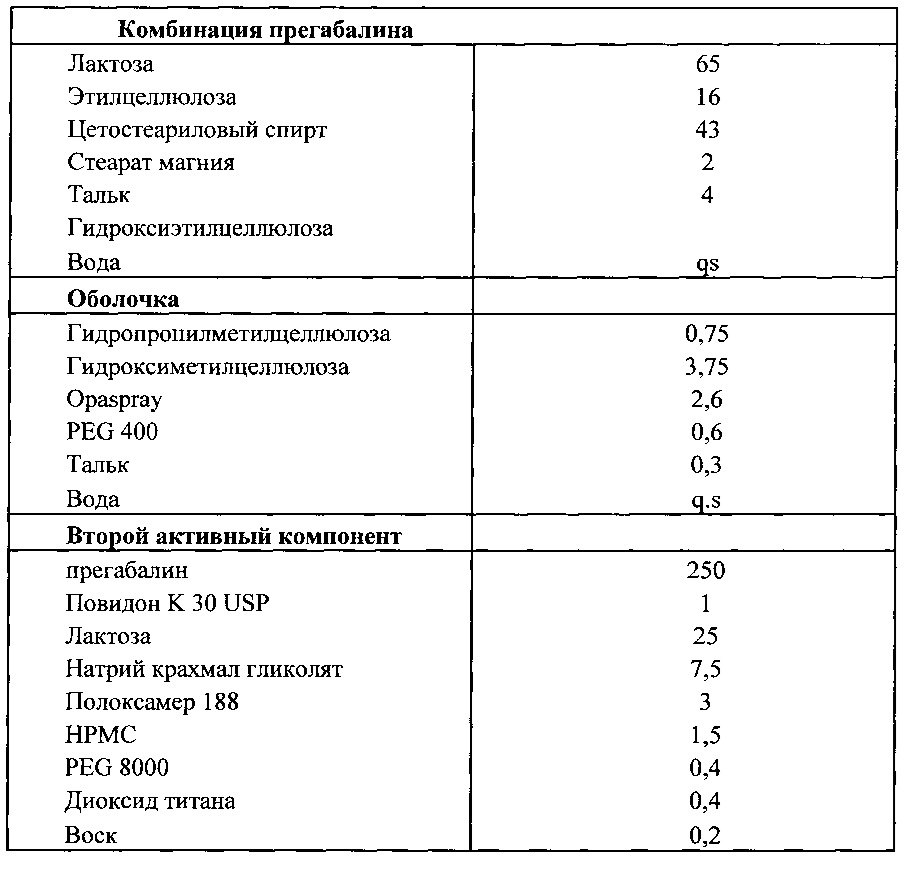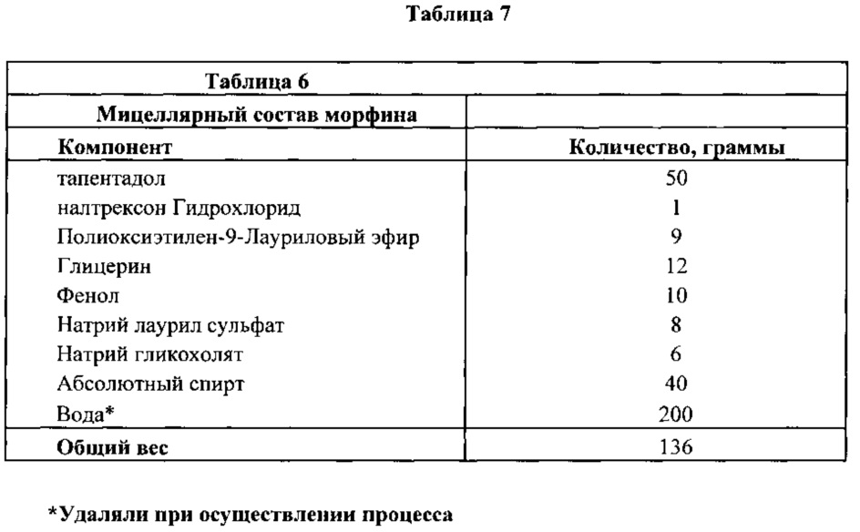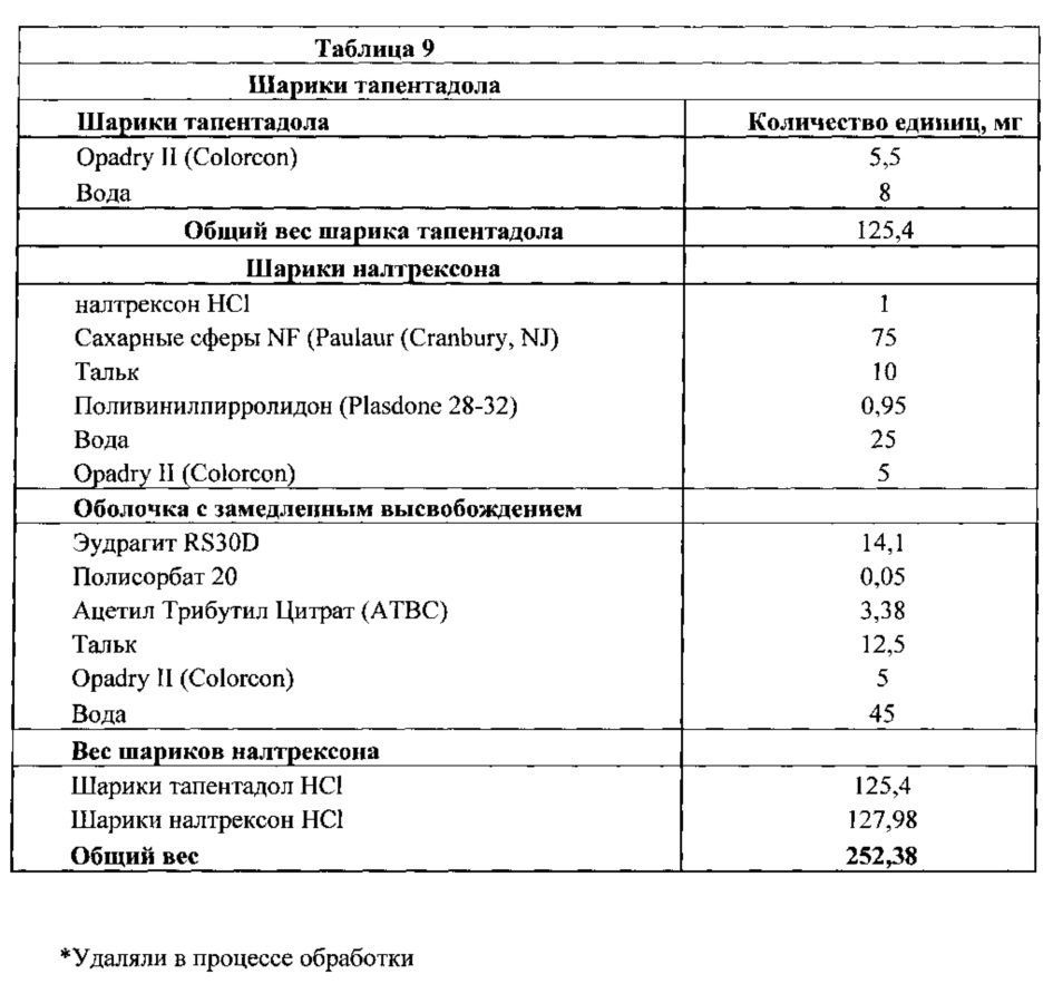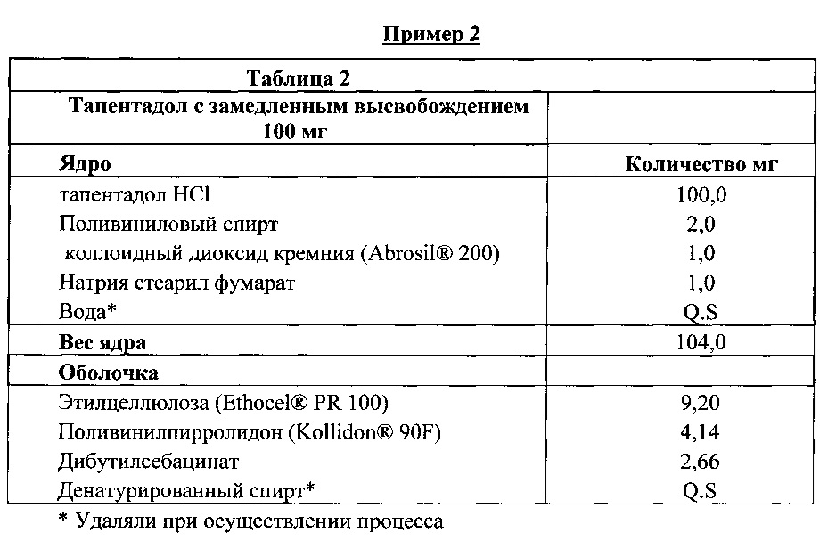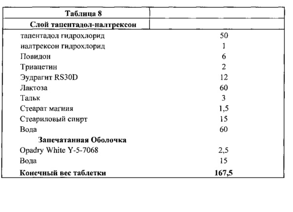 Тапентадол HCl 100 мг Микрокристаллическая целлюлоза 10-25% Поливиниловый спирт 3-5% Этилцеллюлоза (5-20 сп) 10-20% Гидроксиэтилцеллюлоза 5-15% коллоидный диоксид кремния 2-5% Натрий стеарил фумарат 1-2% Налтрексон гидрохлорид 1 мг Микрокристаллическая целлюлоза 5-20% Повидон 10-15% Натрий кросскармеллоза 5-10% Стеарат магния 0,5-2%