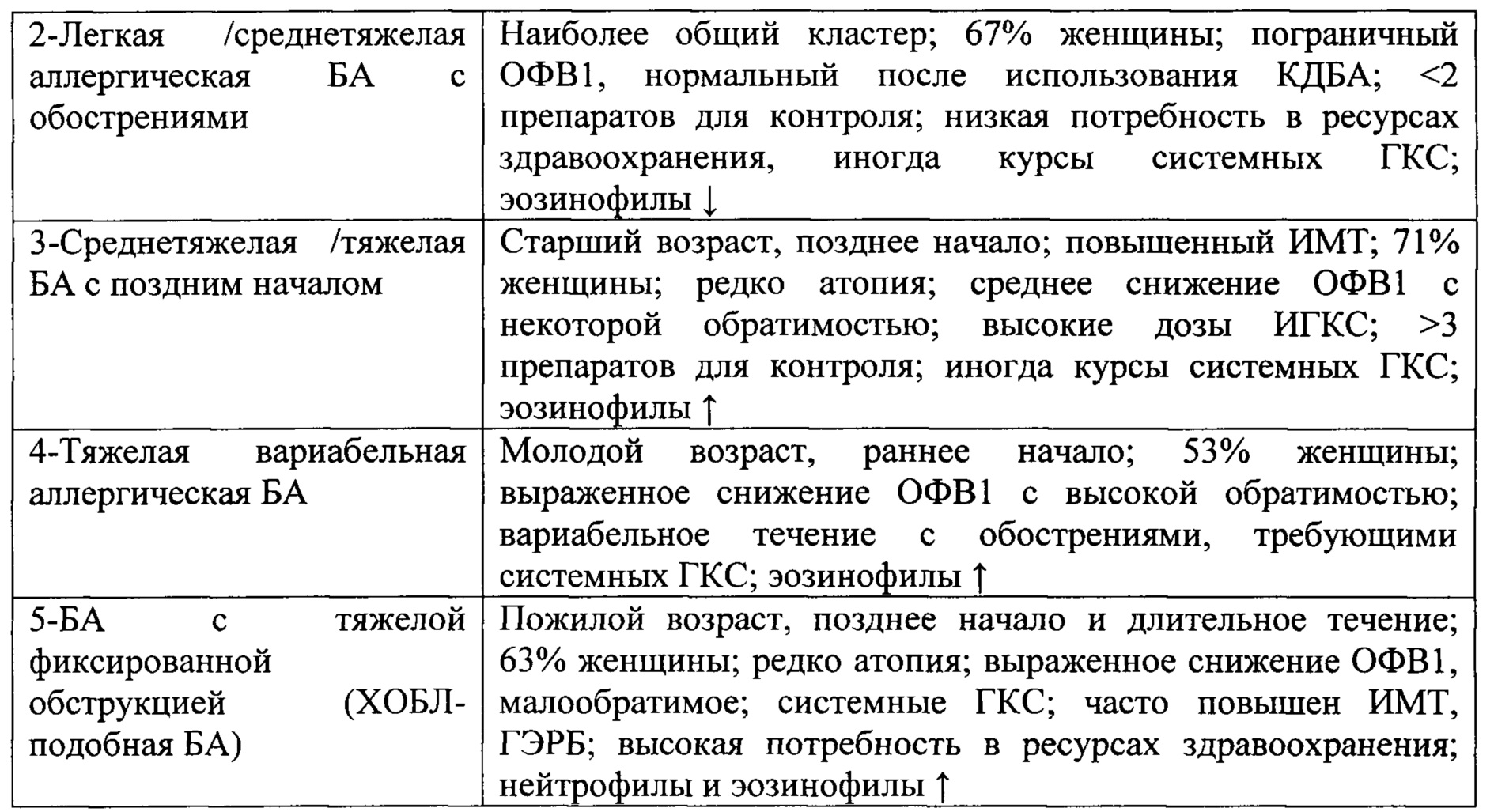 Изобретение относится к области медицины, а именно к педиатрии, пульмонологии и аллергологии, и может быть использовано для определения фенотипа атопической бронхиальной астмы у детей. Бронхиальная астма (БА) является глобальной медицинской и социально экономической проблемой, затрагивающей все возрастные группы, с распространенностью в мире от 1 до 21%. Современное ведение БА требует глубокого анализа факторов, ответственных за прогрессирование заболевания и развитие обострений, а также разработки целевой терапии БА с учетом клинических и биологических фенотипов болезни. Известен способ (аналог) (Ненашева Н.М. Фенотипы бронхиальной астмы и выбор терапии // Атмосфера. Пульмонология и аллергология. - 2014. - №2. - С. 2-11.) определения фенотипов БА: атопическая и неатопическая - при котором объективными различиями указанных фенотипов являются положительные кожные пробы с аллергенами и связь клинических симптомов атопической БА с контактами с этими аллергенами (таблица 1). Указанный способ имеет ряд недостатков: учтены лишь клинические и анамнестические параметры, ряд показателей оцениваются в ходе катамнестического наблюдения, нет предпосылок для дифференцированного подбора терапии. Существует способ (аналог) выделения фенотипов БА с применением кластерного анализа (Haldar P. et al. // Am. J. Respir. Crit. Care Med. 2008. - V. 178. - P. 218.; Moore W.C. et al. // Am. J. Respir. Crit. Care Med. 2010. - V. 181. - P. 315.). При этом выявлены 5 сходных кластеров заболевания среди взрослых пациентов: выделены три кластера аллергической Б А с дебютом в детском возрасте, два из которых характеризовались легким или среднетяжелым течением и благоприятными исходами (кластеры 1 и 2 в табл. 2) и один - тяжелым течением (кластер 4 в табл. 2). Сходным оказался и фенотип БА, сочетающейся с ожирением (кластер 3 в табл. 2), представленный преимущественно женщинами с поздним дебютом БА. Больше общих характеристик, чем различий, оказалось и в фенотипе тяжелой БА с поздним дебютом и выраженным нарушением функции легких (кластер 5 в табл. 2). Обозначения: ГЭРБ - гастроэзофагеальная рефлюксная болезнь, ИМТ - индекс массы тела, КДБА - коротко действующие β2-агонисты, ОФВ1 - объем форсированного выдоха за 1-ю секунду, ФВД - функция внешнего дыхания. Указанный способ имеет ряд недостатков: способ предложен для взрослых пациентов с бронхиальной астмой, фенотипы, выделенные на основании кластерного анализа, не отражают функциональные возможности организма при том или ином фенотипе БА, что не позволяет разработать и проводить персонифицированную терапию. Существует способ прогнозирования формирования фенотипа бронхиальной астмы у детей с атопическим дерматитом (аналог, патент RU №2563428, 2015), включающий определение прогностических признаков, в том числе наличия бронхообструктивного синдрома и наследственной отягощенности по атопии, построение уравнения логистической регрессии с расчетом зависимой переменной, где наличие признака равно 1, отсутствие признака равно 2, прогноз развития заболевания по формуле вероятности: р=ехрβ/(1+ехрβ), где р - вероятность развития заболевания в интервале от 0 до 1, ехр - константа, равная 2,72, β - зависимая переменная, прогноз развития бронхиальной астмы при значении р более 0,5, отличающийся тем, что в качестве прогностических признаков определяют возраст (x1), наличие внутриутробных инфекций (х2), нали