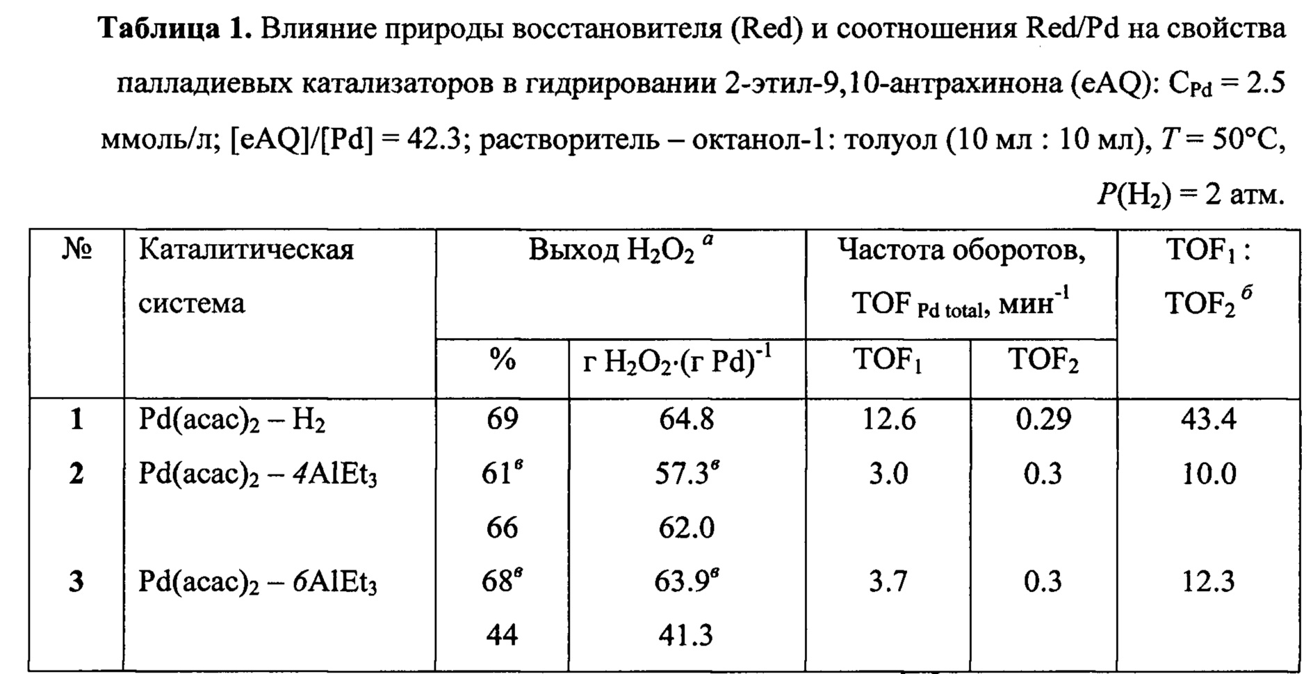 Предлагаемое изобретение относится к области органической химии, а именно к получению перекиси водорода антрахиноновым способом в присутствии палладиевых катализаторов; и может быть применено в различных отраслях промышленности и тонкого органического синтеза, связанных с применением перекиси водорода: в производстве бумаги, синтетических моющих средств, в фармацевтической промышленности, в очистке сточных вод. Широкое использование перекиси водорода связано как с ее эффективными окислительными свойствами, так и экологической целесообразностью, т.к. продуктом окисления Н2О2 является вода [Y. Han, Z. Не, S. Wang, W. Li, J. Zhang // Catal. Sci. Technol. - 2015. - Vol. 5. - P. 2630-2639]. Известно три основных промышленных способа получения Н2О2: электрохимический, включающий электролиз серной кислоты до пероксодисерной кислоты и гидролиз ее в пероксид водорода и серную кислоту; способ жидкофазного окисления 2-пропанола кислородом воздуха и антрахиноновый способ, включающий последовательное гидрирование и окисление алкилантрахинонов (2-этил-, 2-трет-бутил-и 2-пентилантрахинонов). Разрабатываются также подходы прямого синтеза перекиси водорода из водорода и кислорода [Campos-Martin J.M., Blanco-Brieva G., Fierro J.L. G. // Angew. Chem. Int. Ed. - 2006. Vol. 45. - P. 6962-6984]. Среди перечисленных выше антрахиноновый способ обладает рядом преимуществ. В частности, он менее энергоемкий, чем известный электрохимический способ; он более безопасен, чем способ синтеза перекиси водорода из простых веществ (Н2 и О2), смесь которых взрывоопасна в диапазоне объемных концентраций водорода в кислороде от 5 до 94% [Тихонов А.С., Чепайкин А.С., Суворова И.А., Анисимова В.И. // Вестник технологического университета. 2017. Т. 20. №16. С. 42-45]. В крупнотоннажном производстве процесс является рентабельным. Мировое промышленное производство перекиси водорода антрахиноновым способом достигает 95% [Campos-Martin J.M., Blanco-Brieva G., Fierro J.L. G. // Angew. Chem. Int. Ed. - 2006. Vol. 45. - P. 6962-6984]. Основной задачей антрахинонового способа является селективное каталитическое гидрирование 2-этил-9,10-антрахинона (eAQ) в 2-этил-9,10-антрагидрохинон (eAQH2), который легко окисляется кислородом воздуха до перекиси водорода с восстановлением исходного субстрата: Однако гидрирование алкилантрахинонов относится к сложным последовательно-параллельным процессам, в которых наряду с восстановлением карбонильной группы 2-этил-9,10-антрахинона протекают различные побочные реакции. К ним относятся, прежде всего, гидрирование ароматических колец в 2-этил-9,10-антрагидрохиноне с образованием 2-этил-5,6,7,8-тетрагидро-9,10-антрагидрохинона (H4eAQH2), 2-этил-1,2,3,4-тетрагидро-9,10-антрагидрохинона (изо-H4eAQH2) и 2-этил-1,2,3,4,5,6,7,8-октагидро-9,10-антрагидрохинона (H8eAQH2) (eAQH2→H4eAQH2 (изо-H4eAQH2)→H8eAQH2), а также гидрогенолиз связи C-O образующегося алкилантрагидрохинона до 2-этилантронов (eAN) [Drelinkiewicz A., Waksmundzka-Gora А. // J. Mol. Catal. A: Chem. 2006. V. 246. P. 167-172]. При более глубоком превращении возможен дальнейший гидрогенолиз 2-этилантронов до 2-этилантрацена и гидрирование ароматических колец 2-этил-9(10)-антронов и 2-этилантрацена. Одной из основных задач промышленного синтеза перекиси водорода антрахиноновым способом является повышение селективности известных и разработка новых эффективных катализаторов гидрирования 2-этил-9,10-антрахинона в результате снижения вклада побочных реакций превращения активных хинонов. Желательно разработать высокосел