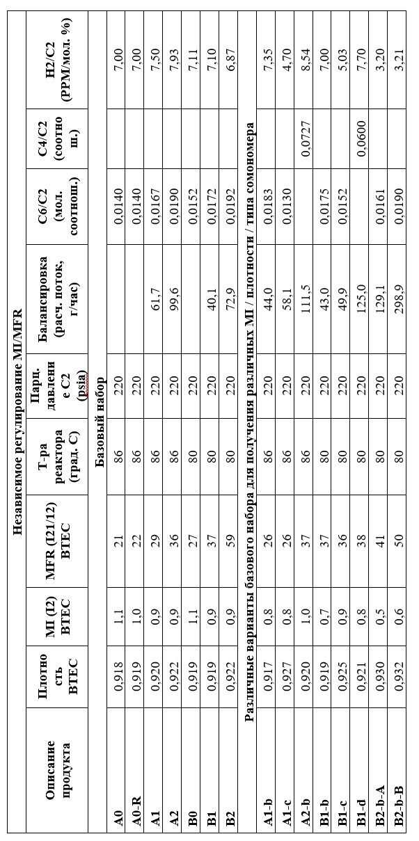 Изменение ударопроч-ности по сравнению с US6255426(г/мил) 488 294 193 312 (% разн.) 70% 180% 364% 208% Exceed 1018 CA при 2 мил A0 при 2 мил A1 при 2 мил B0 при 2 мил Плотность (г/см3) 0,919 0,918 0,920 0,919 MI (I-2) (град./ мин.) 1,0 1,1 0,9 1,1 MFR (I-21/I-2) 15 21 29 27 Нагрузка двигателя (%) 65,1 60,7 54,1 53,0 E.S.O. (фунт/