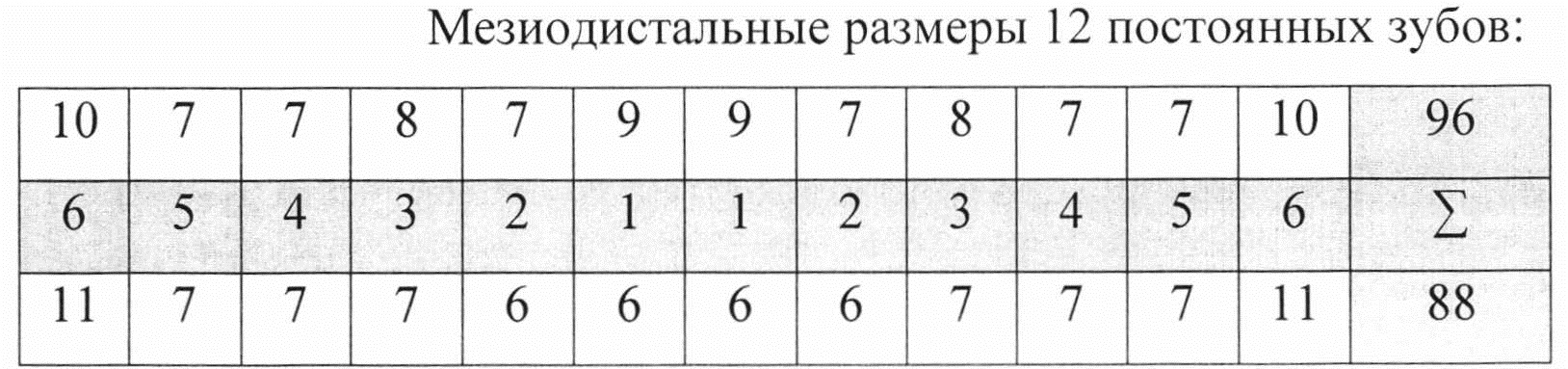 Изобретение относится к медицине, а именно к ортодонтической стоматологии, и может быть использовано при биометрической диагностике для выбора варианта ортодонтического лечения с удалением и без удаления зубов, а также для коррекции дефицита места в зубном ряду при различных аномалиях. Известно, что у пациентов с зубочелюстными аномалиями, как правило, имеются аномалии формы, размеров, положения отдельных зубов, которые вызывают различные деформации и аномалии формы и размеров зубных рядов (Нанда Р. Биомеханика и эстетика в клинической ортодонтии. Пер. с англ. - М.: Медпресс-информ, 2009. - С. 89-105.; Методические рекомендации по диагностике зубо-челюстных аномалий на моделях челюстей / Центр, метод, кабинет ФУВиП. - М., 1986. - 40 с; А.В. Тихонов, С.А. Попов, О.В. Баша. Трансверсальные и сагиттальные изменения зубных рядов при лечении скученного положения зубов у нерастущих пациентов с использованием системы пассивного самолигирования. Ортодонтия. 2015. (71) №3. - С. 54-61.). У пациентов с неправильным расположением зубов, вызванным различными аномалиями положения зубов и дефицита места в зубном ряду, важным является метрическое установление выраженности скученности зубов (в мм) или избытка места на верхней и нижней зубных дугах с целью дальнейшего планирования ортодонтической коррекции. При этом оценку выраженности тесного положения зубов, выявления индивидуального несоответствия размеров зубов и челюстей, определения сужения и укорочения зубных рядов, недоразвития апикального базиса для планирования направления и величины перемещения зубов при ортодонтическом лечении проводят, как правило, путем измерения диагностических моделей челюстей. Известные способы определения дефицита места в зубном ряду основаны, как правило, на определении разницы суммы мезио-дистальных размеров зубов и действительной полной длины на моделях челюстей (Нетцель Ф., Шультц К. Практическое руководство по ортодонтической диагностике. Анализ и таблицы для использования в практике. Пер. с англ. - Львов: Гал-дент, 2006. - Nance, 1947, с. 57) и сегментарной зубной дуги (Нетцель Ф., Шультц К. Практическое руководство по ортодонтической диагностике. Анализ и таблицы для использования в практике. Пер. с англ. - Львов: Гал-дент, 2006. - Lundstrom, 1954, с. 58.; Нетцель Ф., Шультц К. Практическое руководство по ортодонтической диагностике. Анализ и таблицы для использования в практике. Пер. с англ. - Львов: Гал-дент, 2006. - Schopf, 1970, с. 68; Методические рекомендации по диагностике зубо-челюстных аномалий на моделях челюстей / Центр. метод. кабинет ФУВиП. - М., 1986. -40 с). Так, известен способ определения мезиального смещения боковых зубов по Schwarz (П.А. Железный, Н.А. Плотникова. Ортодонтия и детское протезирование. Новосибирск, 1998, с. 28, 31). Одностороннее несоответствие в расположении боковых зубов определяют по соотношению касательных, проведенных к дистальной поверхности премоляров и моляров, перпендикулярных срединному небному шву. При одностороннем мезиальном смещении боковых зубов между этими линиями появляется расстояние, причем чем больше это расстояние, тем значительнее сдвиг боковых зубов. Недостатками способа является невозможность определить неправильное положение отдельных зубов сегментов и провести планирование направления перемещения зубов. Известен способ определения симметричности и соотн