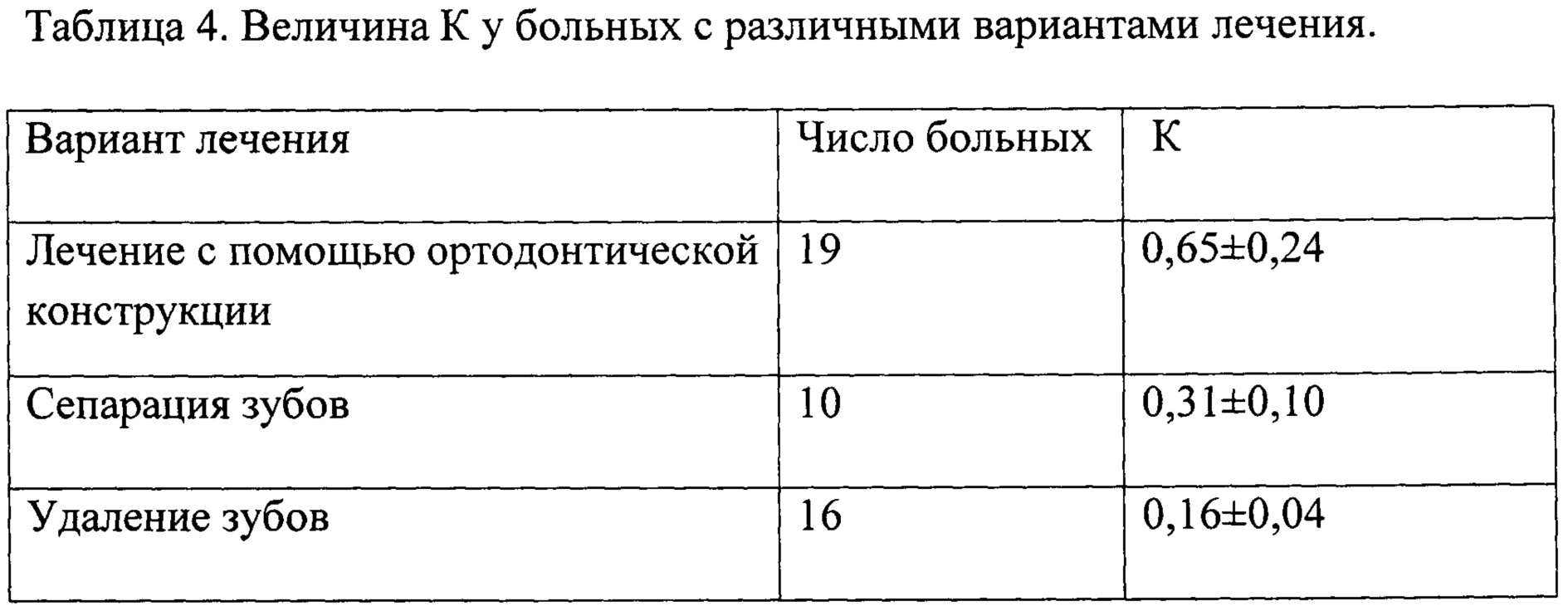1. Способ ортодонтического лечения при скученности зубов в центральном отделе зубного ряда путем предварительного обследования челюстей пациента с использованием биометрических методов, включающих выявление значимых параметров, диагностику состояния зубов, измерение апикального базиса челюстей и выдачу рекомендаций на лечение и устранение нарушений зубного ряда, отличающийся тем, что в ходе предварительного обследования проводят компьютерную томографию челюстей, в качестве значимых параметров выбирают толщину кортикальной пластинки оральной и вестибулярной стороны и толщину корней центральных зубов, а при выдаче рекомендаций для каждого центрального зуба определяют значимые параметры на компьютерной томограмме и рассчитывают коэффициент К по формуле где ОП - толщина кортикальной пластинки с оральной стороны, мм; ВП - толщина кортикальной пластинки с вестибулярной стороны, мм; ЗК - ширина зубных корней, мм; АБ - апикальный базис данного пациента; АН - нормативный апикальный базис, составляющий 44 мм для верхней челюсти и 43 мм для нижней челюсти, после чего при К=0,4 и более проводят лечение с помощью ортодонтической конструкции; при К менее 0,4 и более 0,2 проводят сепарацию зубов; а при К=0,2 и менее рассматривается вопрос об удалении зубов. 2. Способ по п. 1, отличающийся тем, что для окончательного решения о необходимости удаления зубов исключают из формулы рассчитываемого корректирующего коэффициента параметры зубов, предлагаемых для удаления, и принимают решение об удалении зубов в случае повышения при этом корректирующего коэффициента до величины более 0,20.