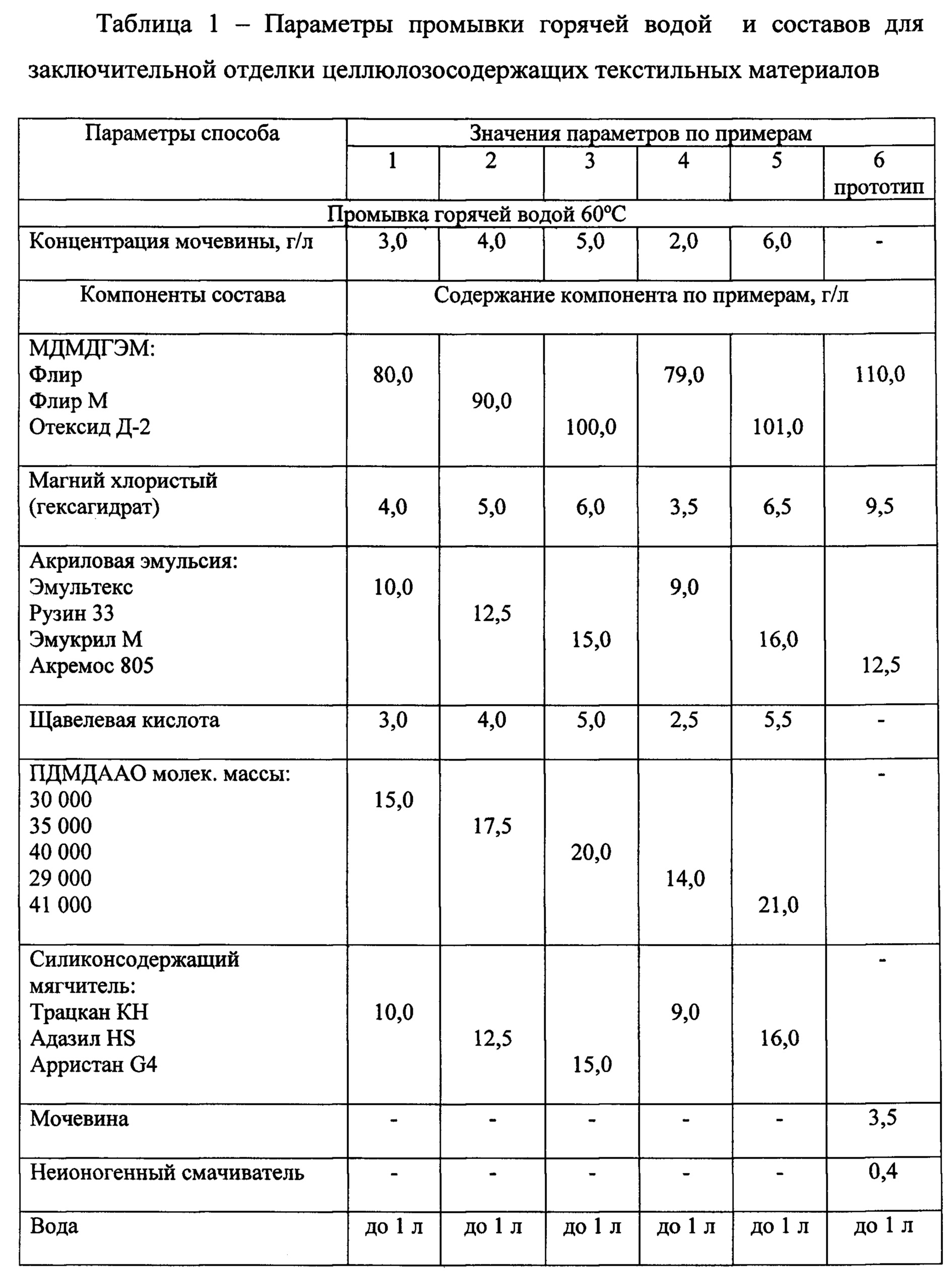 Способ крашения и отделки целлюлозосодержащих текстильных материалов, включающий пропитку материала красильным раствором, содержащим активный краситель, хлористый натрий, гидроксид натрия и кальцинированную соду, промывку холодной и горячей водой, повторную промывку горячей водой, мыловку, двукратную промывку горячей водой, обработку раствором уксусной кислоты и заключительную отделку путем пропитки составом, включающим предконденсат термореактивной смолы на основе модифицированной диметилолдигидроксиэтиленмочевины, магний хлористый (гексагидрат), акриловую эмульсию и воду, отжим, сушку и термообработку, отличающийся тем, что промывку горячей водой производят в присутствии мочевины концентрацией 3-5 г/л, а в состав для заключительной отделки дополнительно вводят щавелевую кислоту, полимерный препарат на основе полидиметилдиаллиламмониевого основания молекулярной массы 30000-40000 и силиконсодержащий мягчитель при следующем соотношении компонентов, г/л:Предконденсат термореактивной смолы на основе модифицированной диметилолдигидроксиэтиленмочевины 80,0-100,0 Магний хлористый (гексагидрат) 4,0-6,0 Акриловая эмульсия 10,0-15,0 Щавелевая кислота 3,0-5,0 Полимерный препарат на основе полидиметилдиаллиламмониевого основания молекулярной массы 30000-40000 15,0-20,0 Силиконсодержащий мягчитель 10,0-15,0 Вода до 1 л