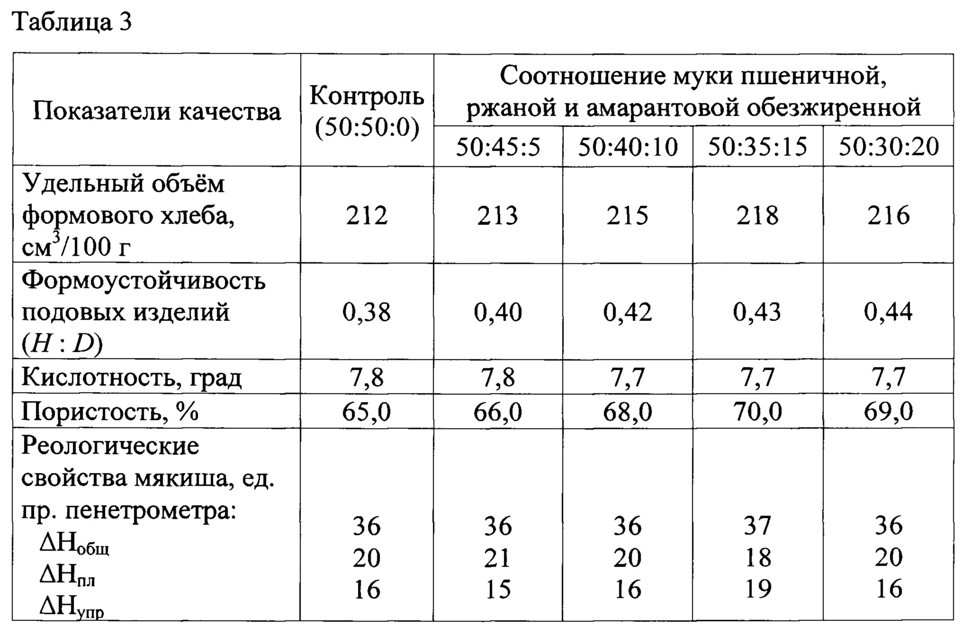 Способ производства ржано-пшеничного хлеба с амарантовым улучшителем, предусматривающий приготовление теста однофазным способом из муки ржаной хлебопекарной, муки пшеничной хлебопекарной, дрожжей прессованных хлебопекарных, соли поваренной пищевой, сахара-песка, сухой закваски-подкислителя, амарантового улучшителя качества хлеба и воды питьевой, разделку, расстойку и выпечку целевого продукта, отличающийся тем, что в качестве амарантового улучшителя в тесто вводят муку амарантовую обезжиренную, получаемую путем фракционирования СО2-шрота амаранта - побочного продукта при выделении масляного экстракта в результате СО2-экстракции липидов зерна амаранта, в количестве 15,0% от суммарной массы муки пшеничной хлебопекарной, муки ржаной хлебопекарной и муки амарантовой обезжиренной.