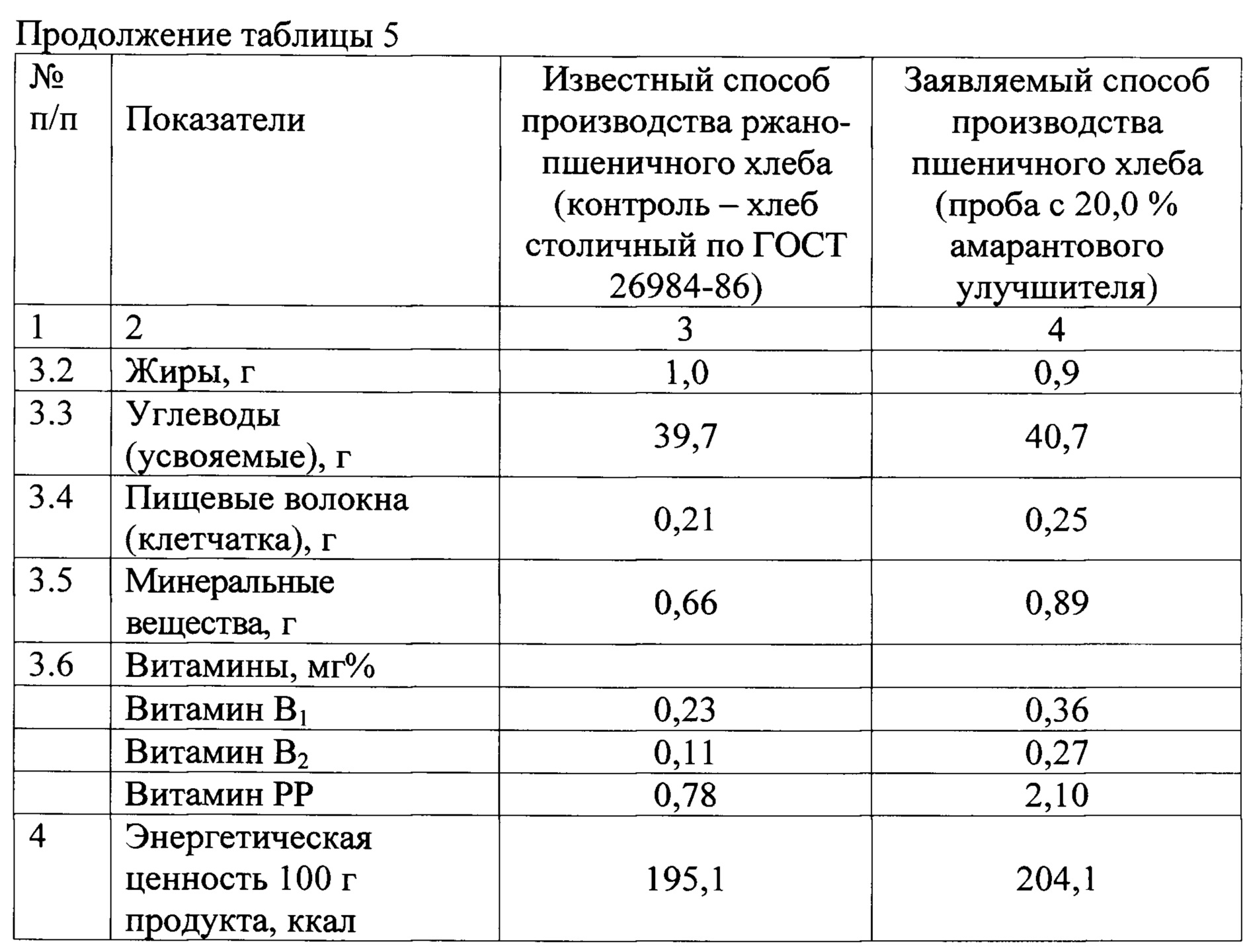 Изобретение относится к пищевой промышленности. Способ производства ржано-пшеничного хлеба с амарантовым улучшителем предусматривает приготовление теста однофазным способом из муки ржаной хлебопекарной, муки пшеничной хлебопекарной, дрожжей прессованных хлебопекарных, соли поваренной пищевой, сахара-песка, сухой закваски-подкислителя, амарантового улучшителя качества хлеба и воды питьевой, разделку, расстойку и выпечку целевого продукта. В качестве амарантового улучшителя в тесто вводят муку амарантовую обезжиренную, получаемую путем фракционирования СО-шрота амаранта - побочного продукта при выделении масляного экстракта в результате СО-экстракции липидов зерна амаранта, в количестве 15,0% от суммарной массы муки пшеничной хлебопекарной, муки ржаной хлебопекарной и муки амарантовой обезжиренной. Изобретение позволяет улучшить показатели качества ржано-пшеничного хлеба и придать ему полезные пищевые свойства. 5 табл.