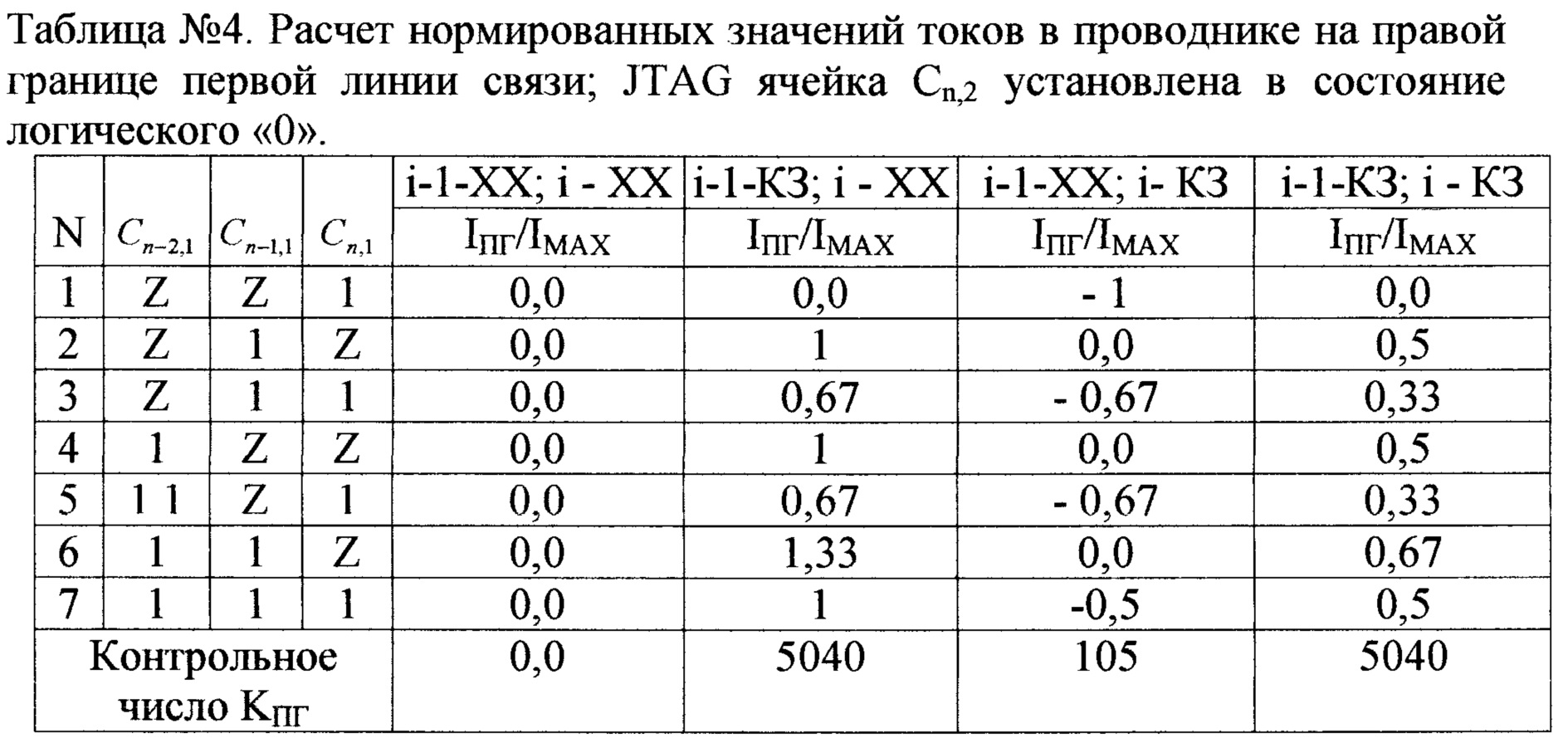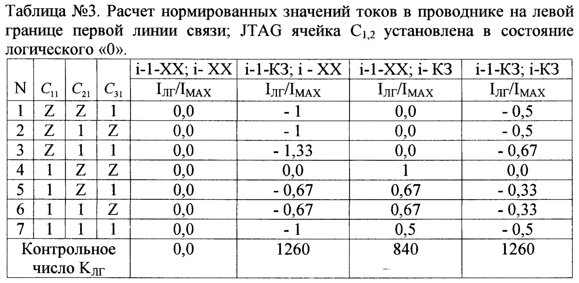 1. Способ локализации дефектов короткого замыкания выводов микросхем с JTAG интерфейсом, подключенных к информационной шине, заключающийся в формировании тестовых сигналов на выходе одной JTAG ячейки, подключенной через вывод микросхемы к линии связи, приеме тестовых сигналов другой JTAG ячейкой, подключенной через вывод микросхемы к другой линии связи и по отличию принятого тестового сигнала от переданного определяют наличие дефекта короткого замыкания между выводами микросхем, отличающийся тем, что все JTAG ячейки микросхем, подключенные к линиям связи информационный шины, между которыми предварительно выявлены дефекты короткого замыкания, отключают, переводом в высокоимпендансное состояние (Z), произвольно выбирают первую и вторую линию связи информационной шины с предварительно выявленным дефектом короткого замыкания, произвольно выбирают три рядом расположенные микросхемы, выводы которых подключены к первой и второй линиям связи, JTAG ячейку средней из трех микросхем, подключенную ко второй линии связи устанавливают в состояние логического нуля; JTAG ячейки выбранных трех микросхем, подключенных к первой линии связи стимулируют тест-наборами (логической единицей) следующего вида: ZZ1; Z1Z; Z11; 1ZZ; 1Z1; 11Z; 111, далее определяют наличие или отсутствие токов в двух проводниках первой линии связи между тремя выбранными микросхемами; рассчитывают контрольное число в виде суммы произведений номеров тестовых наборов (от 1 до 7) для ненулевых значений токов двух проводников первой линии связи и определяют наличие дефекта короткого замыкания между выводами средней из трех выбранных микросхем при условии равенства полученного контрольного числа одному их трех эталонных значений. 2. Способ по п. 1, отличающийся тем, что осуществляют предварительную идентификацию места определения тока на первой линии связи, выбор порогового уровня тока, соответствующего наличию тока в проводнике, путем последовательного попарного формирования сигналов высокого и низкого уровней JTAG ячеек в каждой из двух соседних микросхем, подключенных к первой линии связи при отключенных всех других, переведенных в высокоимпендансное состояние (Z), JTAG ячеек микросхем, присоединенных к первой и второй линиям связи. 3. Способ по п. 1, отличающийся тем, что последовательным применением указанного алгоритма локализации дефекта короткого замыкания между выводами одной микросхемы определяют наличие или отсутствие дефекта короткого замыкания между выводами всех микросхем, подключенных к первой и второй линиям связи информационной шины. 4. Способ по п. 1, отличающийся тем, что последовательным применением указанного алгоритма локализации дефекта короткого замыкания между выводами всех микросхем первой и второй линий связи определяют наличие или отсутствие дефекта короткого замыкания между выводами всех микросхем, подключенных ко всем линиям связи информационной шины, между которыми предварительно были выявлены дефекты короткого замыкания. 5. Устройство, реализующее способ, содержащее персональный компьютер с установленным программным обеспечением, включающим: диагностические модели компонент (BSDL файлы); файл межкомпонентных связей (net-list), программу формирования и анализа тестовых наборов, встроенные скрипты пользователя (scripts), подключенный через JTAG контрол