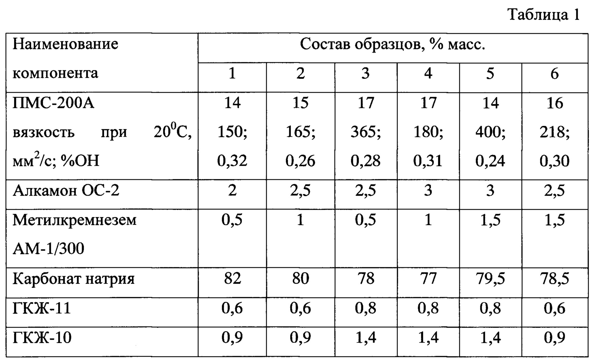 Из данных, приведенных в таблице 2 видно, что в образцах 1-6 пеногасящие свойства лучше, чем пеногасителя по прототипу.