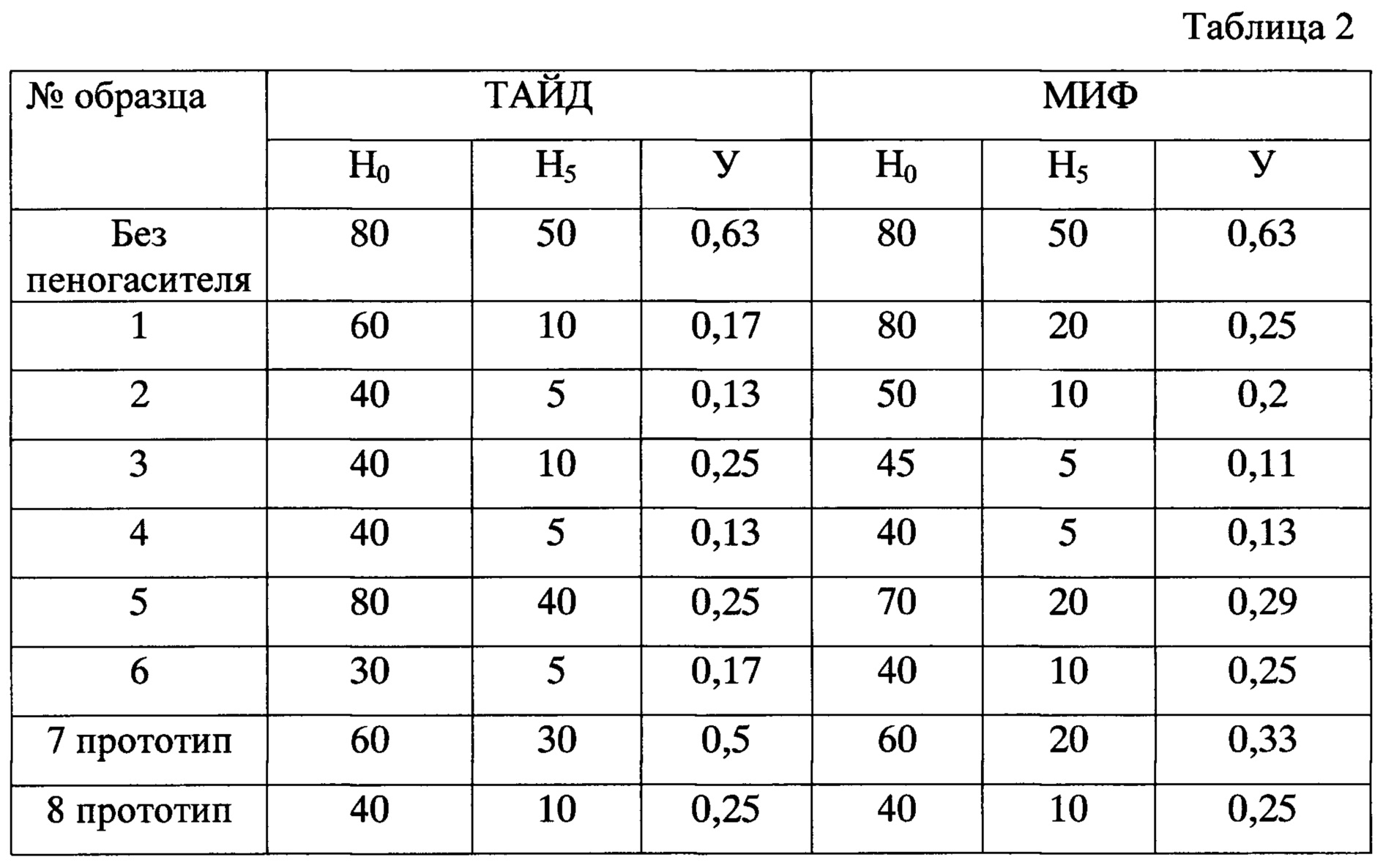 Определение пеногашения проводят следующим образом. В 10 г стирального порошка для ручной стирки с неконтролируемым пенообразованием МИФ и ТАЙД добавляют взвешенное количество силиконового пеногасителя, перемешивают и полученный состав растворяют в двух литрах водопроводной воды. В цилиндр емкостью 1000 мл и диаметром 60 мм устанавливают делительную воронку, длина трубки которой составляет 165 мм, конец трубки воронки устанавливают в цилиндре на отметке 900 мл. При температуре 25°С в цилиндр наливают 50 мл, а в делительную воронку 200 мл исследуемого раствора по стенке, чтобы избежать вспенивания. Открывают кран воронки и сливают раствор в центр цилиндра. По истечении всего раствора замеряют объем образовавшейся пены в мл (Н0) с точностью до половины деления цилиндра, затем через 5 минут (Н5) проводят замер объема пены и рассчитывают устойчивость пены У=Н50. Для стиральных порошков, используемых в автоматических стиральных машинах, устойчивость пены не должна превышать 0,3. Результаты расчета устойчивости пены приведены в таблице 2.