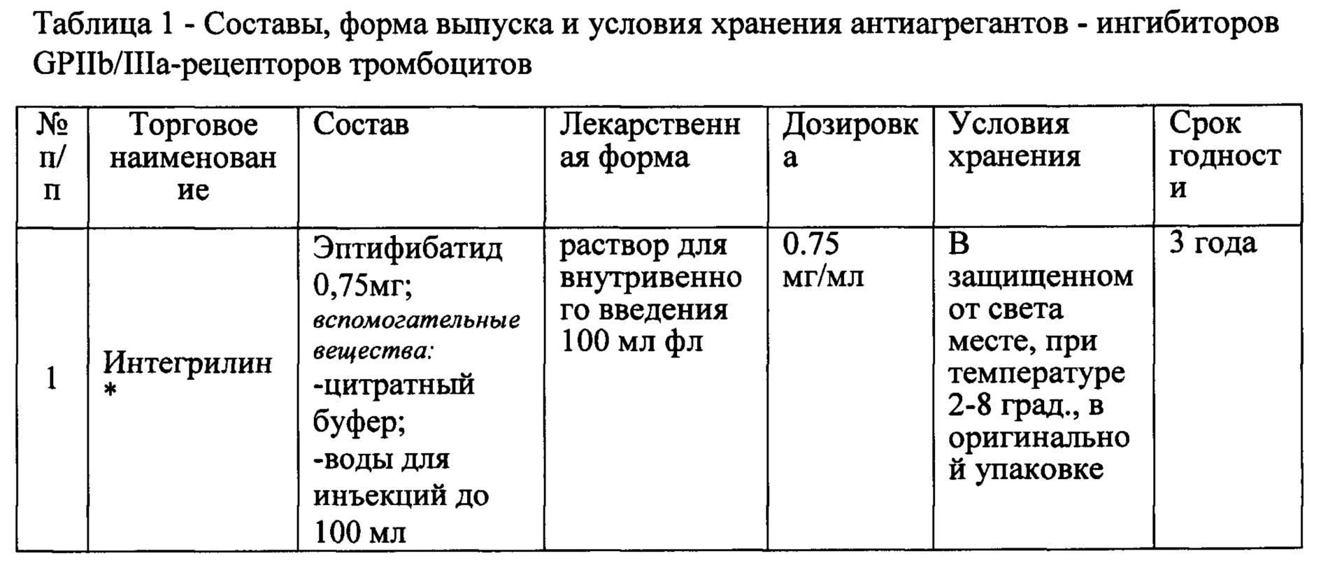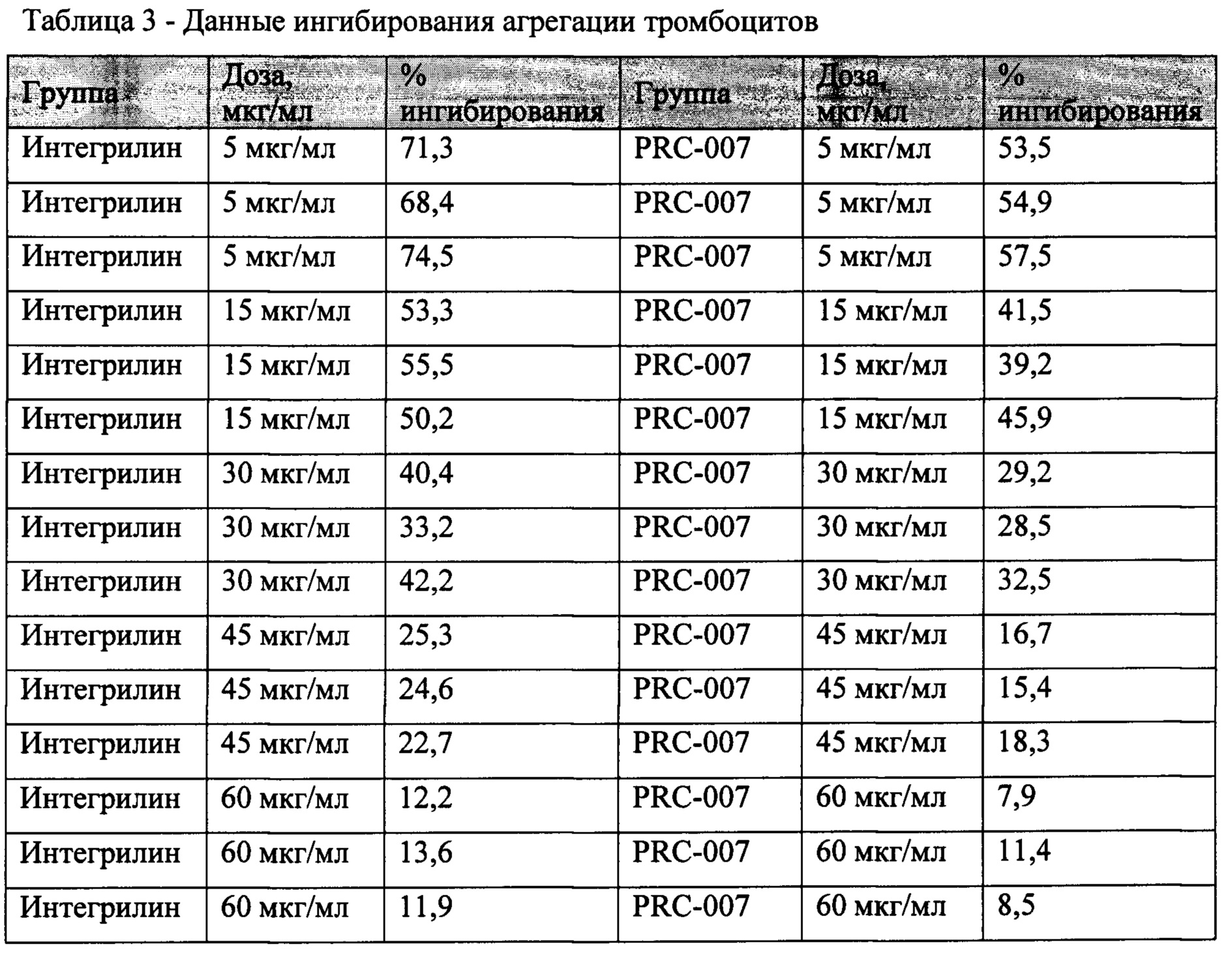 Изобретение относится к фармацевтической композиции, а именно к раствору для внутривенного введения, содержащего в качестве активного вещества гетеропептид Fur-Lys-His-Ala-Asp-Asp, где «Fur» - карбоксиметилимидазо[4,5-е]бензо[1,2-с;3,4-с'] дифуроксан, а в качестве вспомогательных лимонной кислоты моногидрат, натрия гидроксида 1М или 2М раствор для доведения рН до 5,35 и воду для инъекций для применения в качестве антиагреганта-ингибитора GPIIb/IIIa-рецепторов тромбоцитов. Одной из наиболее актуальных проблем современной медицины продолжают оставаться тромбозы и тромбоэмболии, которые играют ключевую роль в развитии различных сердечно-сосудистых осложнений. Тромбоэмболизм в его современной трактовке - это заболевание, характеризующееся тромбообразованием на стенке вен или артерий с сужением или «закупоркой» их просвета в результате роста тромба или перемещения его фрагментов дистальнее кровотока. Определяющую роль в нарушении реологических параметров крови играет агрегационное состояние тромбоцитов и эритроцитов. В настоящее время в качестве средств профилактики тромбообразования применяются лекарственные препараты, оказывающие влияние на разные звенья системы гемостаза, как раздельно, так и в различных сочетаниях. При этом неотъемлемой частью патогенетической терапии заболеваний сердечно-сосудистой системы является именно антиагрегационная терапия. Из дезагрегантов к наиболее известным, применяемым в практической медицине, относятся ацетилсалициловая кислота, клопидогрель, тиклопидин, дипиридамол (курантил), бутадион, антуран, индометацин (метиндол), папаверин, клофибрат, пармидин и др. Данные средства уменьшают функциональную активность тромбоцитов, в первую очередь - их способность к агрегации. Механизмы действия антиагрегантов обусловлены способностью препаратов нарушать метаболизм арахидоновой кислоты, повышать внутриклеточный уровень циклического АМФ (цАМФ), изменять состояние цитоплазматической мембраны тромбоцитов и др. Блокада агрегации может быть достигнута за счет ингибирования эффектов тромбоксана А2 (ингибитор циклооксигеназы - ацетилсалициловая кислота), АДФ (блокаторы АДФ-рецепторов - тиенопиридины - клопидогрель и тиклопидин) или нейтрализацией IIb/IIIa гликопротеиновых рецепторов тромбоцитов (антагонисты IIв/IIIa гликопротеиновых рецепторов - абциксимаб, эптифибатид и тирофибан). Таким образом, профилактика тромбозов и тромбоэмболий, являющихся ключевым моментом в развитии сердечно-сосудистых патологий, с помощью антиагрегантных препаратов является определяющим направлением в лечении больных в терапевтической и хирургической практике [2-6]. Ингибиторы гликопротеиновых рецепторов IIb/IIIa абциксимаб, эптифибатид и тирофибан неконкурентно блокируют конечный путь агрегации, который заключается в перекрестном связывании гликопротеиновых рецепторов тромбоцитов под влиянием фибриногена [Алексеев, А.А. Пептидные ингибиторы агрегации тромбоцитов: математическое моделирование, синтез и оценка специфической активности новых соединений в условиях in vitro /А.А. Алексеев, М.И. Брылев, В.Л. Королев [и др.] //Бутлеровские сообщения. - 2012. - Т. 32. - №11. - С. 96-100]. Обладая умеренным влиянием на последний этап гемостаза - фибринолиз, они также предотвращают связывание первичного тромба с этим адгезивным протеином. Быстрота н