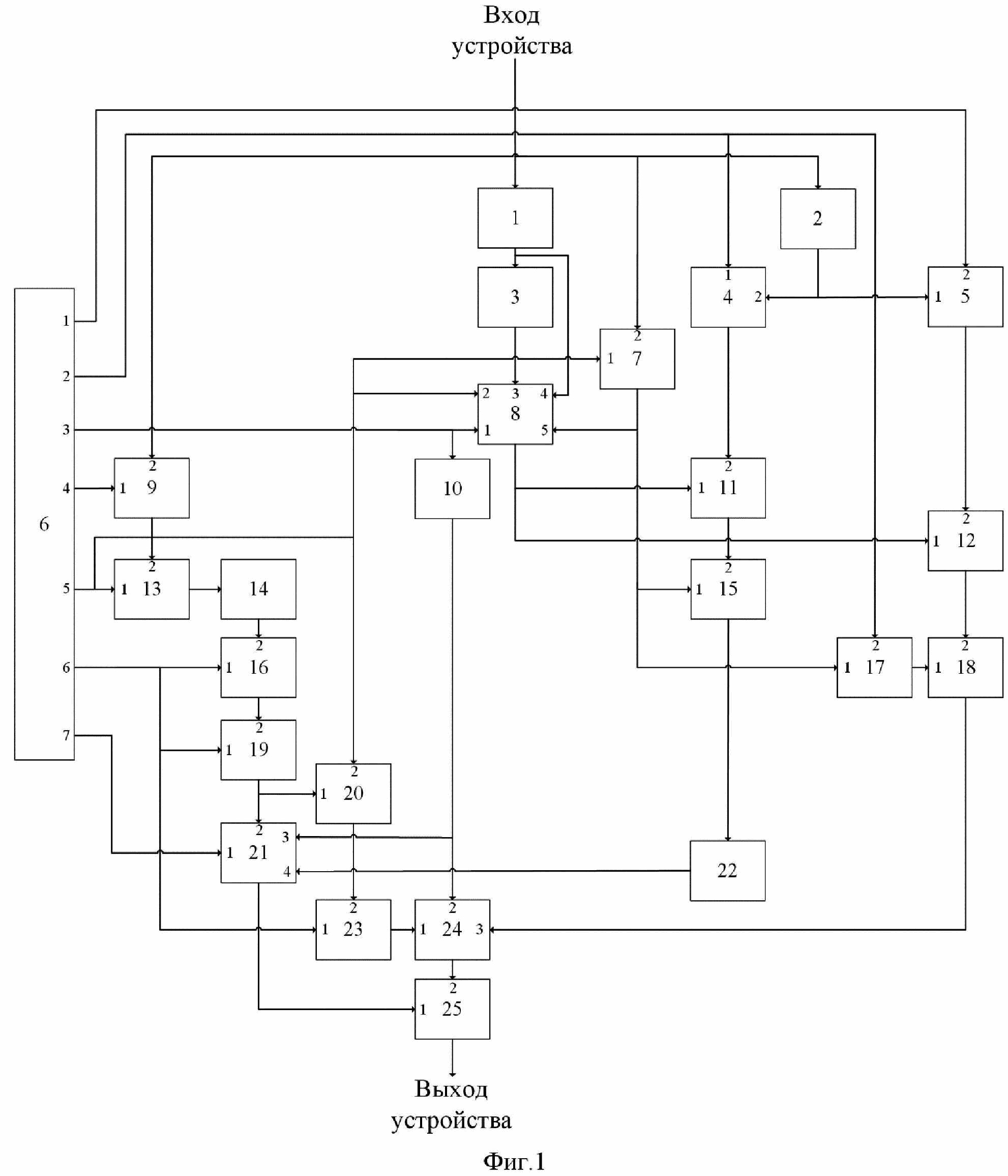 Изобретение относится к области радиоавтоматики и может быть использовано в радиотехнических устройствах и системах связи различного назначения для повышения стабильности частот и синхронизации приемной и передающей аппаратуры. Известны различные модификации устройств контуров фазовой автоподстройки частоты (ФАПЧ). Все они представляет собой следящую систему автоматического регулирования с одним «входом», одним «выходом» и однопетлевой обратной связью, где объектом регулирования является подстраиваемый генератор. При построении таких систем основное внимание уделяют решению проблемы определения условий устойчивости требуемого режима, а также качественных характеристик процесса его установления. Наиболее близким по технической сущности к заявленному изобретению является устройство фазовой автоподстройки частоты (ФАПЧ) [Патент RU № 2547635, МПК H03L 7/06, опубл. 10.04.2015], где ЭГ – эталонный генератор, УЭ – управляющий элемент, ПГ – подстраиваемый генератор, ФД – фазовый детектор, ФНЧ – фильтр нижних частот. Недостаток прототипа – один релейный режим функционирования, который требует высоких энергетических затрат на синхронизацию. Технической задачей изобретения является снижение энергозатрат при фазовой синхронизации по критерию быстродействия за счет увеличение числа режимов функционирования. Указанная техническая задача достигается за счет реализации устройства контура фазовой автоподстройки частоты с обратной связью на основе объединенного принципа максимума. На Фиг. 1 изображена схема многорежимного устройства синхронизации с адаптацией. На Фиг. 2, 3 представлены результаты математического моделирования. Устройство синхронизации содержит блок формирования задержки 1; блоки формирования модуля 2, 3; блок хранения констант 6; блоки формирования произведения 4, 7, 8, 13, 17, 20, 21, 24; блоки формирования суммы 5, 9, 15, 16, 18, 23, 25; блок возведения в степень «-1» 10; блоки формирования отношения 11, 12, 19; блок формирования экспоненты 14; блок формирования функции sign 22. Результаты математического моделирования приведены на фигурах 2, 3, где сплошной линией обозначены кривые, соответствующие управлению (6) с функциями принадлежности (7), пунктирной линией кривые, соответствующие оптимальному решению Л.С. Понтрягина, а точками кривые, соответствующие управлению (6) с функциями принадлежности (8). Сущность изобретения поясняется чертежом, где на фиг. 1, представлено устройство контура фазовой автоподстройки частоты с обратной связью на основе объединенного принципа максимума, при этом вход устройства соединен со вторым входом блока 9 формирования суммы, со входом блока 2 формирования модуля, вторым входом блока 7 формирования произведения и входом блока 1 формирования линии задержки, выход которого соединен с четвертым входом блока 8 формирования произведения и входом блока 3 формирования модуля, выход которого соединен с третьим входом блока 8, выход которого соединен с первым входом блока 12 формирования отношения и первым входом блока 11 формирования отношения, выход которого соединен со вторым входом блока 15 формирования суммы, выход которого соединен со входом блока 22 формирования функции sign, выход которого соединен с четвертым входом блока 21 формирования произведения, выход которого соединен с первым входом блока 25 формировани