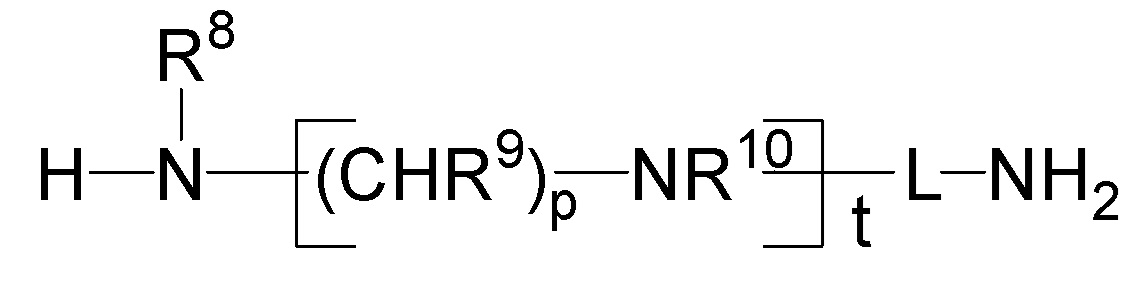 , где q представляет собой по меньшей мере 3.Продукт реакции Реагент A Реагент B Количество молей A Количество молей B NTU Холостая проба NTU Продукт NTU Время Доза (ч./млн.) A TETA GE-7 1 1 758 123 300' 100 B TEPA GE-7 2 1 1000 54 120' 100 C TEPA GE-7 1 1 1000 142 120' 100 D TEPA GE-7 1 2 1000 334 120' 100 E TEPA Октил-Cl 2 1 173 162 40' 100 F TEPA Додецил-Br 2 1 852 93 70' 500 G TEPA 2-EHGE 2 1 852 80 70' 500 H E-100 GE-7 1 1 1000 161 45' 100 I E-100 TOFA (XTOL) 2 1 900 22 60' 100 TRIAMEEN-T DPTA TA Неприменимо Неприменимо 921 477 330' 100 DUOMEEN-O PDA Олеил Неприменимо Неприменимо 667 137 300' 1000 J EPOMIN SP-003 (MW 300) GE-7 1 1 -- -221 150 10 K " " 1 2 -- -217 150 10 L " " 1 1 -- -457 150 50 M " " 1 1 --- -238 1200 100 N EPOMIN SP-006 (MW 600) GE-7 1 1 -- -157 150 10 O " " 1 1 -- -471 150 50 P " " 1 1 -- -239 1200 100