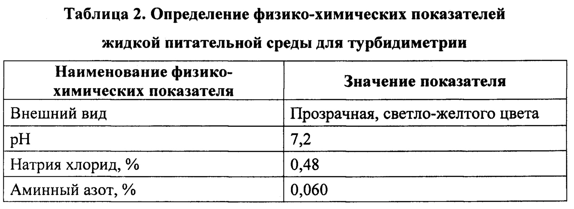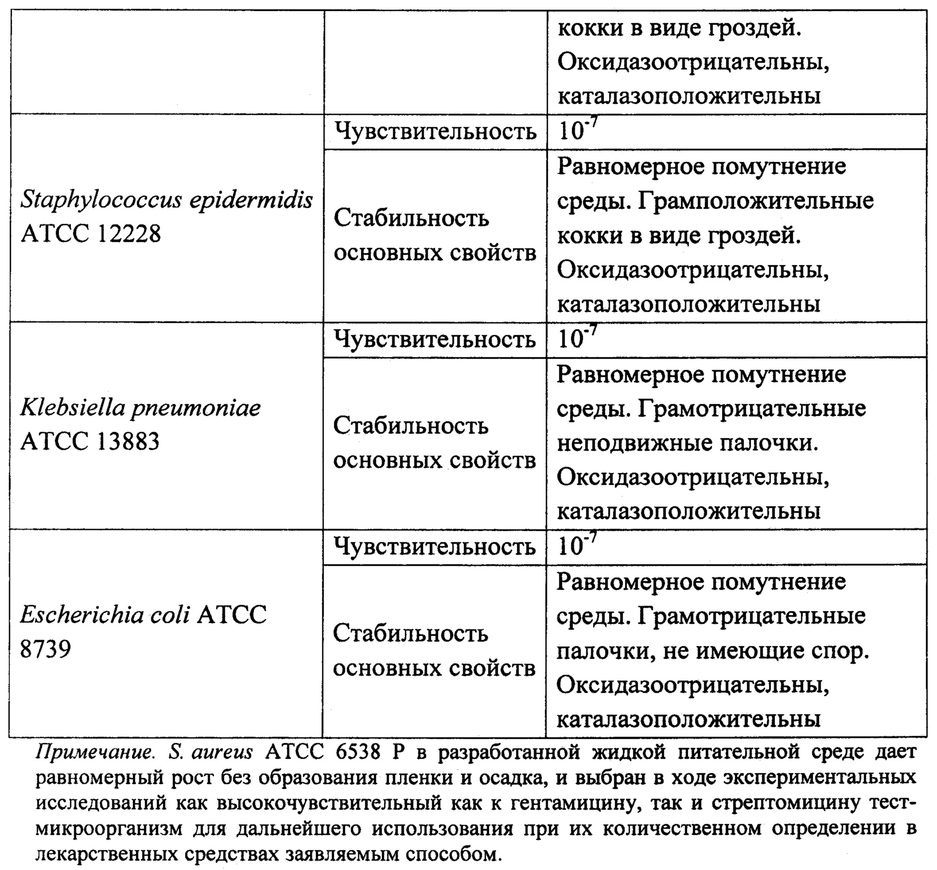 Группа изобретений относится к медицине и фармацевтической микробиологии, в частности к способам количественного определения гентамицина и стрептомицина в лекарственных средствах, а также к питательным средам для турбидиметрии, и может быть использована при определении активности лекарственных средств на основе гентамицина и стрептомицина как в процессе их производства для оценки качества при выпуске, так и в ходе их исследований с целью подтверждения соответствия требованиям нормативной документации. Антибиотики являются одной из наиболее широко востребованных групп лекарственных средств, находящих применение в различных областях клинической медицины. Одной из первых групп антибиотиков, введенных в медицинскую практику, является группа аминогликозидов. Среди аминогликозидных антибиотиков к числу наиболее важных в практическом отношении относятся гентамицин и стрептомицин. Оценивая место и значение гентамицина и стрептомицина в современной антибиотикотерапии бактериальных инфекций, необходимо отметить, что лекарственные средства на их основе по-прежнему остаются препаратами выбора, предназначенными для лечения тяжелых форм инфекционно-воспалительных заболеваний, вызываемых чувствительными к ним микроорганизмами. Гентамицин чаще всего используют при инфекциях, вызываемых возбудителями, устойчивыми к другим антибиотикам широкого спектра действия. Комбинация гентамицина с β-лактамными и гликопептидными антибиотиками позволяет получить синергетический эффект и повышение бактерицидной активности против штаммов синегнойной палочки, энтеробактерий, фекальных стрептококков. Лекарственные препараты на основе гентамицина находят применение в офтальмологии (в виде глазных капель), эффективны при инфекционных поражениях мочевыводящей системы. Часто гентамицин применяют местно в форме крема или растворов для лечения инфицированных ран, ожогов и кожных повреждений. Лекарственные препараты на основе стрептомицина используют в комбинированной терапии туберкулеза. Стрептомицин обладает эффективным действием в отношении некоторых особо опасных высококонтагиозных моноинфекций (чума, туляремия, бруцеллез) [1, 2]. Вместе с тем, учитывая достаточно серьезные нежелательные реакции (ото- и нефротоксичность, нейромышечная блокада), которые могут возникнуть в результате передозировки гентамицина и стрептомицина, а также особую осторожность при использовании противомикробных препаратов из-за стремительного распространения антибиотикорезистентности микроорганизмов в результате применения некачественных антибиотиков и неизбирательного их использования, необходимо особое внимание уделять вопросам обеспечения качества антибактериальных препаратов [1]. Одним из основных показателей качества антибиотиков является их количественное определение. В настоящее время известны различные методы количественного определения гентамицина и стрептомицина в лекарственных средствах на их основе: физико-химические методы - спектральные, хроматографические, электрохимические; биологические - метод диффузии в агар, метод серийных разведений, турбидиметрический метод. Среди спектральных методов известен флуориметрический метод определения гентамицина в липосомальной форме. Способ основан на реакции между