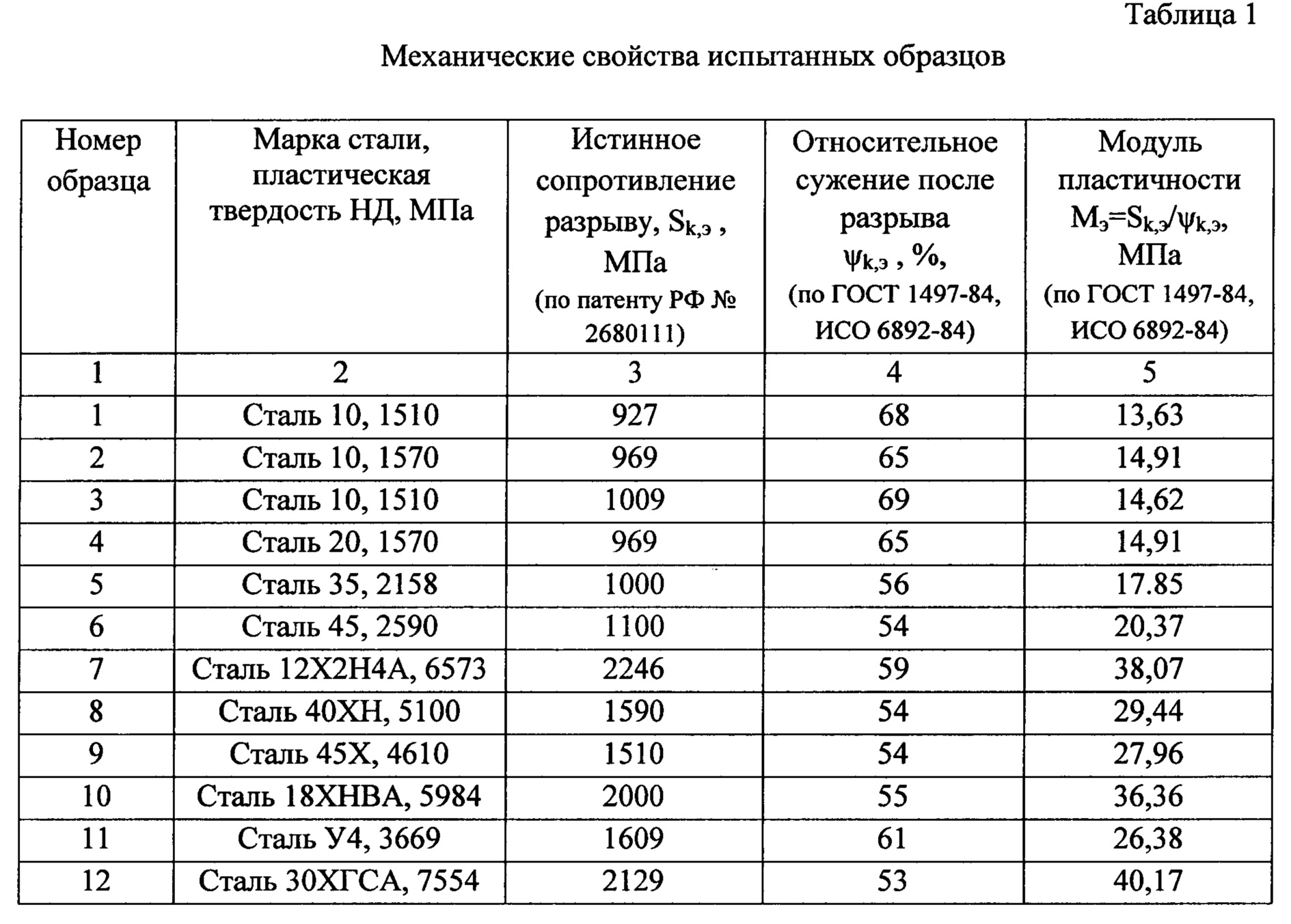 Способ определения относительного сужения после разрыва, заключающийся в том, что испытуемый материал нагружают посредством сферического индентора нагрузкой, находящейся в диапазоне, соответствующем измерению твердости, измеряют размеры отпечатка и определяют относительное сужение после разрыва, отличающийся тем, что измеряют пластическую твердость НД испытуемого материала, определяют модуль пластичности М испытуемого материала по формуле с последующим определением относительного сужения после разрыва с учетом истинного сопротивления разрыву Sk испытуемого материала по зависимости где ψk - относительное сужение после разрыва испытуемого материала (%); Sk - истинное сопротивление разрыву испытуемого материала (МПа); НД - пластическая твердость испытуемого материала (МПа); a, b - коэффициенты, зависящие от химического состава испытуемого материала.