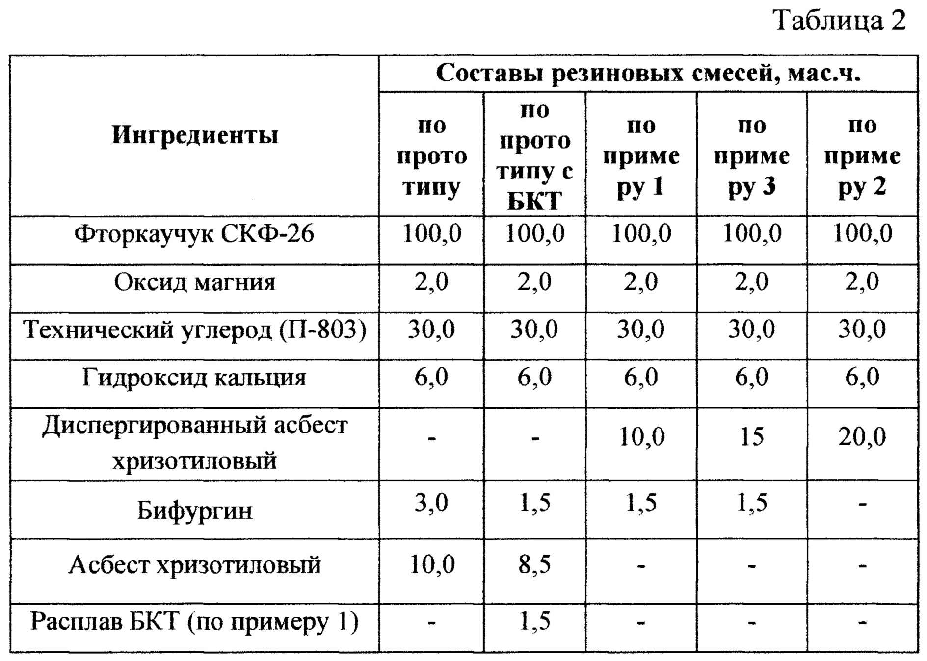 1. Резиновая смесь на основе фторкаучука СКФ-26, содержащая 100 мас. ч. фторкаучука СКФ-26, 30 мас. ч. технического углерода, 2 мас. ч. оксида магния, 6 мас. ч. гидроксида кальция и целевые добавки, включающие асбест и вулканизующий агент бифургин, отличающаяся тем, что резиновая смесь содержит 10-20 мас. ч. целевых добавок, а в качестве целевых добавок используют асбест хризотиловый, диспергированный в расплаве бифургина с ε-капролактамом и триметилолпропаном, при следующем соотношении компонентов, мас. %: 2. Резиновая смесь по п. 1, отличающаяся тем, что дополнительно содержит 1,5 мас. ч. бифургина.Асбест хризотиловый 85,00-93,00 Бифургин 0,77-1,43 ε-Капролактам 2,10-4,90 Триметилолпропан 4,13-8,67
