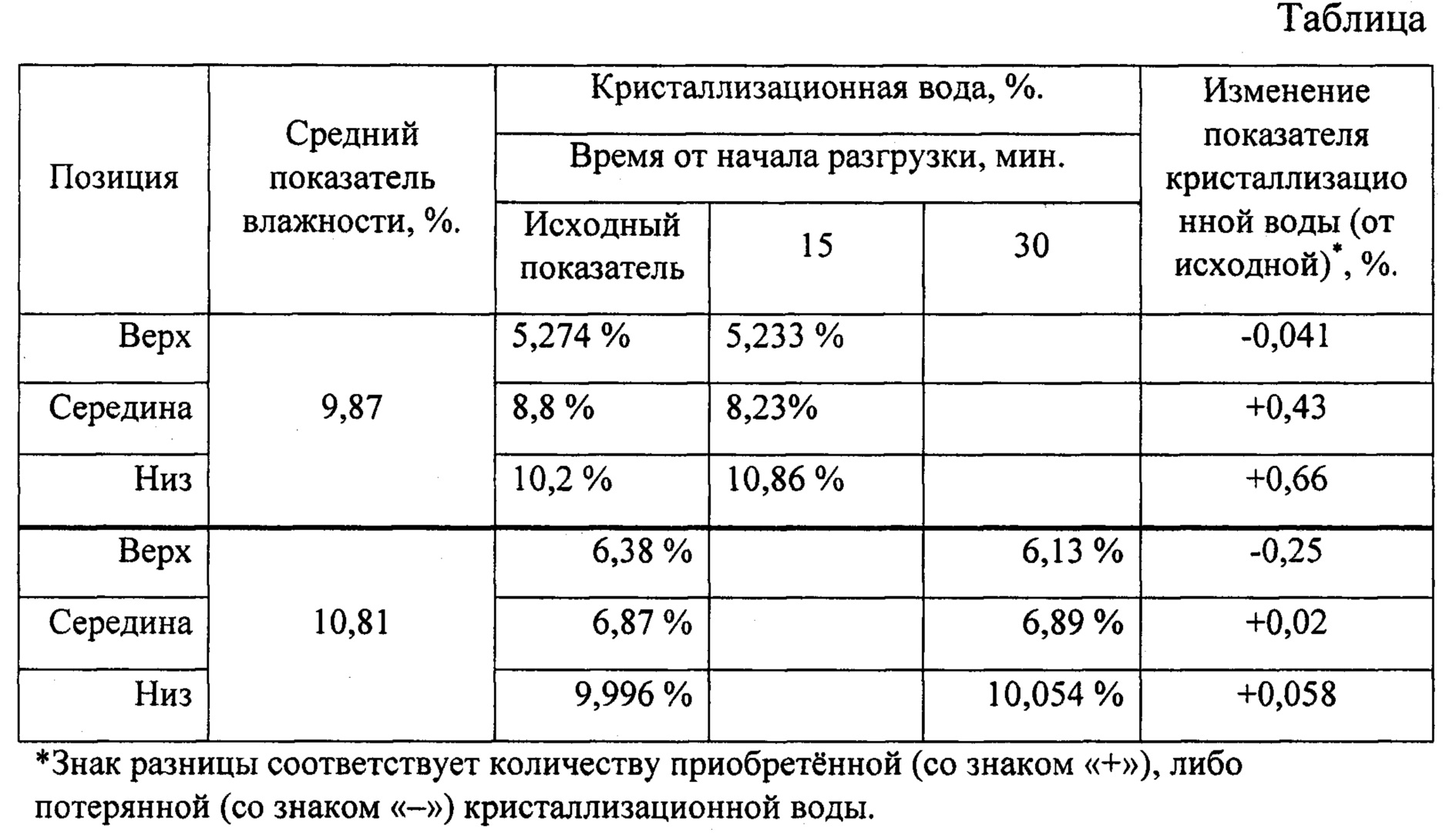 Определение содержания кристаллизационной воды измерялось на 3-х этапах: сразу после разгрузки автоклава (исходный показатель), через 15 минут (с момента разгрузки; в условиях атмосферного воздействия) и через 30 минут (с момента разгрузки; в условиях атмосферного воздействия). Данные приведены в таблице, представленной ниже.