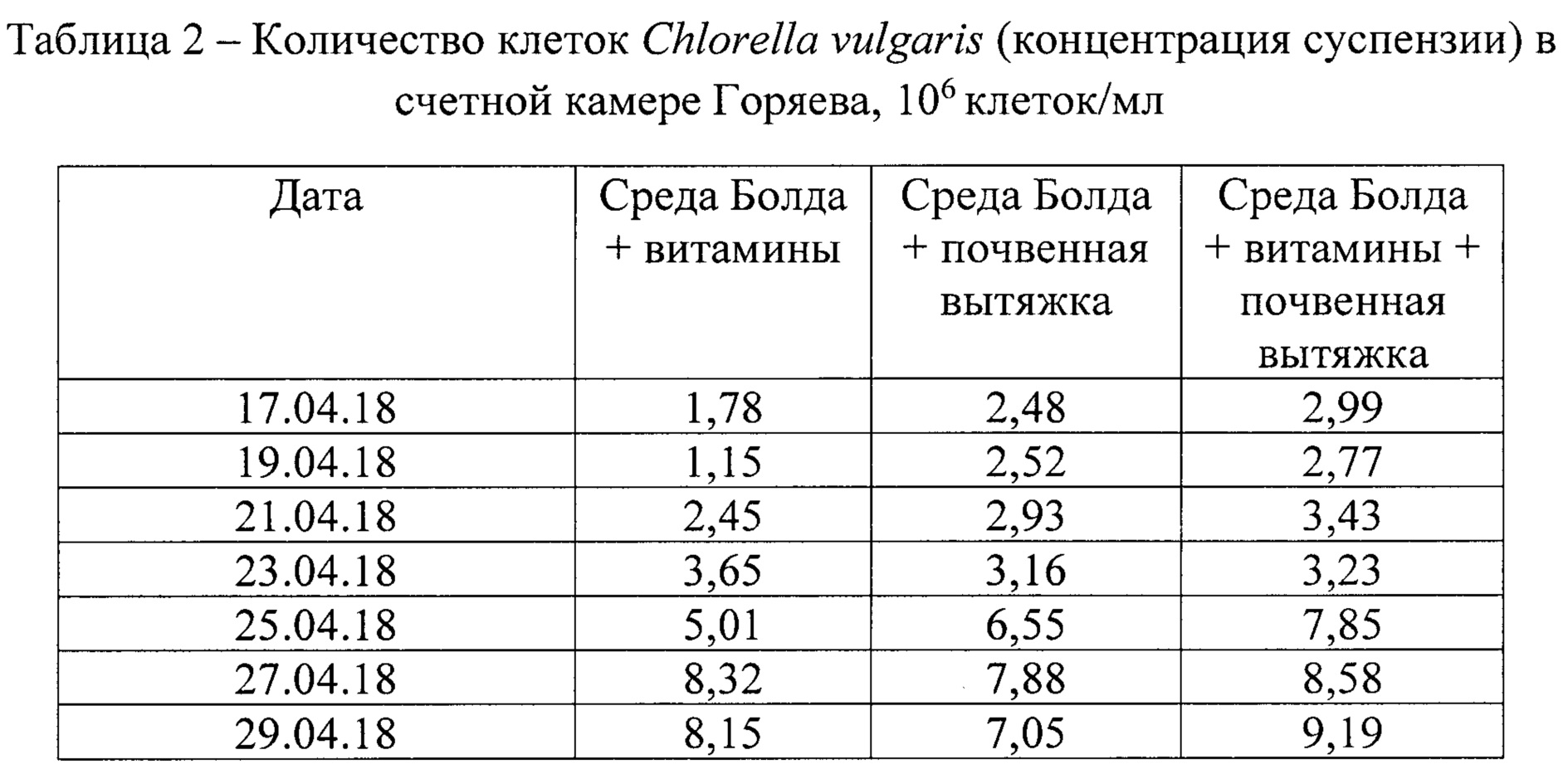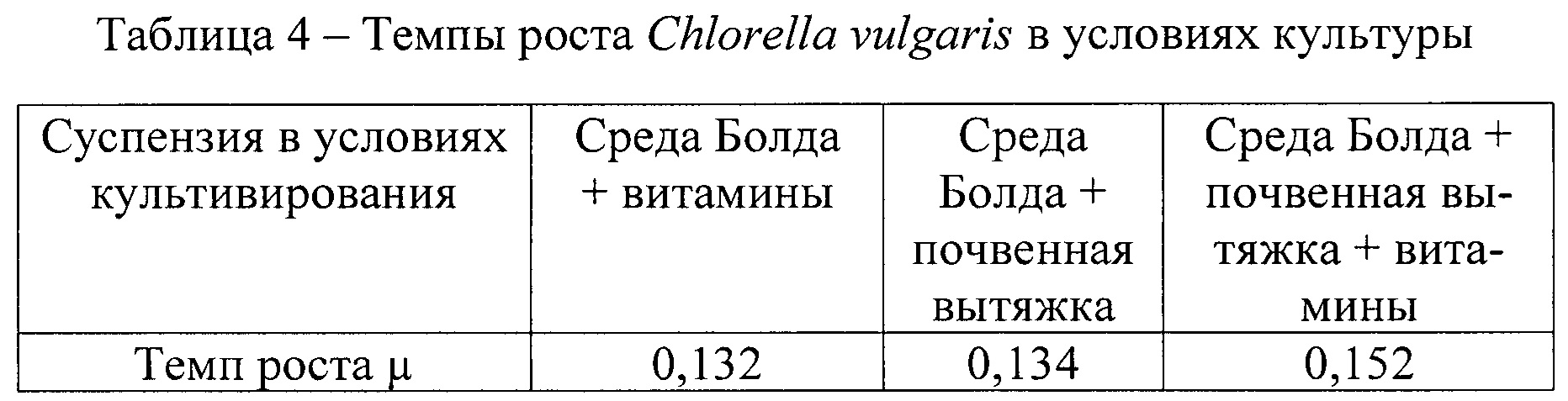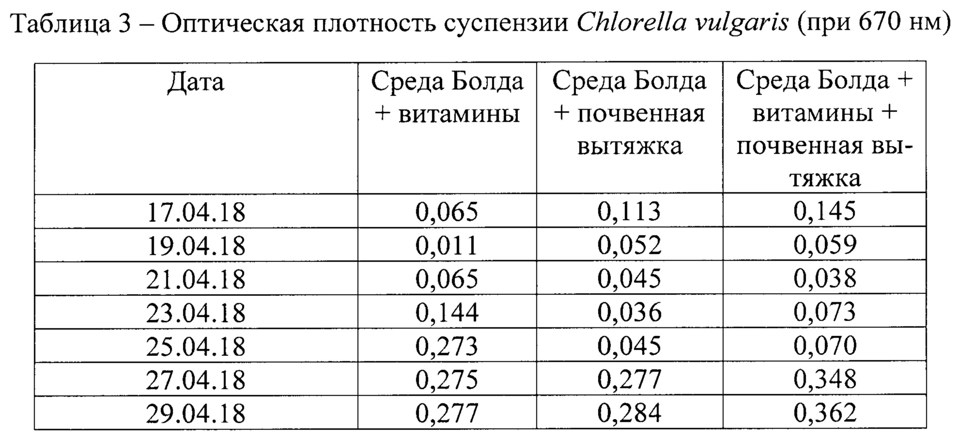 Изобретение относится к биотехнологии и может использоваться для промышленного получения водоросли Chlorella vulgaris. Питательная среда включает компоненты основной питательной среды Болда, почвенную вытяжку, витамины В1 и В12 в заданном соотношении. Изобретение позволяет увеличить концентрацию суспензии, оптическую плотность и темпы роста Chlorella vulgaris. Для промышленного производства микроскопических водорослей, в том числе и Chlorella vulgaris, требуется создание благоприятных условий для их роста. Для выращивания водорослей необходимо поддержание оптимального уровня освещения и температуры, концентрации углекислого газа, а также перемешивание. Для достижения максимального прироста водоросли необходимо подобрать оптимальную питательную среду, которая удовлетворяет физиологические потребности водоросли. Питательная среда по своему составу должна максимально воспроизводить условия, в которых вид обитает в природе. Питательные среды, используемые для культивирования Chlorella vulgaris, содержат макро- и микроэлементы, которые обеспечивают нормальную жизнедеятельность клеток. Для выращивания хлореллы используется среда Тамия (Tamiya, 1957). Одной из особенностей выращивания водоросли в данной среде является нехватка азота и повышенная концентрация калия, что ведет к подщелачиванию среды. Чтобы избежать подобного явления рекомендуется применить мочевину как источник азота. Так было выяснено, что для среды Тамия, содержащей нитратный азот, характерно присутствие повышенных концентраций серы и магния. С целью устранения недостатков среды Тамия была разработана среда №3, для которой были характерны тот же прирост биомассы, что и у среды Тамия с нитратным азотом и ниже на 1% в отличие от среды Тамия с мочевиной (Мещерякова, 2016). Однако среда №3 дает меньший прирост биомассы хлореллы, чем среда Тамия. Также известна питательная среда для выращивания хлореллы на основе среды Тамия с добавлением аммофоса, калимагнезия и хлорного железа (SU 506962). Для выращивания хлореллы используется также среда Бенеке (Wijanarko, 2011). Установлено, что среда Бенеке, содержащая нитрат калия, является оптимальной для накопления липидов до 0,42 г/г биомассы. В случаях применения мочевины как источника азота, рост клеток снижался на 30%, однако при этом происходило увеличение содержание белка в клетках водоросли. Было установлено, что использование для среды сточных вод с аммиаком увеличивает скорость роста хлореллы на 55-60%, а внутриклеточные липиды увеличиваются на 8,5%. Группа ученых с П. Хелд изучала возможности культивирования хлореллы на питательных средах BG-11, ТАР и ТР. Прирост числа клеток в среде TP был ниже, чем в среде ТАР в 1,7 раз, а прирост биомассы в среде BG-11 был ниже, чем в среде ТАР в 16 раз (Дворецкий и др., 2015). К недостаткам питательных сред Тамия с модификациями, Бенеке, BG-11, ТАР и TP относится относительно низкий темп прироста биомассы. Следует отметить, что все перечисленные выше питательные среды характеризуются использованием ограниченного числа микроэлементов. Это негативно сказывается на росте и жизнеспособности клеток Chlorella vulgaris. Микроэлементы особенно важны для культивирования хлореллы в течение длительного времени, так как при их нехватке со временем будет происходить угнетение их жизнеспособности и гибель. Известна также среда Люка для выращивания водор