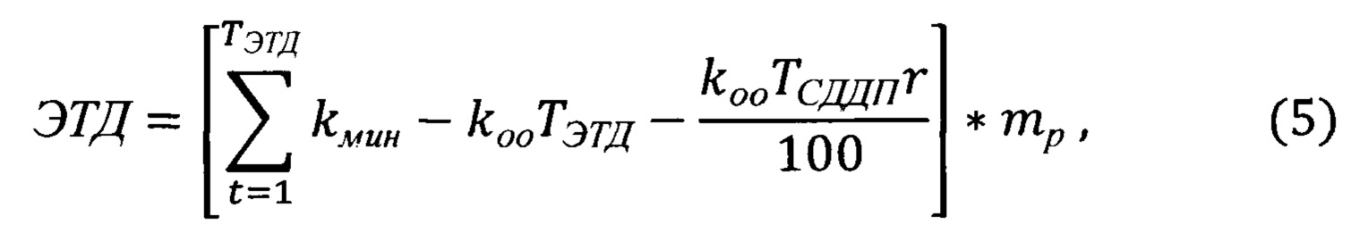 где ТЭТД - время выполнения вида деятельности, мин; ТСДДП - время, потраченное на переваривание пищи во время выполнения определенного вида деятельности, в обычных условиях ТСДДПЭТД, если человек питается равномерно в течение дня, мин., а определение суммарных энергозатрат (ЭТ), затрачиваемых организмом человека осуществляют по формуле:
