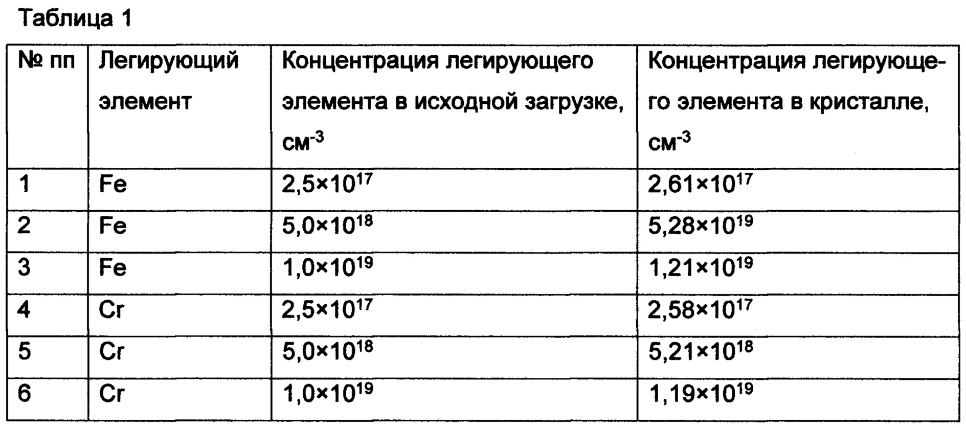 Изобретение относится к области выращивания кристаллов. Кристаллы сульфида цинка, легированные железом или хромом применяются для изготовления пассивных модуляторов в резонаторах лазеров ближнего инфракрасного диапазона, а также для изготовления активных элементов таких лазеров. Известен способ легирования кристаллов селенида цинка и сульфида цинка железом [S. Mirov, A. Gallian, A. Martinez, V. Fedorov. Saturable absorbers for Q- switching of middle infrared laser cavities. Patent Application Publication US 2080101423 A1] - аналог, в котором на поверхность кристаллического ZnSe или ZnS наносится пленка железа, а собственно легирование производится путем диффузионного отжига. К недостаткам этого способа можно отнести неоднородное распределение легирующей добавки по толщине изделия, характерное для диффузионных методов легирования, а также сложность многостадийного процесса, включающего рост кристалла, нанесение пленки железа и собственно диффузионное легирование. Известен способ легирования кристаллов халькогенидов цинка хромом или железом [С.С.Балабанов, Е.М. Гаврищук, В.Б. Иконников, С.А. Родин, Д.В. Савин. Способ получения легированных халькогенидов цинка. Международная заявка WO 2016024877 А1]-прототип, в котором на поверхность халькогенида цинка наносят пленку хрома или железа, затем на этой пленке формируют слой халькогенида цинка методом химического осаждения из газовой фазы и полученную трехслойную структуру подвергают диффузионному отжигу. Основной недостаток этого способа - неоднородное распределение легирующей добавки по толщине изделия, характерное для диффузионных методов легирования. В легированных железом кристаллах сульфида цинка, полученных по способу-прототипу, отношение текущей концентрации металла (железа или кобальта) Сme к максимальной Сmax меняется на два порядка от края изделия к его середине даже при небольшой (5-8 мм) толщине изделия. К недостаткам способа-прототипа следует отнести и сложность многостадийного процесса. Задачей предлагаемого решения является создание способа легирования кристаллов сульфида цинка железом или хромом, в котором распределение легирующей добавки в кристалле является однородным. Поставленная задача решается в предлагаемом способе легирования кристаллов сульфида цинка железом или хромом за счет того, что легирующий металл добавляют в порошок сульфида цинка в виде порошка моносульфида железа или моносульфида хрома, а затем проводят выращивание кристалла вертикальной зонной плавкой. Введение легирующих добавок в виде моносульфидов металлов обеспечивает валовое содержание железа или хрома в кристаллах совпадающее с содержанием добавок в исходной загрузке, что подтверждается данными, приведенными в Таблице, где концентрация Fe и Сr во всех случаях измерена в центре кристалла (как по длине, так и по радиусу). Это обусловлено близкими скоростями испарения ZnS, FeS и CrS, что предотвращает концентрирование или разбавление лигатуры в процессе роста за счет потерь ZnS на испарение, характерных для роста кристаллов ZnS из расплава. Применение вертикальной зонной плавки позволяет выращивать кристаллы без радиального распределения легирующей добавки. При этом эффективные коэффициенты распределения железа, хрома и кобальта при вертикальной зонной плавке невелики, что обеспечивает не более чем двукратное изменение концентрации по длине крист