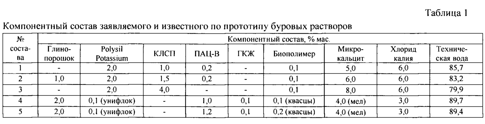 1. Ингибирующий буровой раствор на водной основе, используемый, преимущественно, для строительства горизонтальных скважин в интервалах неустойчивых терригенных отложений, включающий многофункциональный реагент полимерсиликатный POLYSIL Potassium, содержащий в своем составе высокомодульные силикаты натрия и калия, высокомолекулярный полимер акрилового ряда и модифицированный битум, а также комплексный реагент-стабилизатор буровых растворов карболигносульфонат пековый КЛСП, содержащий в своем составе омыленный каустической содой талловый пек, лигносульфонат и карбоксиметилцеллюлозу, и дополнительно включающий ксантановый биополимер, хлористый калий, микрокальцит и воду при следующем соотношении ингредиентов, мас.%: 2. Буровой раствор по п. 1, отличающийся тем, что он дополнительно содержит глинопорошок бентонитовый 1,0-2,0 мас.%. 3. Буровой раствор по п. 1, отличающийся тем, что он дополнительно содержит полианионную целлюлозу низковязкую или высоковязкую 0,1-0,4 мас.%.Реагент полимерсиликатный POLYSIL Potassium 1,0-2,0 Карболигносульфонат пековый КЛСП 1,0-4,0 Ксантановый биополимер 0,1-0,2 Калий хлористый 3,0-8,0 Микрокальцит 5,0-10,0 Вода Остальное