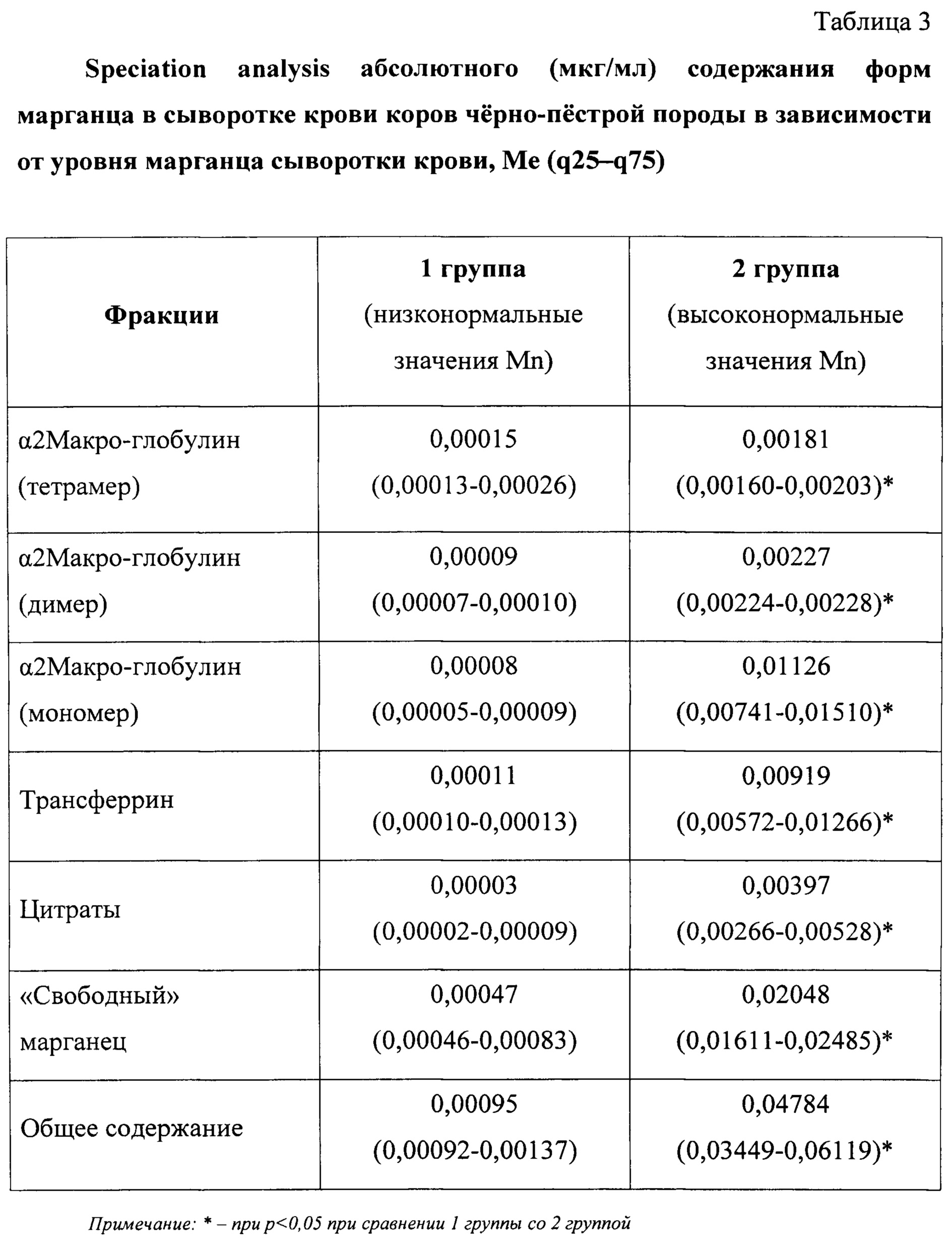 Изобретение относится к области животноводства, в частности к молочному скотоводству и может быть использовано для ранней оценки молочной продуктивности на основании данных анализа спектра металло-лигандных форм марганца сыворотки крови коров. Изучение элементного статуса организма является важным инструментом многих исследований, так как в здоровом организме гомеостаз всех металлов жестко контролируется, а его нарушение является причиной или следствием многих изменений, например, снижения продуктивности молочных коров [1]. Изменение молочной продуктивности может возникнуть в результате не только дефицита или избытка определенного элемента, но и из-за взаимодействия между различными ионами металлов и наличия металлосвязывающих (хелатирующих) агентов. Установить данные изменения определенного микроэлемента, в частности марганца, позволяет метод анализа металло-лигандных форм (speciation analysis). Данный метод представляет собой определение относительного и абсолютного содержания нескольких химических форм в образце. Ближайшим аналогом изобретения является способ прогнозирования молочной продуктивности коров по элементному составу шерсти [2]. Данный способ включает отбор образцов шерсти коров и дальнейшую оценку концентрации )Pb и Cd методами атомно-эмиссионной и масс-спектрометрии с индуктивно связанной плазмой, при сумме молей Pb и Cd ниже 0,253 ммоль/г шерсти корову относят к группе коров с потенциально высокой молочной продуктивностью. Недостатком способа является то, что развитие методов аналитической химии привело к пониманию того, что общая концентрация химических элементов не может предоставить полную информацию об их воздействии на живые организмы. Только знание химической формы элемента может предоставить информацию о возможных химических и биохимических процессах и, таким образом, привести к большему пониманию токсичности или эссенциальности элемента [3]. По этой причине определение химической формы элемента имеет большее прикладное значение. Техническим результатом изобретения является разработка способа для ранней оценки молочной продуктивности на основании данных анализа металло-лигандных форм марганца (speciation analysis) сыворотки крови коров. Предлагаемый способ отличается использованием высокочувствительных аналитических методов (масс-спектрометрия с индуктивно-связанной плазмой с высокоэффективной жидкостной хроматографией), позволяющих выявить перераспределение марганца по различным белковым фракциям даже при изменении уровня марганца в диапазоне нормальных значений. Способ реализован следующим образом. Исследования выполнялись на клинически здоровых коровах черно-пестрой породы (n=50) разводимых в условиях одного хозяйства (СПК КПЗ «Вологодский», Вологодская область). Забор крови, объемом не менее 6 мл, осуществлялся из хвостовой вены в вакуумные пробирки с активатором свертывания крови и гелем для отделения эритроцитарной массы на 30-50 сутки после отела. Отделение сыворотки производилось путем центрифугирования образцов в течении 10 минут при скорости 1000 g. Уровень микроэлементов Cu, Fe, Mn и Zn в сыворотке крови определялся методами атомно-эмиссионной и масс-спектрометрии с индуктивно-связанной плазмой. Показатели молочной продуктивности коров оценивались по количеству белка и жира в