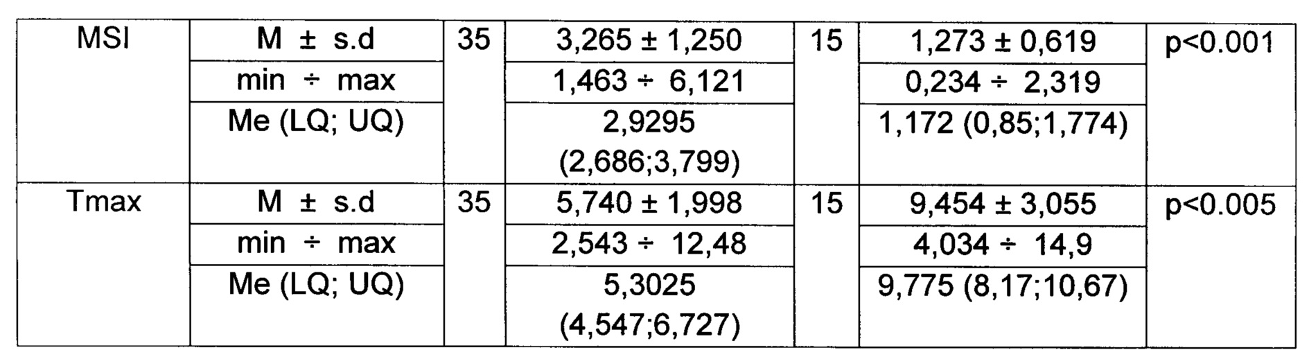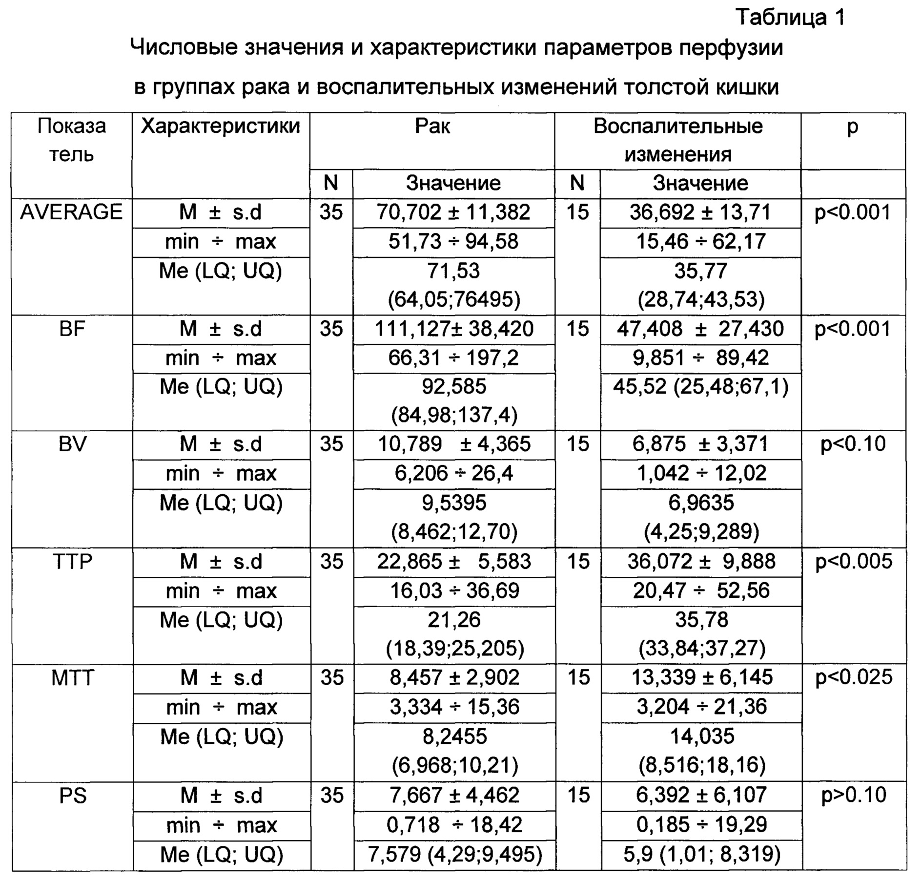 Изобретение относится к области медицины, в частности к рентгенологии, и может быть использовано для дифференциальной диагностики опухолевых и воспалительных изменений толстой кишки с применением перфузионной компьютерной томографии (ПКТ) с целью выбора тактики лечения и предоперационного планирования. В настоящее время методом выбора для лучевой диагностики патологических состояний толстой кишки является компьютерная томография (КТ) с болюсным внутривенным контрастированием. При КТ с болюсным внутривенным контрастированием колоректальный рак (КРР) и воспалительные изменения толстой кишки объединяет общий симптом - утолщение стенки кишки. В большинстве случаев сложности в диагностике возникают в условиях, когда инфильтративный опухолевый процесс ограничен стенками кишки, не распространяясь за их пределы. Ряд авторов предлагает дифференцировать эти состояния путем определения протяженности выявленных изменений, разделяя изменения на фокальные, сегментарные и диффузные [Кошелев Э.Г., Китаев С.В., Беляев Г.Ю., Егоров А.А., Штернис Т.А. Возможности компьютерной томографии в диагностике заболеваний толстой кишки. REJR 2019; 106-122]. Данная методика показывает, что в большинстве случаев фокальные изменения представлены раком толстой кишки, а диффузные изменения проявлениями колита различной этиологии. Однако недостатками метода является тот факт, что КРР так же, как и воспалительные изменения, могут носить как фокальный, так и сегментарный характер. Также сложным остается вопрос при сочетании вышеописанной патологии, когда на фоне воспалительных изменений необходимо визуализировать опухоль. Степень выраженности перифокальных изменений, определяемых при компьютерной томографии как при КРР, так и при колите может варьировать от умеренного повышения плотности параколярной жировой клетчатки до формирования инфильтратов и абсцессов, что, в свою очередь, также не может являться надежным диагностическим признаком в их дифференциальной диагностике [Бекетова О.Г., Силантьева Н.К., Березовская Т.П. Компьютерная томография в оценке глубины опухолевой инвазии рака ободочной кишки. Медицинская визуализация. 2017; 21 (1): 44-52]. Также следует учитывать, что повышение плотности параколярной жировой клетчатки может быть обусловлено как перифокальным отеком, так и десмопластической реакцией. Известен факт, что опухоли толстой кишки, осложненные перифокальным воспалением, в том числе абсцедированием, могут дебютировать с клинической картины острого воспалительного процесса [Глушков Н.И., М.Ю. Кабанов, Горшенин Т.П. Совершенствование диагностики и хирургического лечения рака ободочной кишки, осложненного перифокальным воспалением, у больных пожилого и старческого возраста // Вестник Северо-Западного государственного медицинского университета им. И.И. Мечникова. -2019. - Т.11. - №3. - С. 41-48]. Достаточно надежным методом является дифференциальная диагностика, основанная на оценке паттерна контрастирования опухолевых и воспалительных изменений толстой кишки при компьютерной томографии с внутривенным болюсным введением контрастного вещества (KB). Чаще всего при воспалительной патологии отмечается модель контрастирования по типу «мишени» или «отпечатка пальца» за счет более интенсивного контрастирования слизистой оболочки и отсутствия