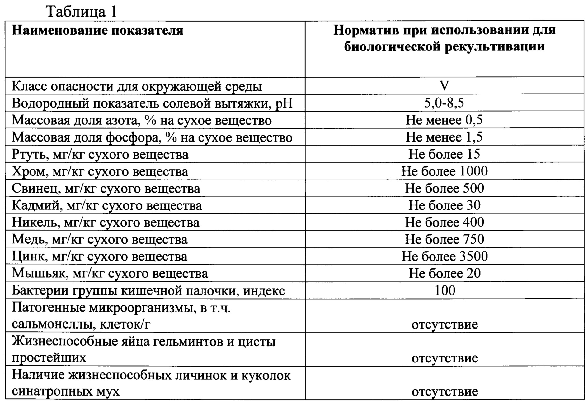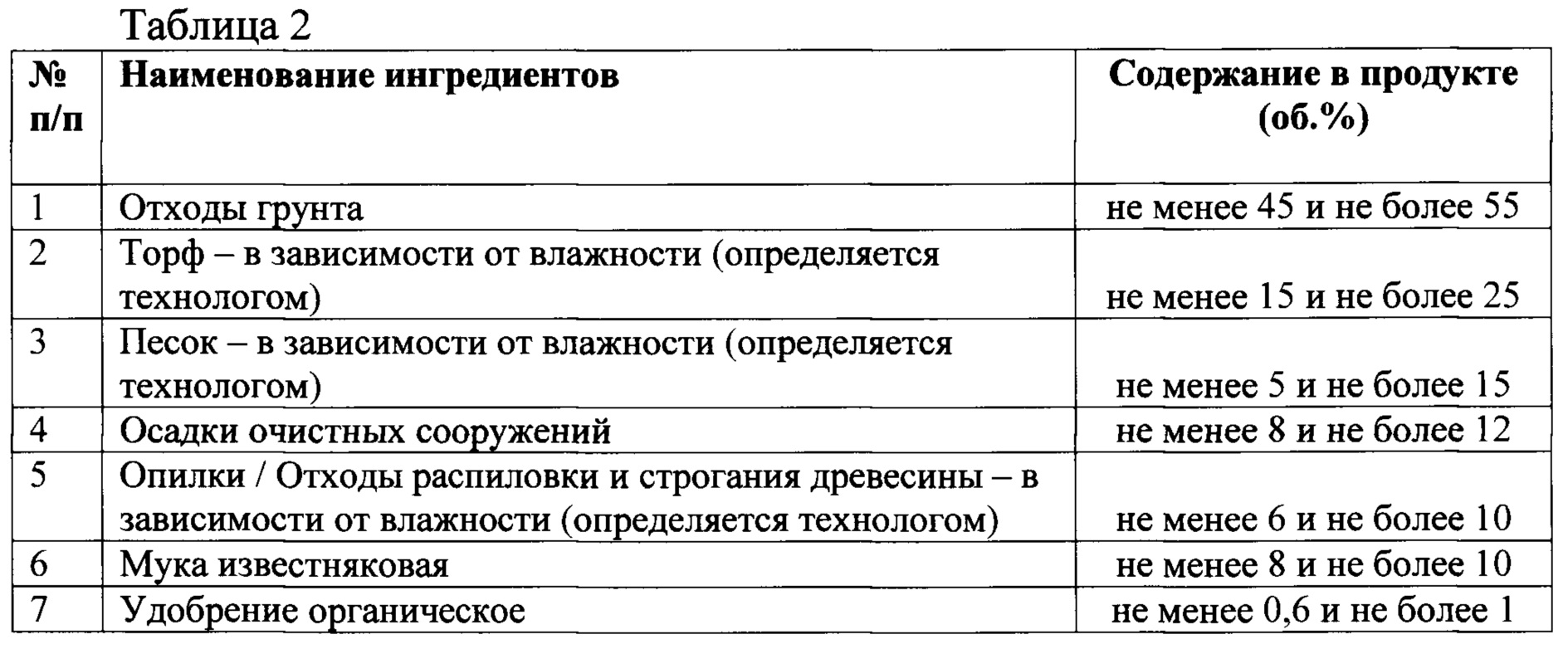 Изобретение относится к области горного дела и строительства, в частности к производству технического грунта, используемого на биологическом этапе рекультивации для восстановления нарушенных карьерными выемками земельных участков и полигонов твердых бытовых отходов, кроме территорий водосбора и зон водоохраны источников водоснабжения, в целях лесохозяйственного, природоохранного, санитарно-гигиенического и строительного направлений рекультивации. Известен технический грунт для восстановления нарушенных карьерными выемками земельных участков, состоящий из послойно уложенных в выработанное пространство карьера промышленных и строительных отходов IV и V классов опасности, обезвоженных осадков от очистки сточных вод и измельченных древесных отходов (RU 2435347 C1, А01В 79/00, 10.12.2011). Недостатком известного грунта является его неоднородность и недостаточное обеззараживание содержащихся в нем загрязнений. Известен технический грунт для восстановления нарушенных карьерными выемками земельных участков, состоящий из измельченных отходов производства и потребления 3-5 классов опасности, сорбирующих материалов, биореагентов и вяжущих составов (RU 2617693 C1, В09В 3/00, 26.04.2017). Недостатком грунта является использование умеренно опасных для окружающей среды отходов, недостаточное их обеззараживание от нефтяного шлама и других загрязнений, а также недостаточная однородность и высокая стоимость. Наиболее близким к предлагаемому по технической сущности является технический грунт для рекультивации нарушенных карьерными выемками земель, содержащий отходы грунта, торф, песок, опилки и отходы древесины (RU 2520146 C1, В09С 1/00, 20.06.2014). Недостатком известного технического решения является отсутствие регламентирования по классу опасности используемых отходов, неоднородность получаемого грунта, а также использование природного грунта в качестве компонента, требующего его добычи и доставки к месту производства, а также нарушение земель при его добыче. Технической задачей, на решение которой направлено предлагаемое изобретение, является производство технического грунта, используемого для биологической рекультивации нарушенных карьерными выемками земельных участков и полигонов твердых бытовых отходов, кроме территорий водосбора и зон водоохраны источников водоснабжения, лишенного указанных выше недостатков. Техническим результатом предлагаемого изобретения является получение однородного и экологически безопасного технического грунта для рекультивации нарушенных земель путем эффективного использования и утилизации отходов IV-V классов опасности. Указанный технический результат достигается тем, что грунт технический для рекультивации нарушенных земель, содержащий отходы грунта, торф, песок, опилки и отходы древесины, согласно изобретению, дополнительно содержит осадки очистных сооружений, муку известняковую и органическое удобрение, при следующем соотношении компонентов, в об.%: Указанный технический результат достигается также тем, что в качестве отходов грунта используют отходы грунта IV-V классов опасности по меньшей мере одного вида, выбранного из отходов грунта при проведении земляных работ, отходов грунта, снятого при ремонте железнодорожного полотна, грунта, загрязненного нефтью и нефтепродуктами, отходов лабораторн