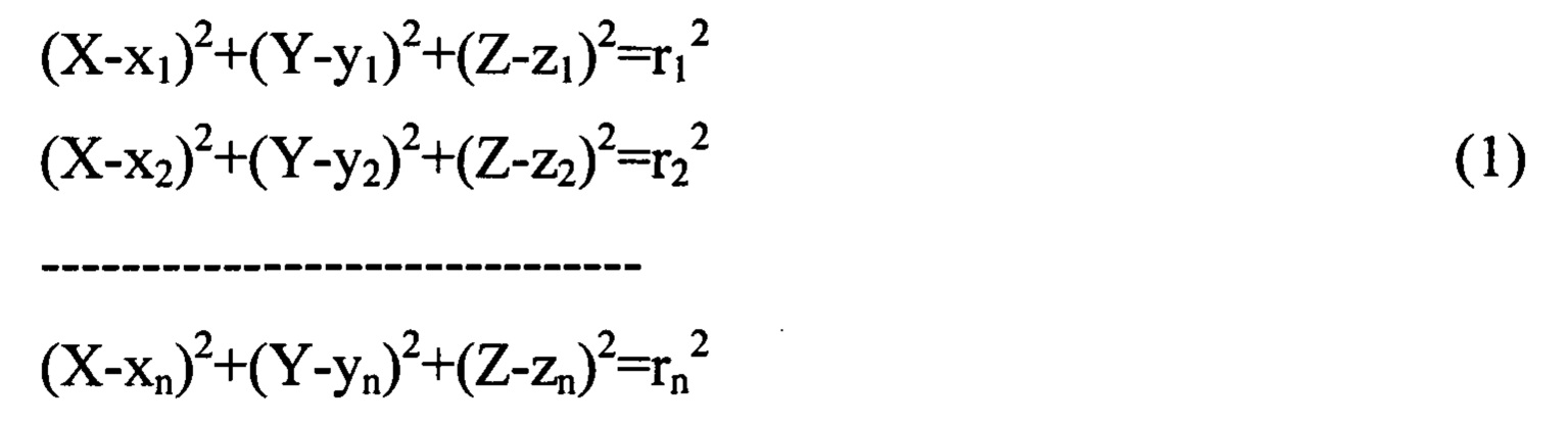Изобретение относится к области навигационных систем и может быть использовано для локального позиционирования наземных объектов с относительно постоянной высотой расположения антенны в горизонтальной плоскости (в плане) в условии возможных помех на ограниченных территориях и в закрытых помещениях, где определение координат объектов с помощью глобальной навигационной спутниковой системы (ГНСС) затруднено либо нецелесообразно. В большинстве локальных навигационных систем (ЛНС) применяют способы позиционирования, основанные на вычислениях, где в качестве исходной информации используют координаты базовых узлов (БУ) с дальномерными модулями и расстояния от них до позиционируемого объекта. Чаще всего для определения этих расстояний используют методы, основанные на степени падения мощности принимаемого сигнала RSS (received signal strength), либо времени его задержки TOA (time of arrival). Классический латерационный (основанный на определении расстояний) способ позиционирования объектов в ЛНС предполагает решение системы уравнений, определяющих точку пересечения 3-х (при возможности отсева побочного решения) либо более сфер: где: {X,Y,Z} - искомые координаты позиционируемого объекта, {xi, yi, zi, ri,} - известные координаты i-го базового узла (БУ) и соответствующее ему расстояние до объекта. При числе уравнений (1) более 3-х создается избыточность условий, при которых приближенное решение может быть найдено с использованием метода наименьших квадратов. Указанный способ с успехом используют при позиционировании объектов ГНСС (ГЛОНАСС, GPS). Если точки контролируемой области доступны для связи с не менее чем тремя БУ, а расстояния между антеннами БУ и позиционируемым объектом найдены достаточно точно, то решение системы (1) позволяет получить и для ЛНС метровую, а то и дециметровую точность. Однако в реальных условиях наземного позиционирования точно определить расстояние между хотя бы тремя БУ и объектом удается очень редко. Особенно это касается подвижного объекта. Ведь даже при отсутствии препятствий (line-of-sight - LOS) не всегда удается избавиться от многолучевости и учесть лишь прямой путь прохождения сигнала, а малейшие изменения в обстановке (движение человека либо качание листвы на пути сигнала) увеличивают время его прохождения и завышают расчетные расстояния. Из-за препятствий между антеннами БУ и объектом (Non-line-of-sight - NLOS) и многолучевости практически все методы определения расстояний для наземных объектов в ЛНС по большей части дают отклонения в большую сторону (И.Е. Монвиж-Монтвид. Особенности локального позиционирования объекта в условиях его прямой видимости со стороны стационарных модулей.//Труды XII Российской научно - технической конференции «Новые информационные технологии в системах связи и управления». - Калуга, 2013. стр. 421). Таким образом, в реальных условиях все значимые отклонения расстояний идут в большую сторону, причем в ЛНС величина этих отклонений, особенно в помещениях, вполне сравнима с величиной самих расстояний. В результате, чувствительная к ошибкам начальных параметров система (1) может давать значительную погрешность либо вообще не иметь решения. При таких условиях возможен лишь вероятностный расчет, а реальное положение объекта следует искать в области общей для всех образующих сфер. Эту область определяют системой не