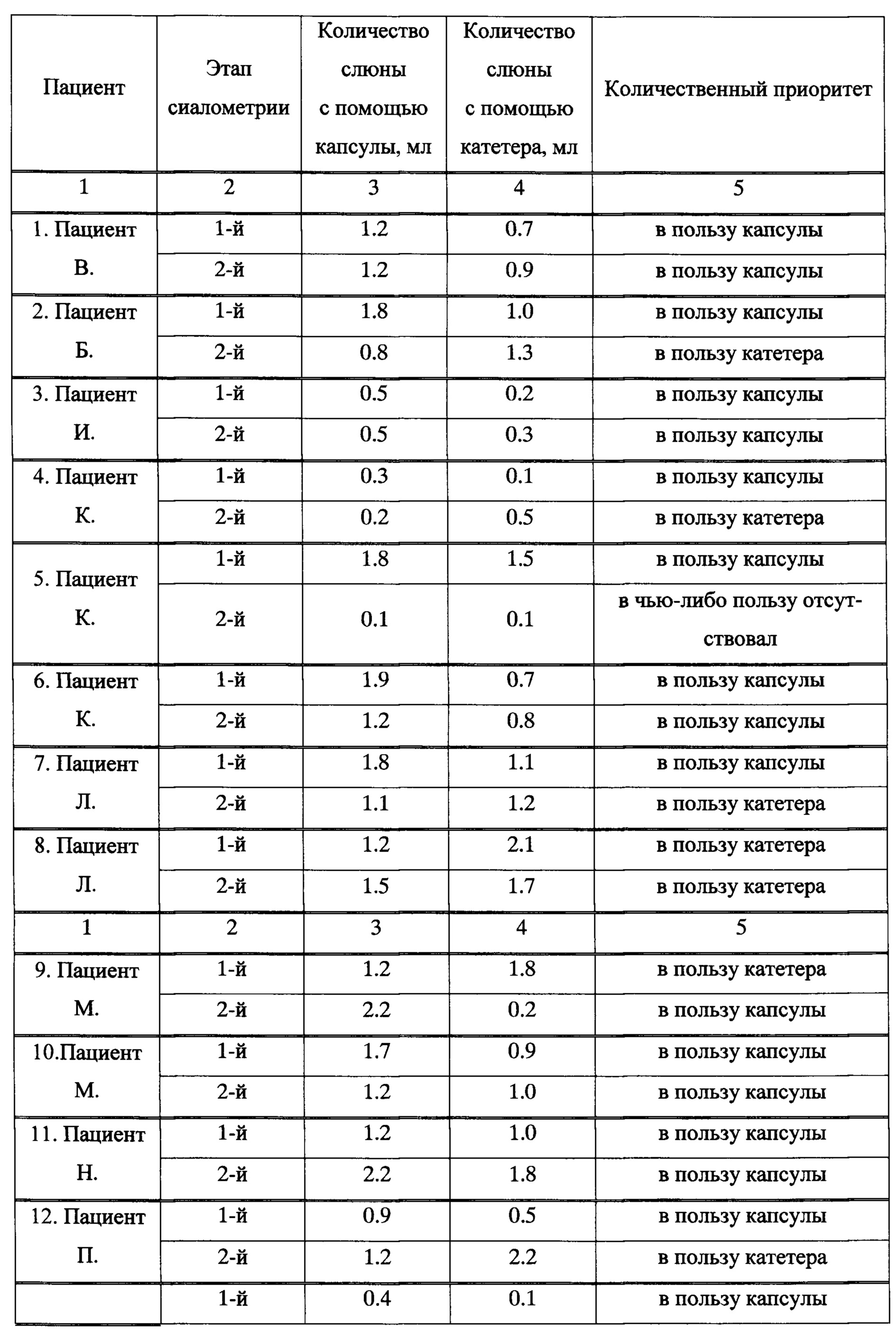 Предложенный способ сиалометрии был апробирован в клинических условиях при оценке секреторной функции околоушных желез у пациентов с ксеростомией различного происхождения (таб. 1) и показал свою клиническую эффективность с помощью статистического анализа. В таблице 1 в столбце 4 продемонстрированы результаты сиалометрии, какими они могли бы быть в случае применения только методики - прототипа, в столбце 3 показано прецизионное преимущество предлагаемого способа, на которое указывается в столбце 5. Исследование в два этапа перепроверяет показатели у каждого пациента и повышает доказательный характер предлагаемого способа сиалометрии с учетом динамического состояния функционального показателя.