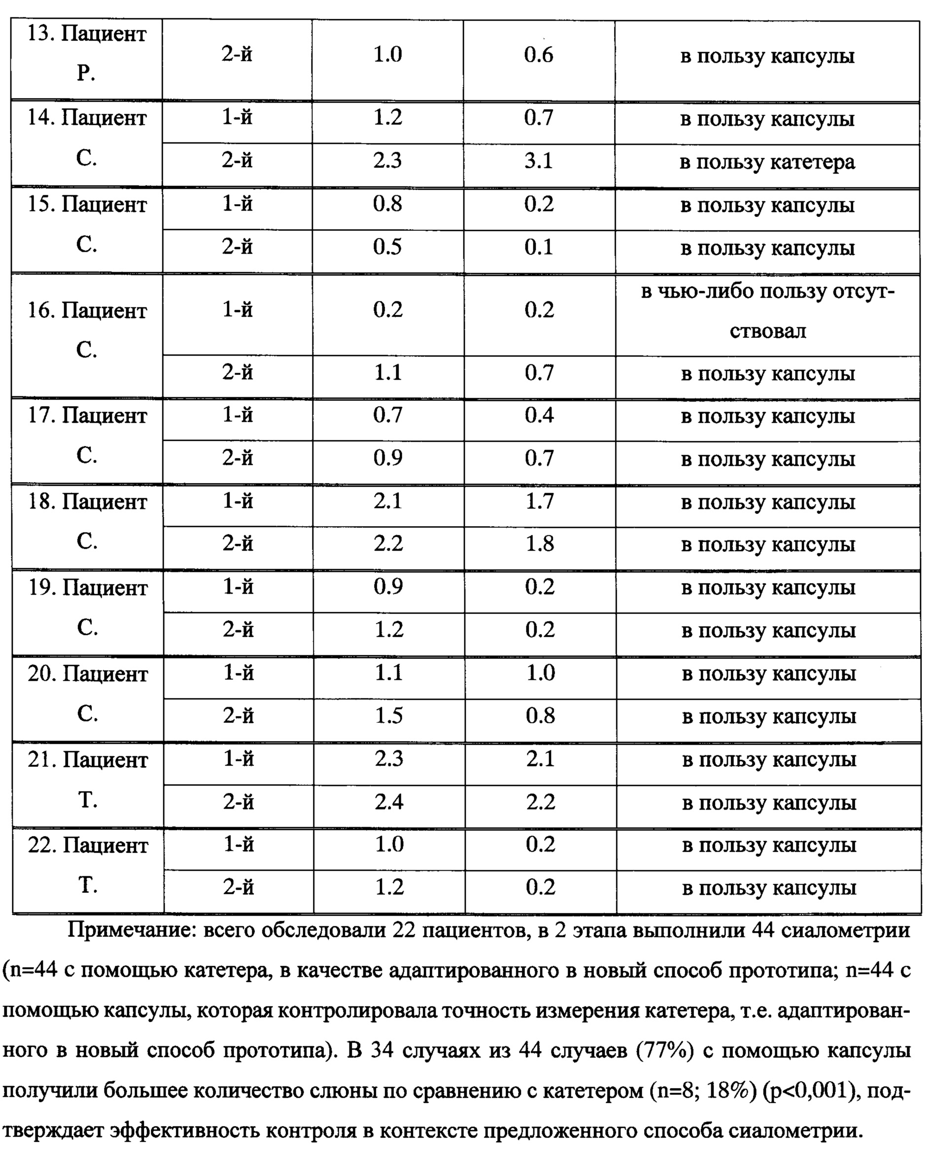 Заключение: объективная ксеростомия, тяжелая степень. Контроль прототипа, осуществляемого с помощью катетера попеременно из разных околоушных желез, исследованием, показал значительную ошибку измерения. С помощью капсулы удалось эту ошибку обнаружить и исключить из анализа.