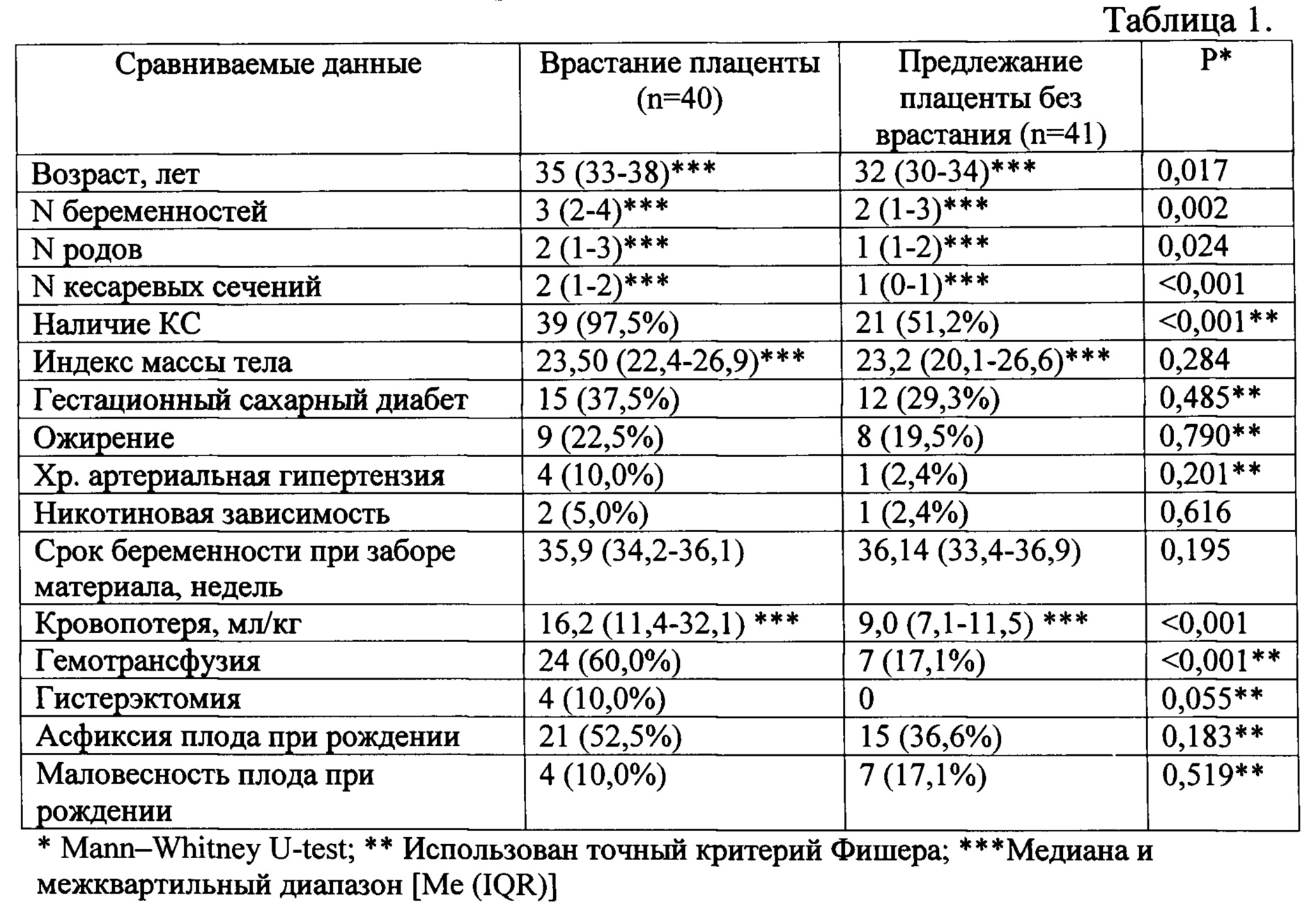 Из 81 пациенток, включенных в исследование, ВП было верифицировано клинически и гистологически у 40. Все пациентки относились к белой расе. При сравнении клинических и демографических характеристик обнаружена статистическая однородность групп (р>0,1) по коморбидности, сроку беременности при заборе материала и родоразрешения (см. табл.1).
