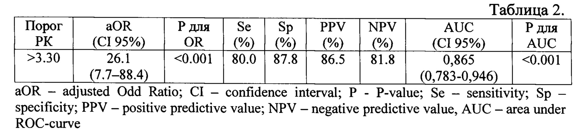 Диагностическая ценность биомаркеров оценивалась с помощью логистического регрессионного анализа (использовалась программа SPSS Version 26 (IBM, Chicago, USA)): измерялись отношение скорректированных шансов (Adjusted Odds Ratio - aOR), чувствительность, специфичность, предсказательная ценность теста (positive predictive value of positive and negative results - PPV, NPV), площадь под ROC-кривой (см. табл.2).
