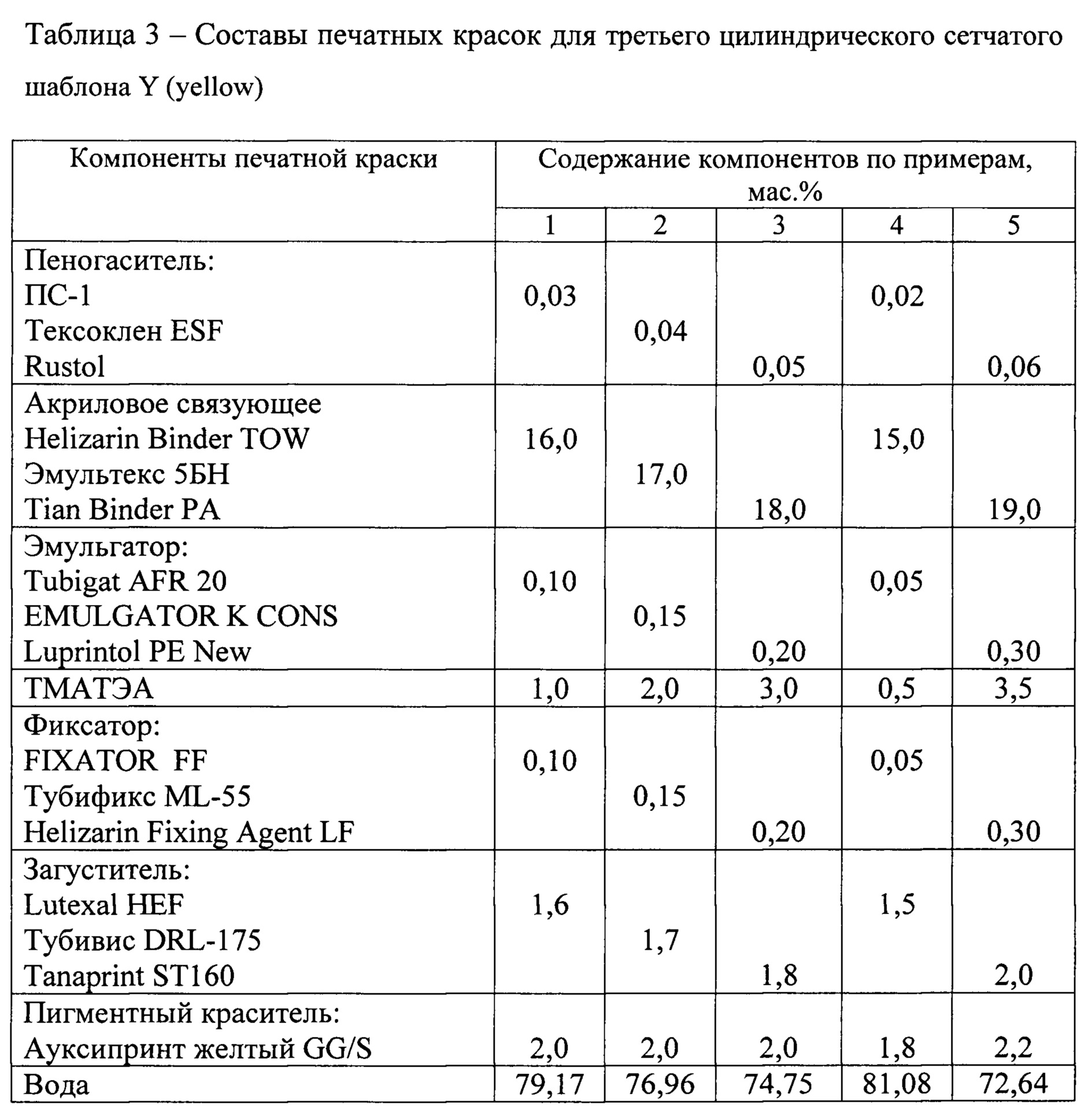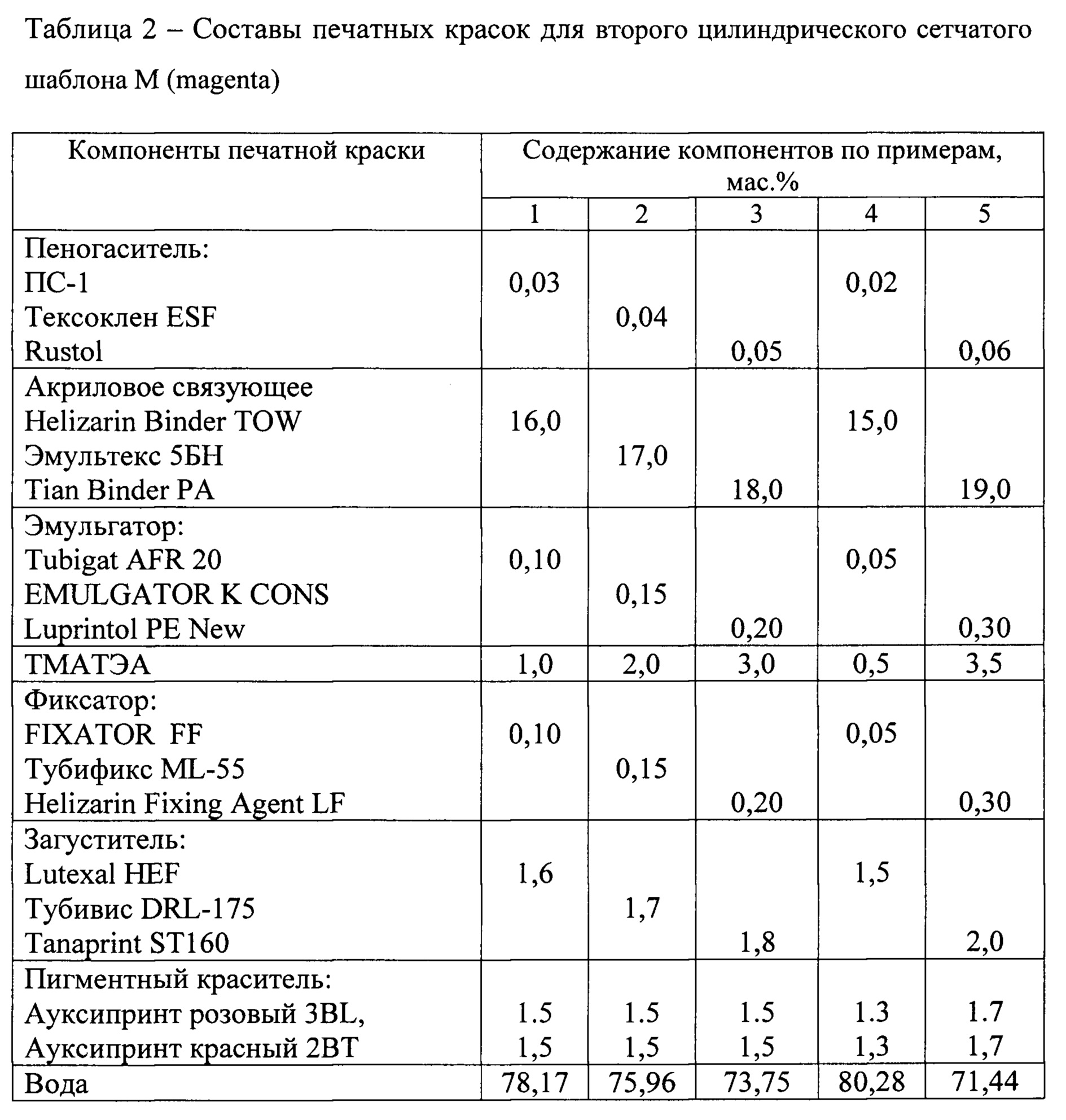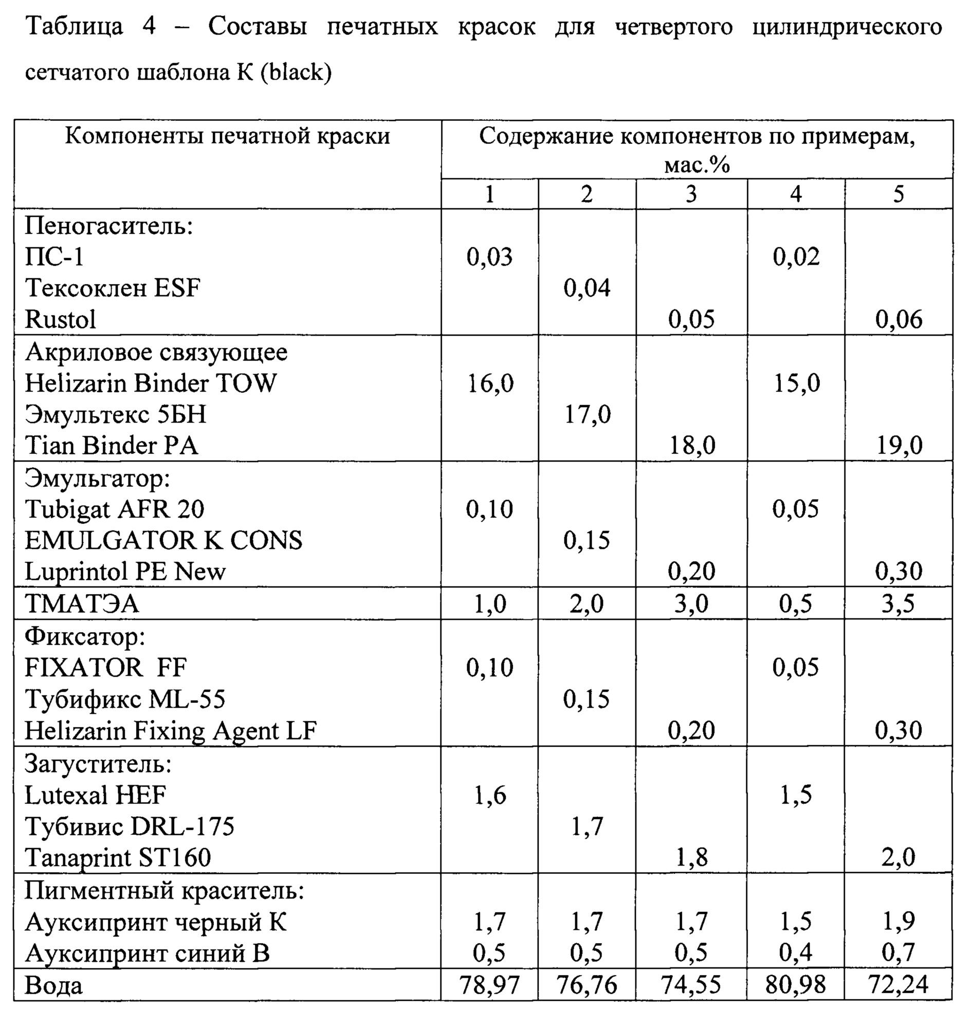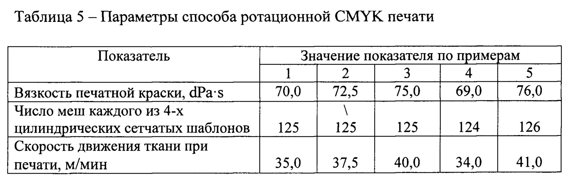 Способ ротационной печати на хлопчатобумажной ткани, включающий приготовление печатной краски, содержащей акриловое связующее, эмульгатор, загуститель, пигментный краситель и воду, нанесение рисунка на ткань цилиндрическими сетчатыми шаблонами, сушку и термообработку, отличающийся тем, что в печатную краску дополнительно вводят пеногаситель, триметакрилат триэтаноламина и фиксатор при следующем соотношении компонентов, мас.%: и она имеет вязкость 70-75 dPa⋅s, а нанесение рисунка на ткань осуществляют методом CMYK печати четырьмя цилиндрическими сетчатыми шаблонами 125 меш каждый при скорости движения ткани 35-40 м/мин.Пеногаситель 0,03-0,05 Акриловое связующее 16,0-18,0 Эмульгатор 0,1-0,2 Триметакрилат триэтаноламина 1,0-3,0 Фиксатор 0,1-0,2 Загуститель 1,6-1,8 Пигментный краситель 2,0-3,0 Вода до 100,
