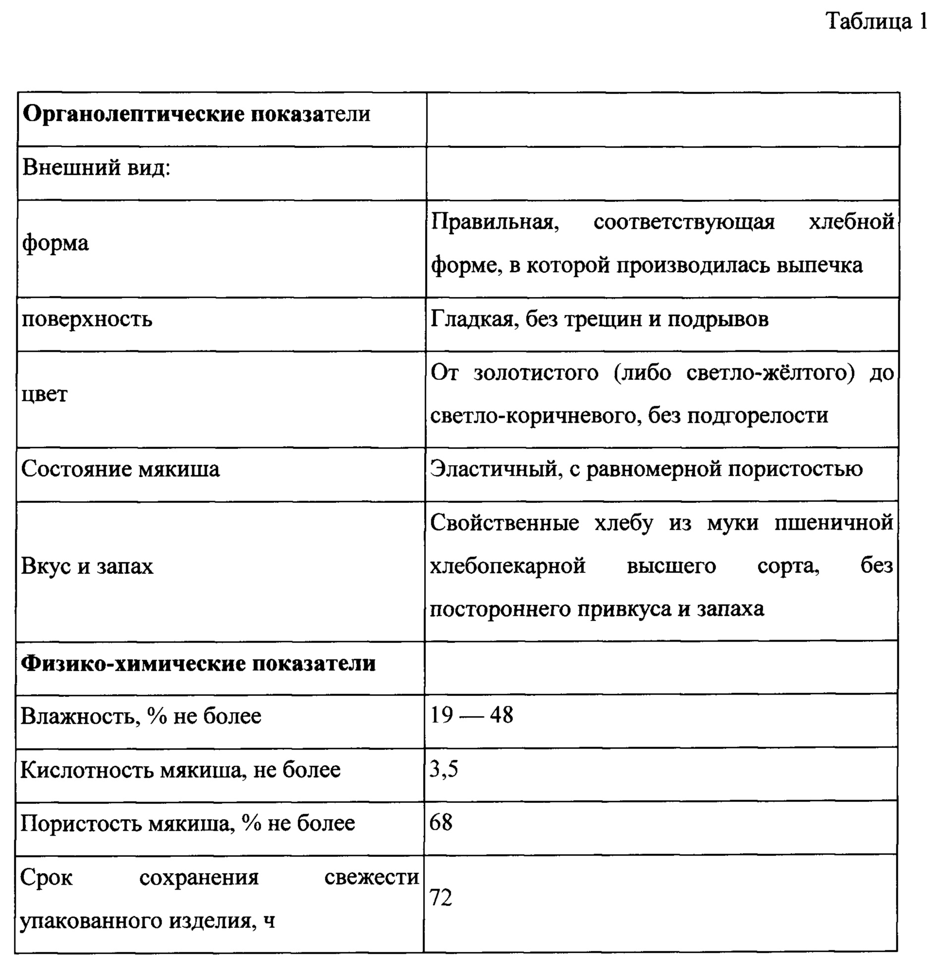 Таким образом, заявляемый способ производства пшеничного хлеба на закваске, отличается от прототипа тем, что в качестве закваски используют пищевую добавку О-Тентик Дурум, замешивают тесто на холодной воде при температуре 0 - +4°С, выпекают в форме прямой треугольной призмы с перечисленным выше содержанием рецептурных компонентов.