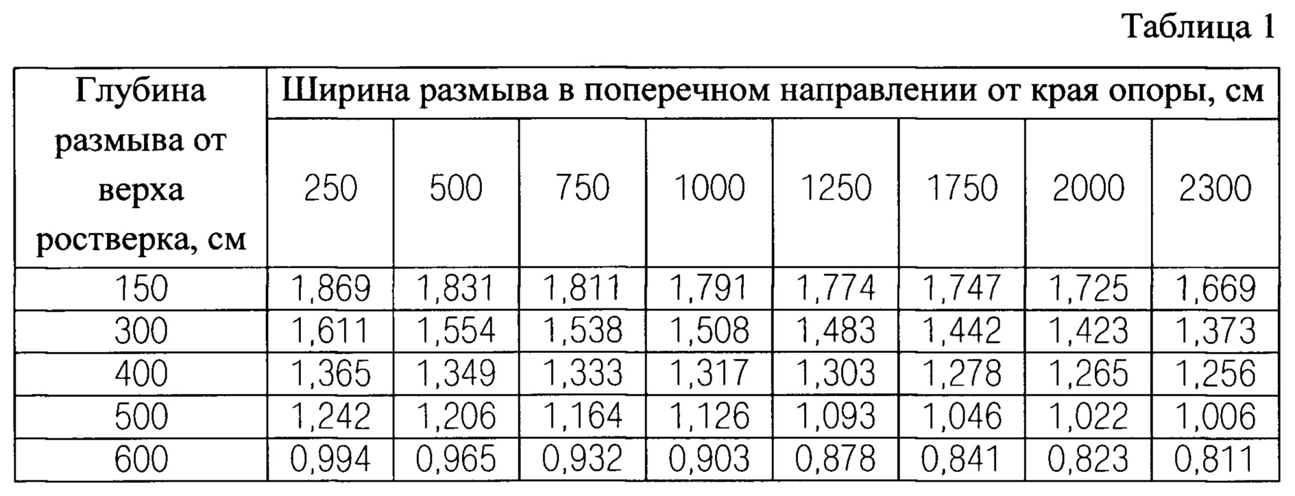 была создана конечно-элементная модель исследуемых опор (см. фиг. 3) и произведены расчеты первых частот собственных колебаний при моделировании различных ситуаций взаимодействия фундамента опоры с грунтом (различных значениях глубины h и ширины размыва b), результаты которых представлены в таблице 1. По результатам выполненных расчетов была получена поверхность изменения частоты свободных колебаний опоры от глубины и ширины размыва (см. фиг. 4).