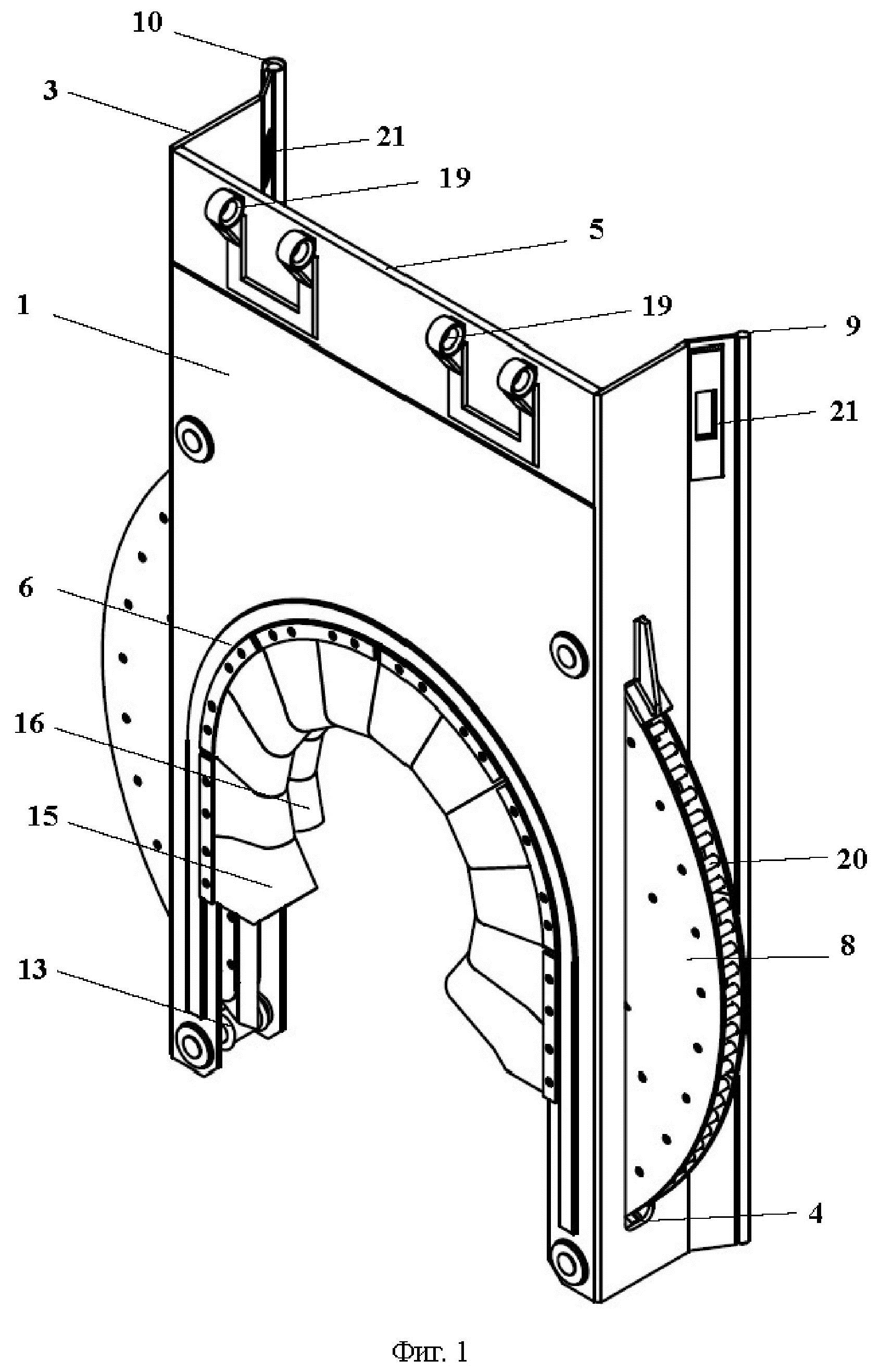 В предпочтительном варианте исполнения выполненный в полке 5 вырез 6 для трубы 7 снабжен по краю уплотнительным элементом 15. Уплотнительный элемент 15 может быть выполнен из эластичного полимерного материала, в частности из резины. Уплотнительный элемент 15 может быть выполнен петлеобразным в поперечном сечении с возможностью наполнения его воздухом или жидкостью для более плотного прилегания к трубе. Также уплотнительный элемент 15 может выполнять функцию защитного слоя (футляра), а внутрь его петлеобразной полости может быть помещен элемент (не показан) из эластичного материала, в частности резины, который непосредственно заполняют воздухом или жидкостью. В этом случае элемент 15 будет предотвращать от повреждения помещенный в него наполняемый воздухом или жидкостью элемент (например, в виде сектора пневматической камеры).