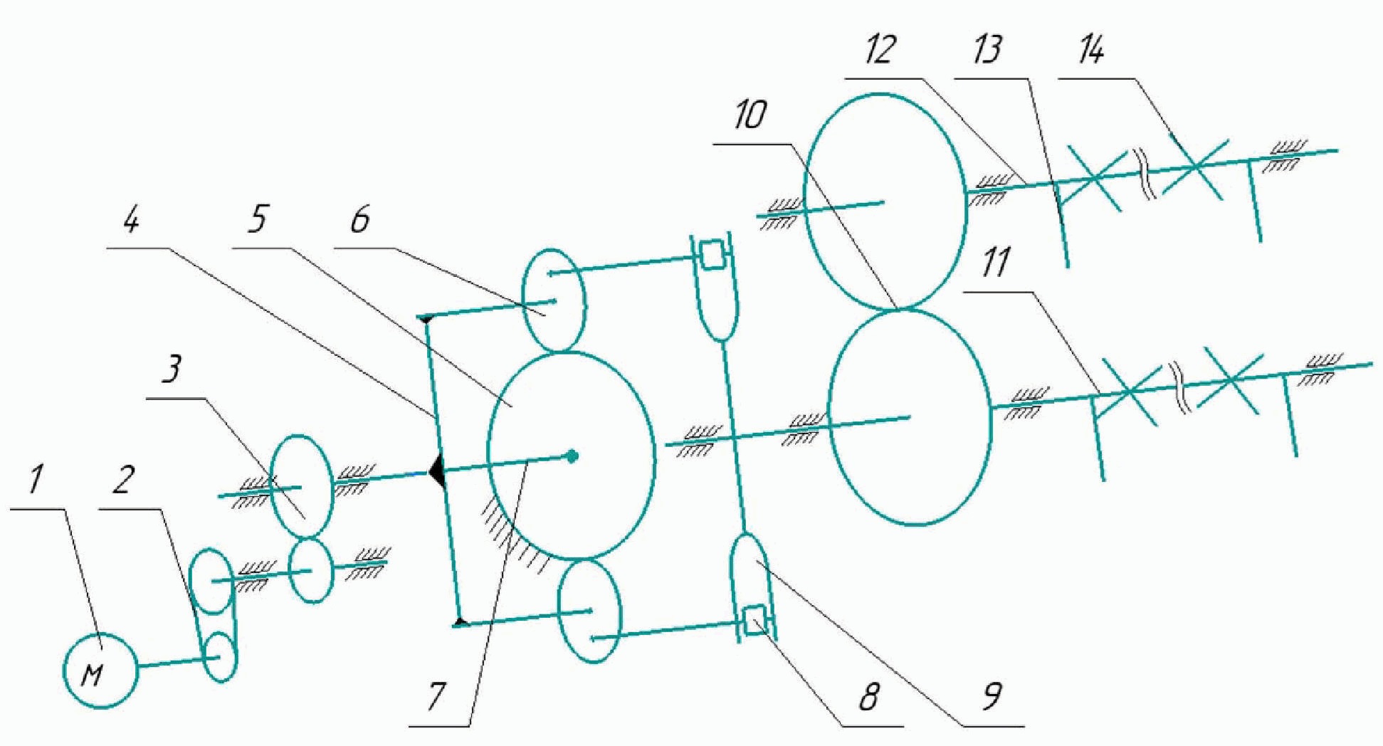 Тестомесильная машина непрерывного действия, включающая загрузочный патрубок, горизонтальную рабочую камеру с двумя рабочими валами, снабженными скребковыми и месильными лопатками, и привод, состоящий из двигателя, клиноременной передачи, зубчатых передач, кулисы, отличающаяся тем, что для сообщения рабочим валам вращательного движения с переменной скоростью привод снабжен планетарным передаточным механизмом, включающим водило, один конец которого жестко соединен с ведомым валом зубчатой передачи, а два других несут сателлиты, находящиеся в зацеплении с неподвижным солнечным колесом и с эксцентрично расположенными осями для сухарей, свободно закрепленных на осях сателлитов и размещенных в пазах кулисы, имеющей общую ось с рабочим валом.