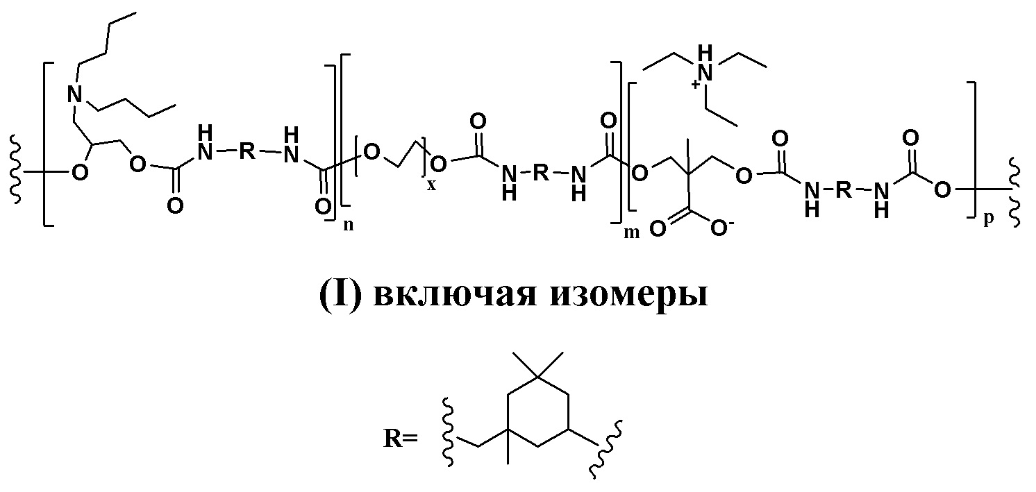 Изобретение относится к химии полимерных соединений, а именно - к ингибиторам гидратообразования и коррозии на основе полиуретанов общей формулы I (включая изомеры). где сумма n, m, x и p представляет собой число, достаточное для получения средней молекулярной массы 4 кДа (килодальтон). Данные соединения могут найти применение в нефтегазовой отрасли в процессах добычи, переработки и транспортировки углеводородного сырья для предотвращения коррозии и образования газовых гидратов - соединений, которые в процессе агломерации способны формировать гидратные пробки, препятствующие свободному потоку флюидов. В природном газе, газовом конденсате и нефти присутствуют такие соединения, как углеводороды алканового ряда С1-С4, диоксид углерода, сероводород, азот, которые при определенной температуре и давлении могут образовывать с водой соединения включения - газовые гидраты (клатраты). Газовые гидраты в процессе добычи и транспортировки углеводородов образуются при надлежащих термобарических условиях, например, в стволе скважин, трубопроводах и оборудовании при внедрении низкомолекулярных соединений в полости кристаллической решетки, формируемой молекулами воды посредством водородных связей. Данные образования в процессе агломерации формируют гидратные пробки, препятствующие свободному потоку флюидов, тем самым способствуя различного рода техногенным авариям. Помимо этого, сероводород и диоксид углерода в присутствии воды способны вызывать коррозию трубопровода или других контактных стальных элементов, используемых при добыче, транспортировке, хранении и переработке углеводородов, что снижает срок их (трубопроводов и др.) эксплуатации и также может приводить к авариям. Среди доступных методов предотвращения закупорки трубопроводов, таких как снижение давления, повышение температуры и дегидратация, химическая обработка ингибиторами является наиболее экономически эффективным методом [ Введение в поток большого количества нефтепромысловых реагентов требует более мощной инфраструктуры (дополнительные резервуары для хранения, инжекционные насосы и распределительные трубопроводы) и сложного процесса последующей регенерации введенных добавок [ Следует также отметить, что снижение количества используемых в области нефтехимии реагентов и их номенклатуры может благоприятно сказаться на окружающей среде и здоровье человека. Данный аспект на дату представления заявочных материалов также является актуальным. Таким образом, разработка эффективных нефтепромысловых реагентов двойного назначения - ингибиторов газовых гидратов и ингибиторов коррозии - представляется на сегодняшний день актуальным направлением развития нефтепромысловой химии. Получение соединений, обладающих комплексным действием, должно обеспечить возможность существенного снижения экономических затрат, направленных на обеспечение стабильности потока углеводородов, при этом такие соединения значительно расширяют арсенал средств указанного назначения. Следует иметь в виду, что ингибиторы гидратообразования применяют в концентрациях от 0.25% до 2% по массе от водной фазы, в то время как ингибиторы коррозии используются в меньших концентрациях. Однако принимая во внимание задачу заявленного технического решения - создание реагента именно б