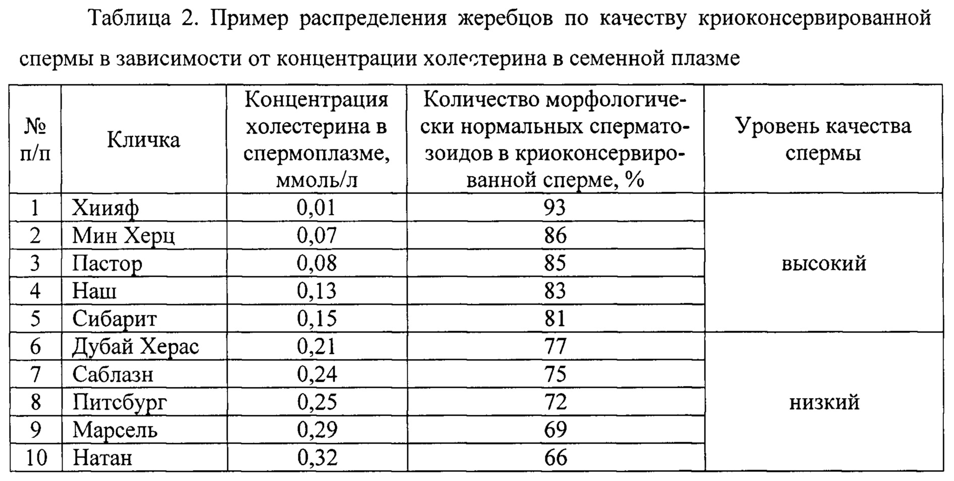 Способ оценки качества криоконсервированной спермы жеребцов по концентрации холестерина в семенной плазме, включающий определение концентрации холестерина в семенной плазме, отличающийся тем, что при концентрации холестерина в семенной плазме меньше 0,18 ммоль/л жеребца относят к группе с высоким качеством криоконсервированной спермы, при концентрации холестерина в семенной плазме больше 0,18 ммоль/л, соответственно, к группе с низким качеством криоконсервированной спермы.
