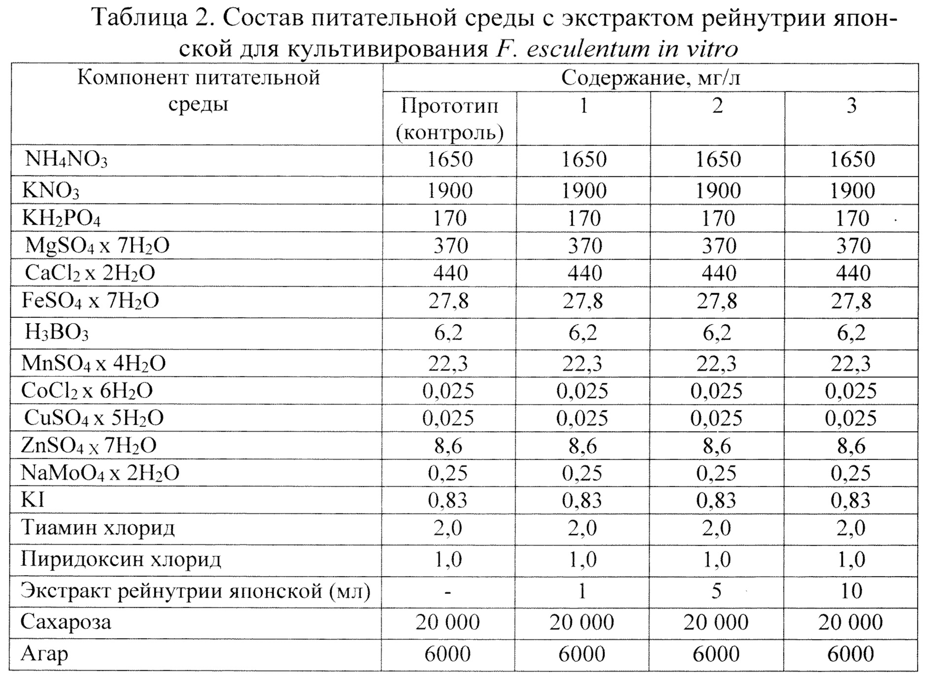Питательная среда для микроклонального размножения гречихи посевной, содержащая аммоний азотнокислый, калий азотнокислый, калий фосфорнокислый однозамещенный, магний сернокислый семиводный, кальций хлористый двухводный, борную кислоту, марганец сернокислый четырехводный, кобальт хлористый шестиводный, медь сернокислую пятиводную, цинк сернокислый семиводный, натрий молибденовокислый двухводный, калий йодистый, тиамин хлорид, пиридоксин хлорид, сахарозу, агар и воду, отличающаяся тем, что в ее состав дополнительно вводят деалкоголизированный экстракт рейнутрии японской в количестве 1-5 мл/л среды.
