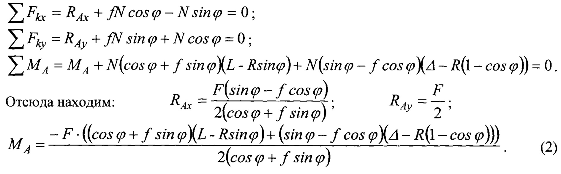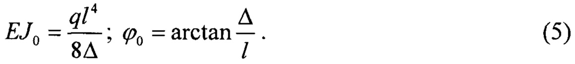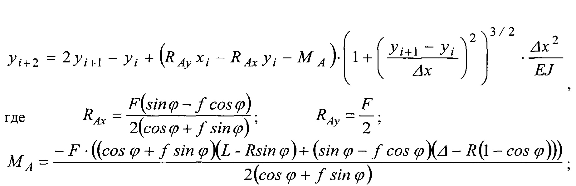Изобретение относится к области оценки качества лубоволокнистых материалов и может быть использовано при расчете изгибной жесткости лубяных волокон при их квалиметрии и стандартизации. Известен метод определения гибкости волокна или луба лубяных культур путем определения стрелы прогиба консольных концов волокнистой пробы, закрепленной в зажиме по ее середине [1]. Однако этот метод требует значительных затрат по времени и не обеспечивает необходимую точность анализа, так как фиксация показаний по совокупности концов волокон является весьма затруднительной и зависимой от субъективных факторов. Известен способ оценки гибкости волокна или луба лубяных культур с использованием устройства [2], включающий подготовку пробы и ее испытание на основе прогиба относительно ряда опор. Недостатком этого способа является неэффективное определение изгибной жесткости волокна, так как не учитывается фактический угол обхвата каждой из используемых для прогиба волокна опор. Это обстоятельство снижает точность получаемых результатов изгибной жесткости. Известен способ определения изгибной жесткости волокна, включающий подготовку пробы, ее расположение на двух опорах, прогиб посредством приложения усилия и определение изгибной жесткости с использованием математической зависимости [3], которая вытекает из нелинейной теории изгиба [4]. Основным недостатком известного способа [3] является неопределенность при вычислении угла наклона а составляющей силы реакции на прядь со стороны опор к вертикали. Этот угол связан с углом δ0, который определяет направление оси абсцисс по отношению к направлению силы Р в начальной точке. Из-за этой неопределенности расчет изгибной жесткости становится неэффективным. Не правильное определение угла а будет приводить к ошибкам при определении силы реакции с учетом усилия, которое обеспечивает прогиб пряди. Из-за этого формируется ошибка, которая будет влиять на величину изгибной жесткости. Кроме этого, известный способ [3] является трудоемким, требующим определения ряда параметров: высоту изгиба нити, реакцию опоры Rx, угол наклона силы N1 к вертикали. Однако способ [3] по своей технической сущности и достигаемому эффекту наиболее близок к заявляемому и поэтому предлагается в качестве прототипа. Задачей изобретения является упрощение анализа и повышение точности при определении изгибной жесткости волокна. Поставленная задача достигается тем, что в указанном способе определения изгибной жесткости волокна, включающем подготовку пробы ее расположение на двух опорах, прогиб посредством приложения усилия и определение изгибной жесткости с использованием математической зависимости, вытекающей из нелинейной теории изгиба, согласно изобретению, пробу в виде пряди определенной длины и массы перед испытанием располагают на опорах круглого сечения известного диаметра 2R при межцентровом расстоянии 2L с последующим прогибом на постоянную величину Δ, путем приложения усилия по середине пробы в зоне между опорами в точке А, а изгибную жесткость EJ, в зависимости от возникающего усилия F, рассчитывают численным методом, используя форму изогнутой оси пряди в виде зависимости: f - коэффициент трения пряди о поверхность опор; ϕ - угол между вертикалью и радиусом опоры, проведенным из центра ее сечения к точке к