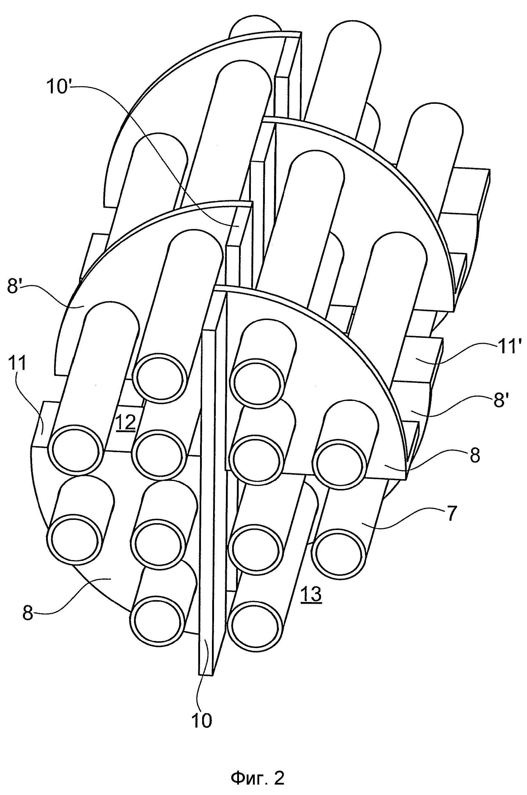 Направляющие перегородки 10, 11 на входной стороне и на стороне выхода отклоняющих поверхностей предпочтительно установлены под углом 90° друг к другу. Продукт течет сквозь направляющую перегородку 10 на входной стороне раздельно в противоположных направлениях, под углом к трубам, к окнам 12, 13, проходит сквозь отклоняющую поверхность в осевом направлении и впадает на противоположной стороне направляющей перегородки на стороне выхода, поворачиваясь в направлении направляющей перегородки 11 предпочтительно на 90°. При этом направления движения частичных потоков под углом к трубам на стороне выхода на обеих сторонах направляющей перегородки 11 опять-таки противоположны. Отклоняющие поверхности с окнами и пересекающимися направленными перегородками образуют встроенный элемент А или, соответственно, встроенный элемент В. Направляющие перегородки 11, 10' встроенных элементов (А, В), следующих друг за другом в направлении движения потока, предпочтительно пересекаются под углом 90°. Закрытые частичные поверхности 8, 8' и окна 12, 12' и 13, 13' следующих друг за другом встроенных элементов А, В чередуются.