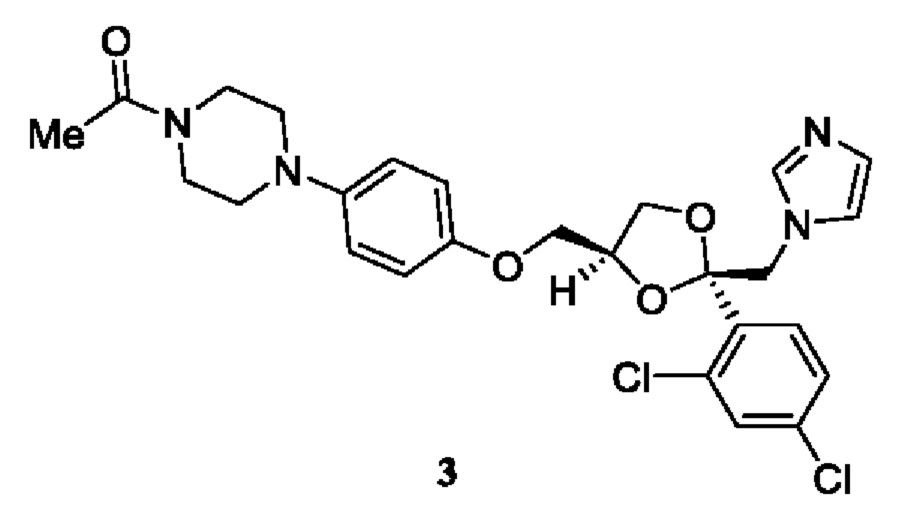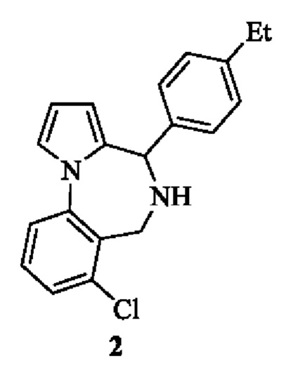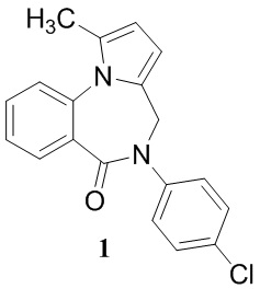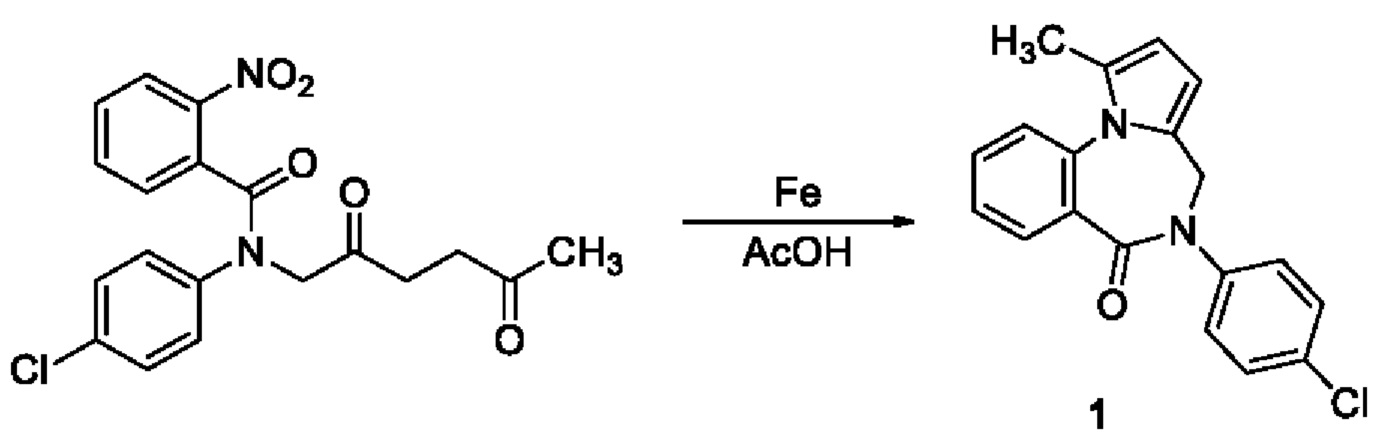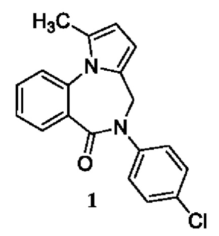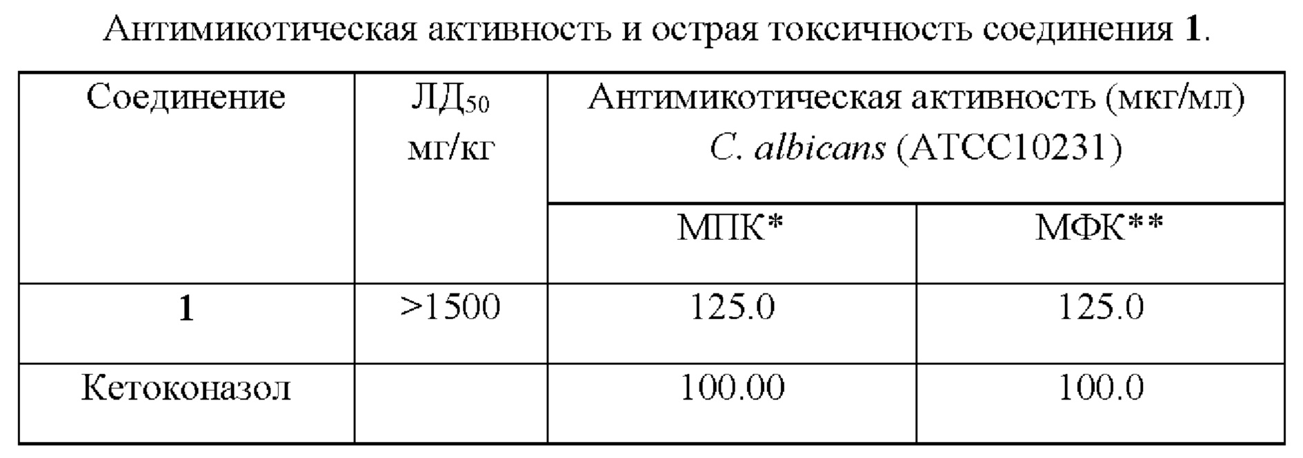 Изобретение относится к области органической химии - новым биологически активным соединениям - замещенным пирроло[1,2-a][1,4]бензодиазепинам, а именно к 1-метил-5-(4-хлорфенил)-4,5-дигидро-6H-пирроло[1,2-a][1,4]бензодиазепин-6-ону 1 формулы: соединение 1 обладает антимикотической активностью, что позволяет предположить его использование в медицине в качестве потенциального лекарственного средства с антимикотическими свойствами. Аналогом по структуре заявляемому соединению является 7-хлор-4-(4-этилфенил)-5,6-дигидро-4H-бензо[ƒ]пирроло[1,2-a][1,4]диазепин 2, обладающий антимикотической активностью [Bioorg. Med. Chem. Lett. 2005, 75, 3453-3458; doi: 10.1016/j.bmcl.2005.05.007] формулы: Эталоном сравнения был выбран кетоконазол 3 формулы: который широко применяется в лечебной практике, и является аналогом по действию [Машковский М.Д. Лекарственные средства. - 16-е изд., перераб., испр. и доп. - М.: Новая волна, 2012. - с. 918; Med. Chem. Res. 2013, 22, 211-218; doi: 10.1007/s00044-012-0021-2]. Задачей изобретения является поиск в ряду замещенных пирроло[1,2-a][1,4]бензодиазепинов веществ с выраженным антимикотическим действием и низкой токсичностью. Поставленная задача достигается получением 1-метил-5-(4-хлорфенил)-4,5-дигидро-6H-пирроло[1,2-а] [1,4]бензодиазепин-6-она, который обладает антимикотической активностью. Заявляемое соединение 1 синтезируют обработкой N-(2,5-диоксогексил)-N-(4-хлорфенил)-2-нитробензамида карбонильным железом при нагревании, а затем выдерживании суспензии при комнатной температуре с последующей нейтрализацией кислоты NaHCO3 и выделением целевого продукта стандартными методами синтетической органической химии по схеме: Пример 1. Получение соединения 1. Железную пыль (3 г) добавляют к раствору N-(2,5-диоксогексил)-N-(4-хлорфенил)-2-нитробензамида (1 г) в ледяной уксусной кислоте (20 мл). Реакционную смесь нагревают до кипения и выдерживают при комнатной температуре 1 час (ТСХ контроль). Затем реакционную смесь выливают в холодную воду (100 мл) и нейтрализуют NaHCO3 до рН ~ 7. Выпавший осадок отфильтровывают и тщательно промывают горячим этилацетатом (5 × 30 мл). Объединенные органические фракции сушат над безводным Na2SO4 и упаривают досуха при пониженном давлении. Остаток очищают методом колоночной хроматографии, используя элюент: этилацетат - петролейный эфир, 1:2. Перекристаллизовывают из смеси ацетон - петролейный эфир. Выход 77%. Найдено: С, 70.93; Н, 4.73; N, 8.51. Вычислено для C19H15ClN2O: С, 70.70; Н, 4.68; N, 8.68%. Спектр ЯМР1Н, (300 МГц, CDCl3), δ, м.д.: 2.36 (с, 3Н, СН3), 4.37 (д,2J=15.6 Гц, 1H, СН2), 4.67 (д,2J=15.6 Гц, 1H, СН2), 6.07 (с, 2Н, HPyr), 7.26 (д,3J=8.7 Гц, 2Н, HAr), 7.29-7.32 (м, 1Н, HAr), 7.36 (д,3J=8.7 Гц, 2Н, HAr), 7.39-7.44 (м, 1Н, HAr), 7.55-7.60 (м, 1Н, HAr), 7.98-8.01 (м, 1H, HAr). Спектр ЯМР13С (75 МГц, CDCl3), δ, м.д.: 14.0, 47.8, 105.6, 109.7, 124.5, 126.3, 127.5 (2С), 129.3 (2С), 129.6, 130.7, 130.8, 131.4, 131.8, 132.6, 135.3, 141.3, 167.6. Полученное соединение 1 представляет собой белое кристаллическое вещество, растворимое в хлороформе, толуоле, ацетоне, этилацетате, этаноле. Пример 2. Для характеристики антимикотической активности соединений использовали стандартные параметры: минимальная подавляющая концентрация (МПК), которую определяли модифицированным методом двукратных серийных разведений (Методические рекомендации: Грибы рода Candida. Методы выделения, идентификации на видовом уровне и определение чувствительности к противогрибковым препаратам, Москва, 2009; МУК 4.2.1890-04 Определение чувствительности микроорганизмов к антибактериальным препаратам) и минимальная фунгицидная концентраци