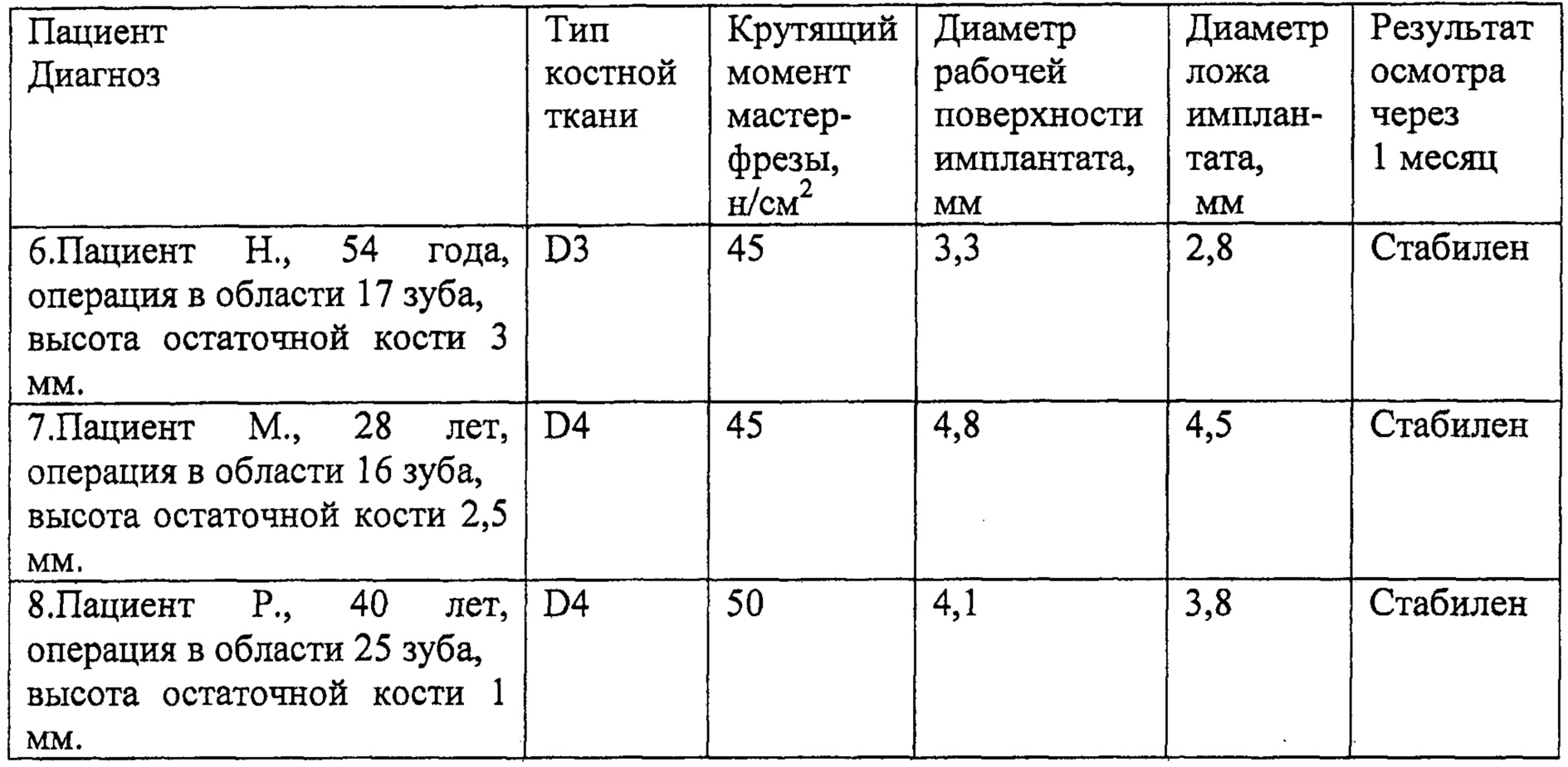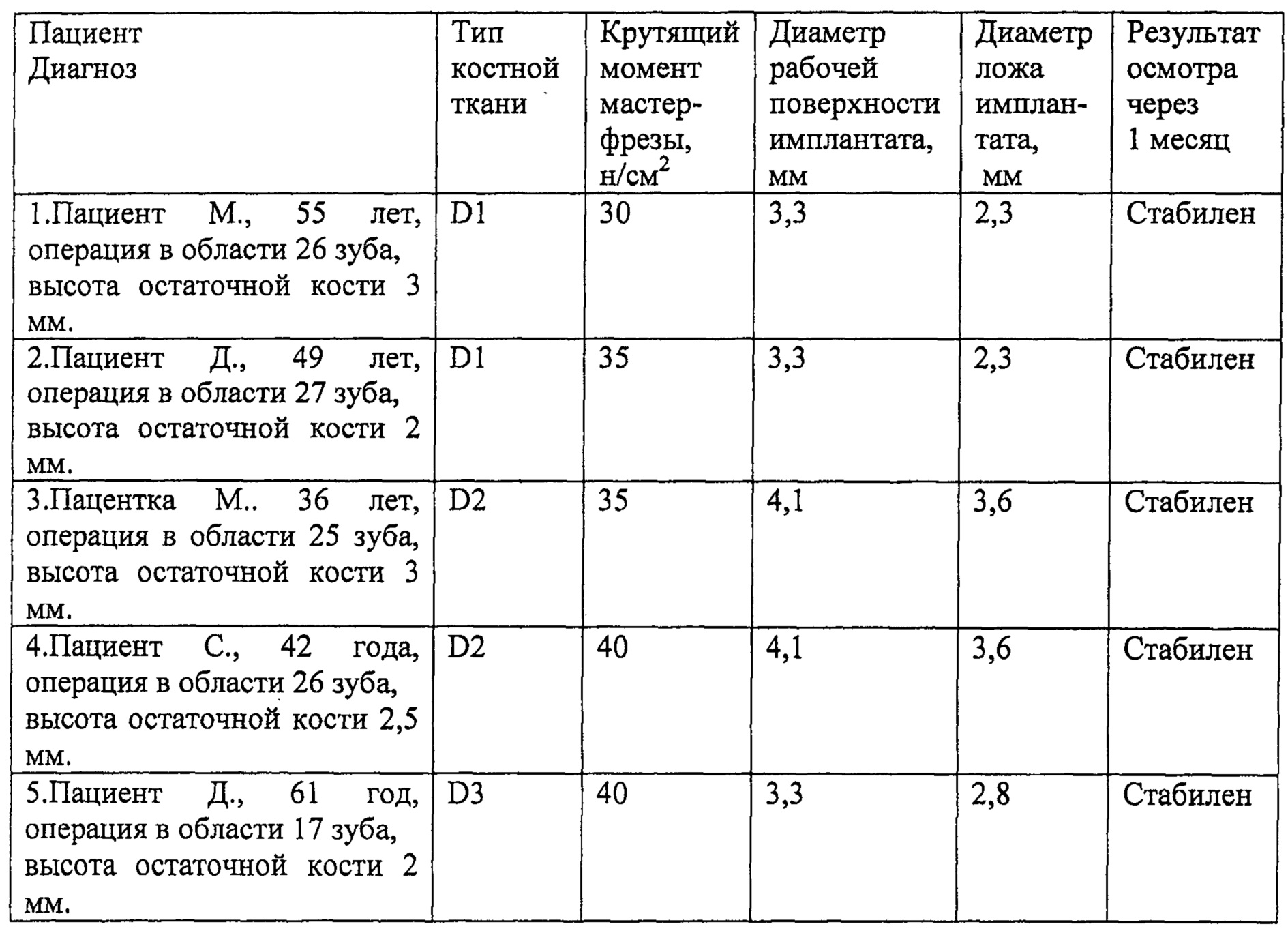 Изобретение относится к медицине, а именно к хирургической стоматологии. Предлагаемый способ включает отслоение слизистой оболочки полости рта, выполнение посредством фрез ложа имплантата. При этом перед началом операции определяют тип кости альвеолярного отростка в области имплантации. При определении типа костной ткани D1 выбирают крутящий момент мастер-фрезы в пределах 30-35 н/см2, при этом диаметр ложа имплантата выполняют на 1 мм меньше диаметра рабочей поверхности имплантата. При определении типа костной ткани D2 выбирают крутящий момент мастер-фрезы в пределах 35-40 н/см2, при этом диаметр ложа имплантата выполняют на 0,5 мм меньше диаметра рабочей поверхности имплантата. При определении типа костной ткани D3 выбирают крутящий момент мастер-фрезы в пределах 40-45 н/см2, при этом диаметр ложа имплантата выполняют на 0,5 мм меньше диаметра рабочей поверхности имплантата. При определении типа костной ткани D4 выбирают крутящий момент мастер-фрезы в пределах 45-50 н/см2, при этом диаметр ложа имплантата выполняют на 0,3 мм меньше диаметра рабочей поверхности имплантата. Способ позволяет повысить эффективность имплантологического лечения с одновременным синус-лифтингом при высоте остаточной кости 1-3 мм. 1 табл., 1 пр.