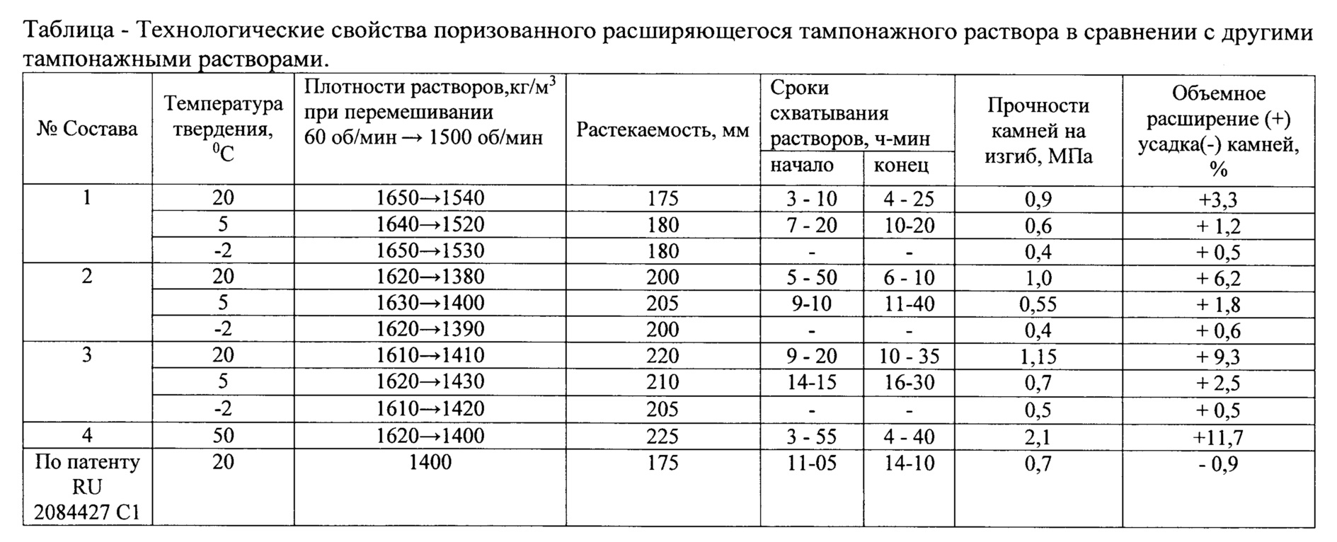 Изобретение относится к тампонажным материалам для цементирования обсадных колонн в газовых, газоконденсатных и нефтяных скважинах, осложненных наличием проницаемых, трещиноватых и многолетнемерзлых пород. Технический результат заключается в повышении качества первичного цементирования обсадных колонн в условиях отрицательных, низких положительных и нормальных температур. Поризованный расширяющийся тампонажный материал, включающий в себя бездобавочный портландцемент ПЦТ I-50, облегчающие и расширяющие компоненты, в качестве которых используют низкотемпературный керамзит, строительную гидравлическую известь, воздухововлекающую добавку, в качестве которой используют алкилсульфат натрия, а также суперпластификатор MELFLUX 1641 F, жидкость затворения, в качестве которой используют техническую воду, и дополнительно, в качестве регулятора сроков схватывания, диспергирующий глинозем, при следующем соотношении компонентов, мас.%: бездобавочный портландцемент 68,0-72,0, низкотемпературный керамзит 15-20, строительная гидравлическая известь 8-10, диспергирующий глинозем 2,0-5,0, алкилсульфат натрия 0,001-0,004; MELFLUX 1641 F 0,03-0,07, техническая вода - остальное, при этом жидкость затворения, суперпластификатор и воздухововлекающую добавку добавляют в состав сверх 100%. 1 табл.