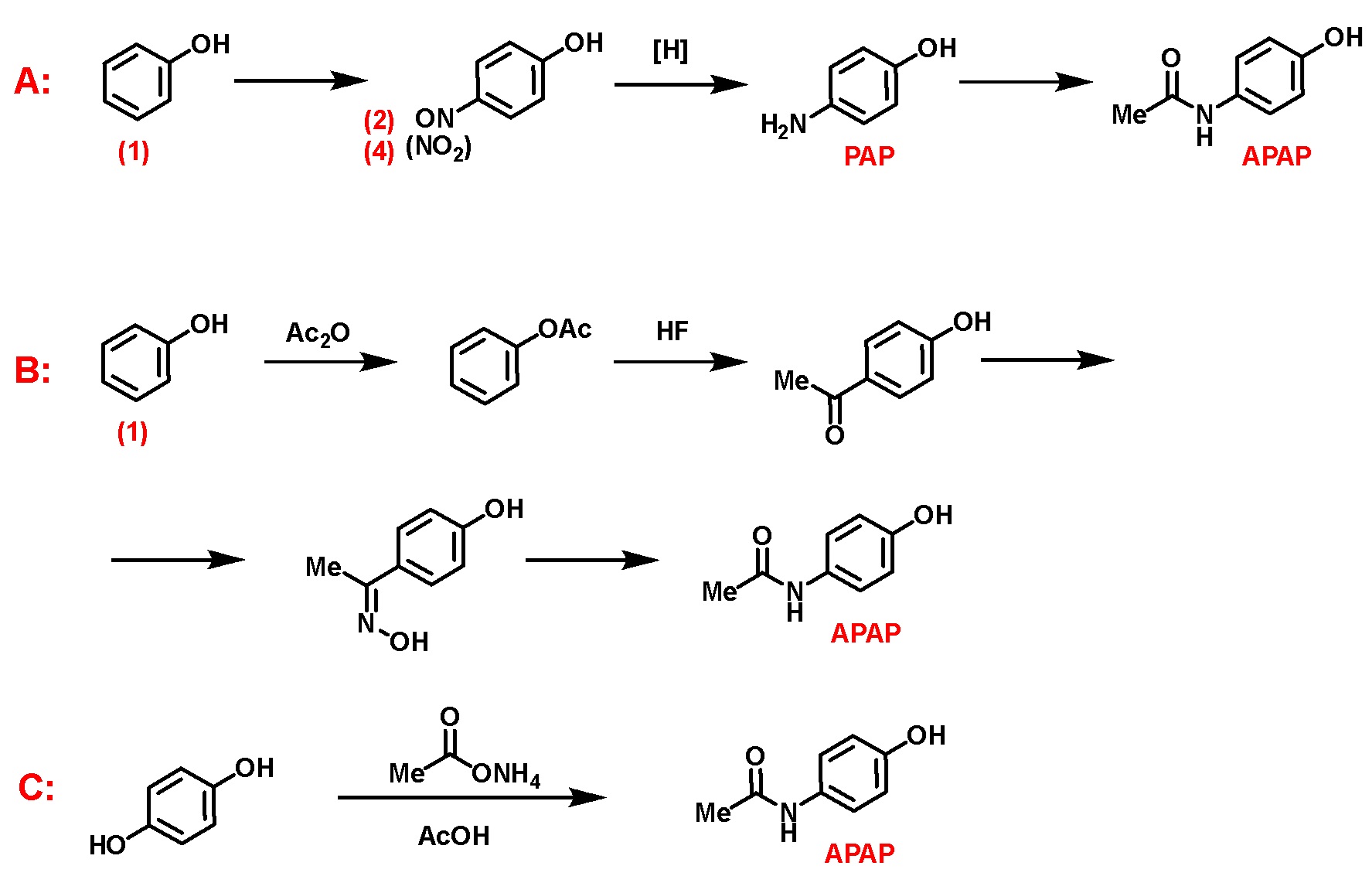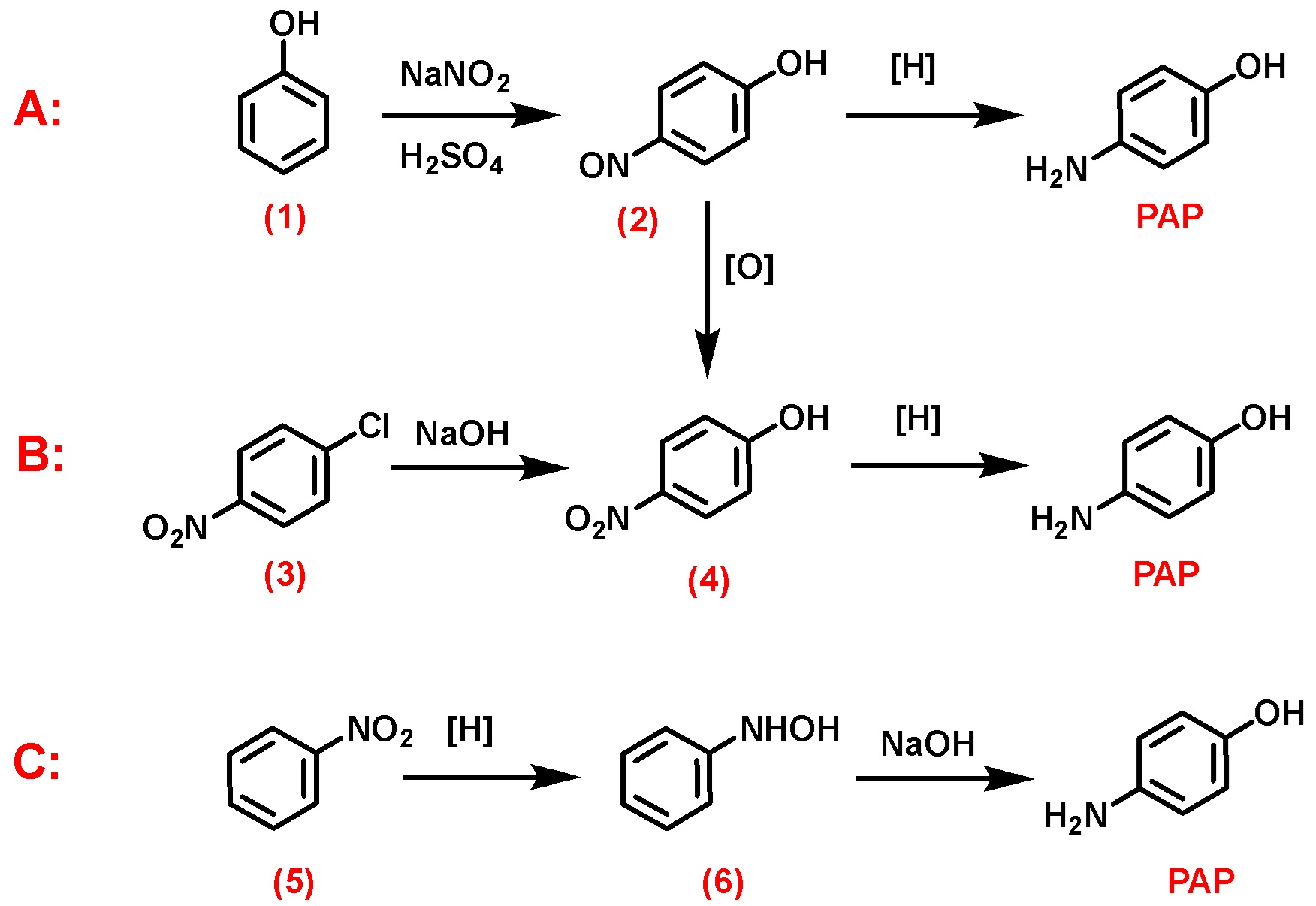 Настоящее изобретение относится к области химической технологии, в частности к новому способу получения парацетамола из Парацетамол входит в список важнейших лекарственных средств Всемирной организации здравоохранения, а также в перечень жизненно необходимых и важнейших лекарственных препаратов РФ. Поэтому до сих пор в научно-исследовательских и производственных областях сохраняется значительный интерес к разработке и внедрению новых эффективных способов синтеза Возможные пути получения парацетамола будут рассмотрены в обратном порядке, с точки зрения ретросинтетического анализа. Схема 1. Основные подходы для синтеза парацетамола Анализ уровня техники показывает, что основным сырьём для синтеза парацетамола служит Также описан альтернативный подход для промышленного синтеза парацетамола, где ключевым превращением является перегруппировка Бекмана соответствующего 4-гидроксиацетофенон оксима (Схема 1, путь В). Данная синтетическая последовательность была внедрена компанией Celanese Corporation (так называемый «Celanese process», US4954652A). Способ характеризуется бóльшим количеством стадий, что создаёт дополнительные технологические сложности. Так же используются дорогие реактивы, такие как плавиковая кислота и уксусный ангидрид, для которого введено особое регулирование оборота и требуется строгий учёт. Опубликован одностадийный способ получения парацетамола из гидрохинона, где в качестве амидирующего агента используется ацетат аммония (Схема 1, путь С, Green Chem., 2014, 16, 2997-3002). Однако, не смотря на короткую синтетическую последовательность, гидрохинон не является в достаточной мере доступным сырьём для крупномасштабного производства. Так же очевидны неизбежные проблемы при масштабировании данной методики на большие загрузки реагентов. Таким образом, с точки зрения общей эффективности использование В качестве ацилирующего агента широко применяется уксусный ангидрид (US20040138509A1, US4565890A). Реакция протекает гладко в самых разнообразных растворителях (этилацетат, уксусная кислота, вода), с высокими выходами. Из недостатков можно отметить сравнительно высокую стоимость уксусного ангидрида и строгое регулирование оборота данного реактива. Возможно внедрение уксусного ангидрида в двухстадийные процессы по синтезу парацетамола, где реакция получения В качестве ацилирующего агента в уровне техники известно использование более дешёвой уксусной кислоты. Описан способ синтеза парацетамола ацилированием Описано получение парацетамола ацилированием Описано использование сложных эфиров, например, метил или этилацетата, в качестве ацилирующего агента (JP2002105037A). Однако, для протекания такой реакции требуется исключительно высокая температура (до 350°С) и давление (50 атм), превращение проводят в автоклаве. Также кроме образования целевого N-ацетил производного, парацетамола, в литературе отмечено образование побочного продукта N-алкилирования. Способы, использующие в качестве ацилирующего агента ацетилхлорид, подробно не рассматриваются, так как в качестве побочного процесса неизбежно протекает О-ацилирование с образованием вредной примеси 4'-ацетоксиацетанилида (US9006488B1). Описано несколько подходов к промышленному производству Синтетический путь В (Схема 2) использует в качестве исходного вещества 4-хлорнитробензол, который 