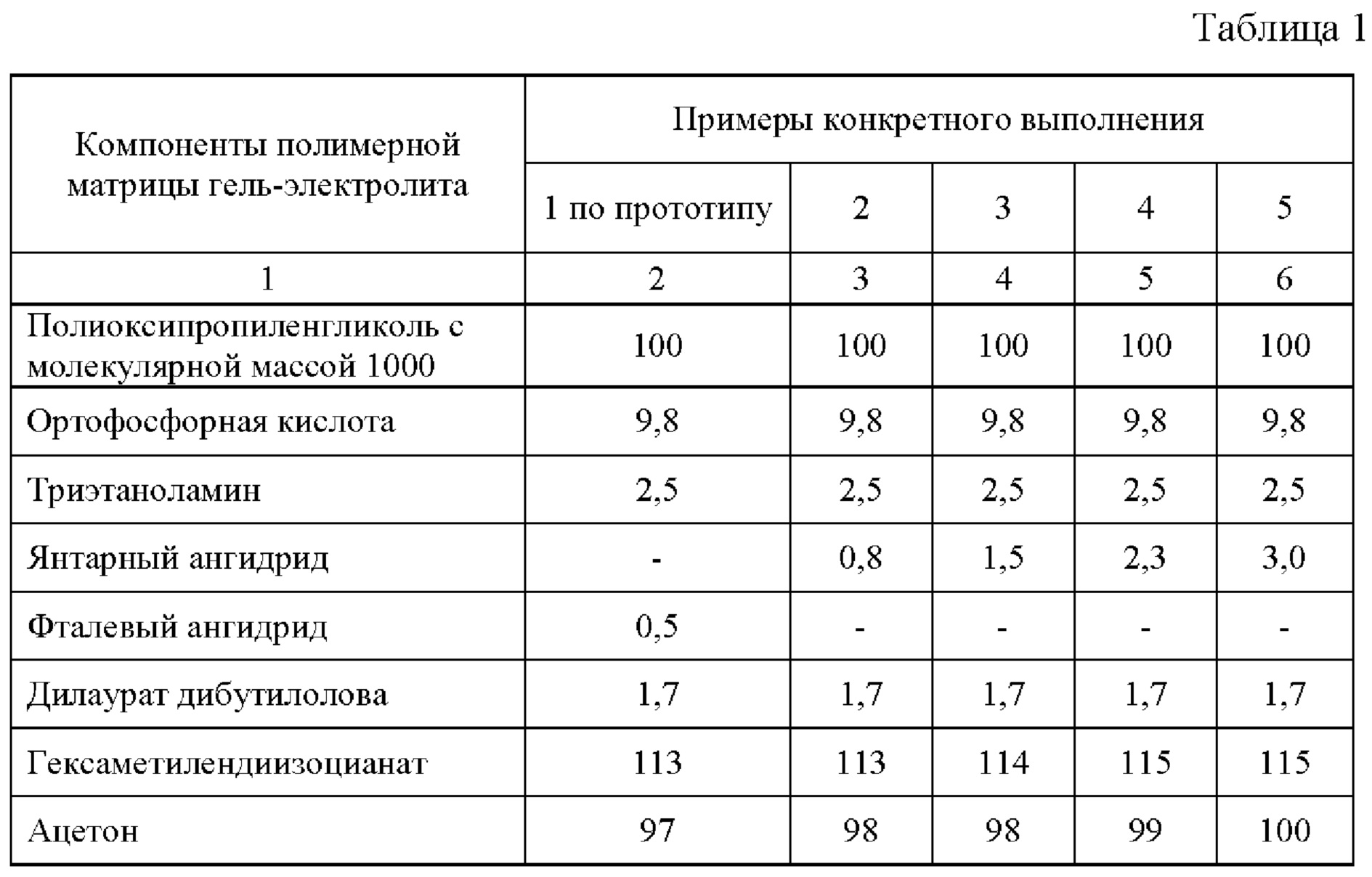 Полимерный гель-электролит для литий-ионных аккумуляторов, состоящий из полимерной матрицы, апротонного органического растворителя и неорганической ионогенной соли лития, отличающийся тем, что для получения полимерной матрицы гель-электролита используется янтарный ангидрид при следующем соотношении компонентов, мас.ч.:полиоксипропиленгликоль с молекулярной массой 1000 100 триэтаноламин 2,5 ортофосфорная кислота 9,8 янтарный ангидрид 0,3-5 гексаметилендиизоцианат 113-117 дибутилдилаурат олова 1,7-1,8 ацетон 97-101