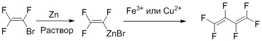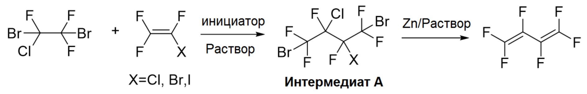 Область техники Настоящее изобретение касается фтор-содержащего электронного газа и, в частности, способа синтеза гексафтор-1,3-бутадиена и его промежуточного соединения путем теломеризации. Предшествующий уровень техники Гексафтор-1,3-бутадиен, кратко именуемый также HFBD, имеет температуру кипения 5,5°C, температуру замерзания около -130°C и плотность жидкости при 15°C 1,44 кг/л. Гексафтор-1,3-бутадиен представляет собой новое поколение экологичного газа для сухого травления с прекрасными рабочими характеристиками и безопасного для окружающей среды, который имеет время жизни в атмосфере (ALT) всего 1,9 дня и значение GWP100 равное 290. Гексафтор-1,3-бутадиен демонстрирует прекрасные свойства в сухом травлении благодаря своему относительно низкому соотношению фтор/углерод, он применяется для травления при производстве Cu-содержащих плат выпрямителей с низкой диэлектрической проницаемостью K и используется главным образом для прецизионного травления критических размеров (точность до 100 нм), обладает лучшей селективностью и аспектным соотношением, чем другие газы для травления. Как один из необходимых материалов для производства высокотехнологичных чипов, гексафтор-1,3-бутадиен представляет собой ключевой газ для травления в новом поколении технологий блоков флэш-памяти 3D NAND. Учитывая растущую потребность в высокотехнологичных чипах, рынок гексафтор-1,3-бутадиена будет расти с каждым днем. В предшествующий уровень техники содержит главным образом указанные ниже сведения, касающиеся синтеза гексафтор-1,3-бутадиена: 1) Процессы с использованием хлора и иода в качестве исходных веществ В патенте CN106336342A, выданном Zhejiang Britech Co., Ltd., описан способ синтеза гексафтор-1,3-бутадиена с использованием хлора и иода в качестве исходных веществ, который включает следующие стадии: (1) реакция хлора с иодом с получением хлорида иода; (2) реакция хлортрифторэтилена с хлоридом иода с получением 1,2-дихлор-1,1,2-трифтор-2-иодэтана (CF2Cl-CFICl); (3) введение 1,2-дихлор-1,1,2-трифтор-2-иодэтана в реакцию внутримолекулярного сочетания в присутствии катализатора с получением 1,2,3,4-тетрахлор-гексафторбутана (CF2Cl-CFCl-CFCl-CF2Cl); и (4) введение 1,2,3,4-тетрахлор-гексафторбутана в реакцию внутримолекулярного дегалогенирования с получением гексафтор-1,3-бутадиена, уравнение реакции выглядит следующим образом: Однако данный способ отличается длинными стадиями и применением дорогого хлорида иода, что повышает стоимость сырьевых материалов. 2) Процессы димеризации В российском патенте RU0118462 описан способ синтеза гексафтор-1,3-бутадиена с применением хлортрифторэтилена в качестве исходного вещества, который включает: введение хлортрифторэтилена в реакцию димеризации при высокой температуре с получением 34% 1,2-дихлоргексафторциклобутана и 27% 3,4-дихлоргексафтор-1-бутена, разделение этих двух продуктов на высокоэффективной ректификационной колонне, и дехлорирование 3,4-дихлоргексафтор-1-бутена порошком цинка с получением целевого продукта гексафтор-1,3-бутадиена, уравнение реакции выглядит следующим образом: Однако, реакция полимеризации в этом способе требует высокой температуры и высокого давления и имеет селективность всего 27%. 3) Процессы сочетания с цинк-органикой В патенте CN105732301A, выданном Sinochem Lantian Co Ltd., описан способ, в котором бромтрифторэтилен, как исходное вещество, реагирует с порош