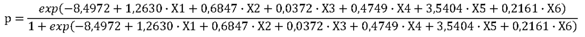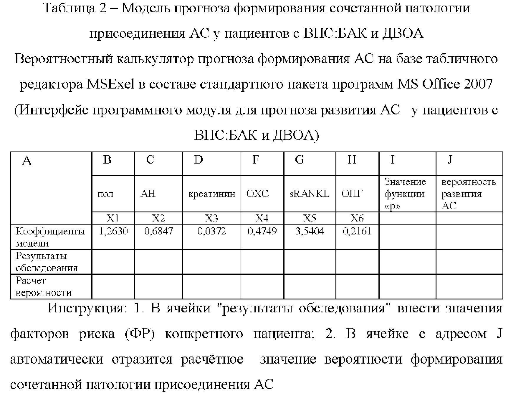Изобретение относится к области медицины, кардиологии и сердечно-сосудистой хирургии и может быть использовано для прогнозирования риска развития аортального стеноза (АС) у пациентов с врожденным пороком сердца: бикуспидальный аортальный клапан (ВПС:БАК) и дилатацией восходящего отдела аорты (ДВОА). Известен способ оценки кальциноза аортального клапана при помощи ультразвуковой денситометрии (патент РФ №2306104, опубл. 20.09.2007 г.), включающий выполнение ультразвукового исследования сердца на диагностической системе Nemio 35 (TOSHIBA) для визуализации используют стандартную кардиальную программу (IHeartA), кардиальный датчик - фазированную решетку и стандартные заводские настройки получения изображения: уровень Gain-80, частоту инсонации датчика - 2,5 МГц без применения 2-й гармоники; при этом изображение аортального клапана выводится из парастернальной позиции датчика с сечением по короткой оси, аортальный клапан оконтурируется включая клапанное кольцо по методу эллипса и после проведения ультразвуковой денситометрии с использованием программы 2Б-гистограммы оценивается значение показателя Mean. Недостатком известного способа является его трудоемкость и необходимость применения дорогостоящих приборов и диагностической системы. Также известен способ определения риска наличия кальциноза клапана аорты у пациентов 60 лет и старше (патент РФ №2754946, опубл. 08.09.2021 г.), который включает определение содержания аполипопротеина А-1 в сыворотке крови и расчет значения дискриминантной функции по формуле: Д=-4,6×АпоА-1+5,22, где: АпоА-1 - содержание АпоА-1 в сыворотке крови (г/л); если Д>0, пациента относят к группе имеющего кальциноз, при ДО пациента относят к группе не имеющего кальциноз клапана аорты. Недостатком известного способа являются возрастные ограничения, данный способ рассчитан только для пациентов старше 60 лет. Техническим результатом предлагаемого изобретения является создание способа прогнозирования риска развития аортального стеноза у пациентов с бикуспидальным аортальным клапаном и дилатацией восходящего отдела аорты, позволяющего повысить достоверность и специфичность прогнозирования риска развития аортального стеноза. Указанный технический результат при реализации изобретения достигается тем, что в способе прогнозирования у пациента в сыворотке крови определяют биомаркеры кальциноза sRANKL и остеопротегерина, общий холестерин, креатинин; оценивают степень тяжести аортальной недостаточности (АН) по данным эхокардиографического исследования; далее рассчитывают логистическую функцию вероятности возникновения аортального стеноза по формуле: где р - вероятность возникновения аортального стеноза в %; X1 - пол пациента: мужской - 1, женский - 0; Х2 - АН: 0 - отсутствие регургитации/приклапанная, легкая - 1, умеренная - 2, тяжелая - 3; Х3 - значение креатинина в сыворотке крови в мкмоль/л; Х4 - значение общего холестерина в сыворотке крови в ммоль/л; Х5 - значение sRANKL в сыворотке крови в пмоль/л; Х6 - значение остеопротегерина в сыворотке крови в пмоль/л; -8,4972 - свободный член уравнения; полученное значение р>85% свидетельствует о развития аортального стеноза у пациентов с бикуспидальным аортальным клапаном и дилатацией восходящего отдела аорты. Основой заявленного способа является построение логистической регрессионной модели (прогностическо
