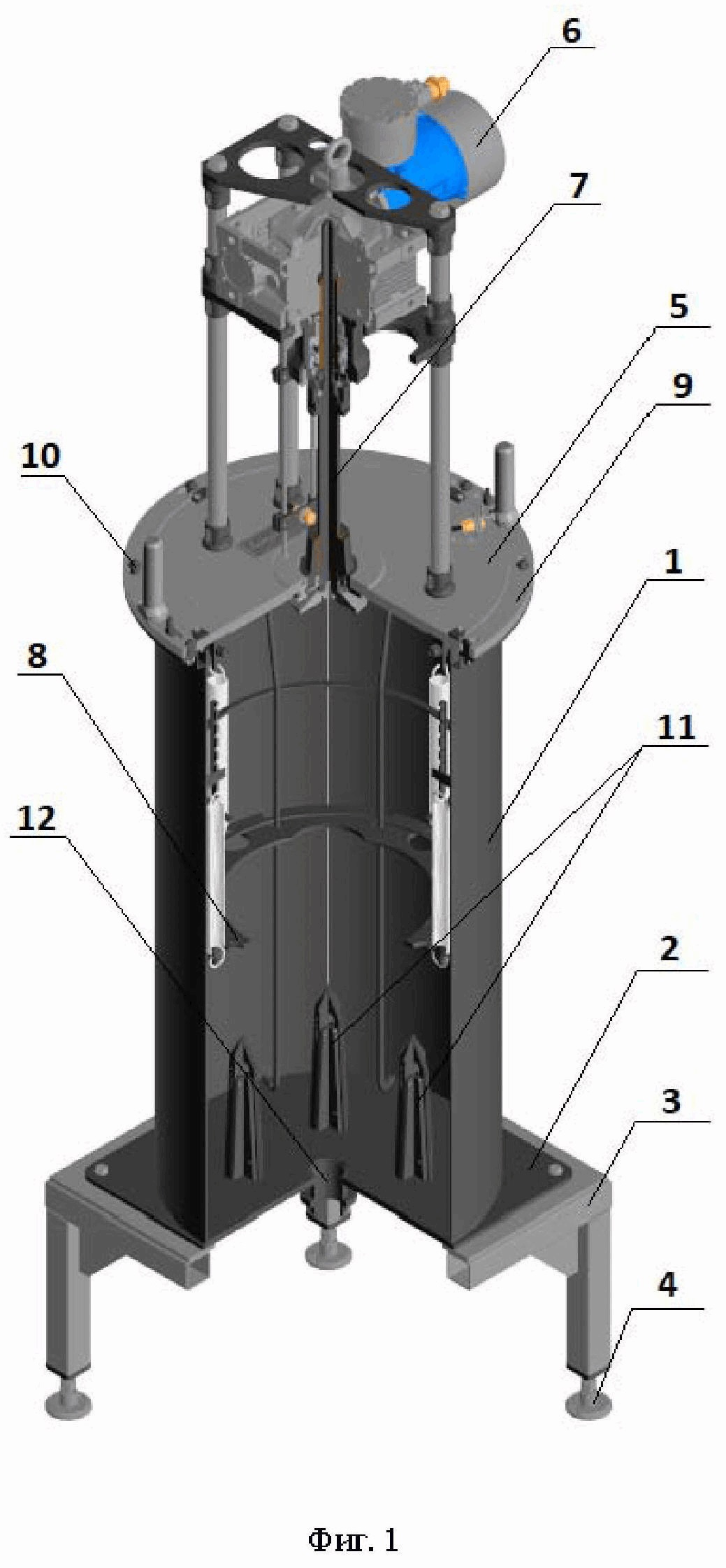 Установка растаривания предназначена для приготовления растворов заданной концентрации из твердых токсичных реагентов, в частности для растаривания бочек с цианистыми солями, без непосредственного участия человека в операциях перфорации дна бочек, растворения и нейтрализации. Известна установка для растаривания металлических барабанов с токсичными реагентами (патент №2705447, публ. 2019.11.07), включающая узел растаривания с вытяжным устройством, платформу для установки барабанов, уровнемер, рабочий орган, выполненный в виде колокола с приспособлением для прокалывания барабанов, емкость приготовления раствора заданной концентрации с системой разводки трубопроводов, снабженной переключателем потока жидкости, отличающаяся тем, что установка снабжена системой управления, интерфейс которой выполнен в виде мнемосхемы установки, платформа для установки барабанов выполнена наклонной, при этом барабаны поднимают электроталью и размещают горизонтально, платформа снабжена отсечным барьером, ограждающей рамой и механизмом удаления опорожненных барабанов, система разводки трубопроводов снабжена электроклапанами, а приспособление для прокалывания барабанов выполнено в виде копья, состоящего из наконечника и пустотелого штока, причем наконечник выполнен в виде плоских ножей, жестко закрепленных между собой, имеющих в поперечном сечении крестообразную форму, на оси наконечника расположена размывная головка с сопловыми отверстиями, пустотелый шток жестко закреплен на каретке, которая перемещается вверх-вниз по направляющим при помощи электродвигателя с редуктором и цепной передачи. К недостаткам известной конструкции можно отнести сложность конструкции привода наконечника, недостаточная герметичность и низкая производительность. Технический результат, достигаемый при использовании установки растаривания, заключается в повышении герметичности установки и упрощение ее конструкции. Технический результат достигается тем, что установка растаривания содержит цилиндрическую емкость, закрепленную на основании с регулируемыми опорами, головное устройство в виде крышки с замком и с установленным на крышке электроприводом штока, воздействующего на загруженную в емкость тару, на дне емкости закреплены не менее четырех наконечников для перфорации тары с каналами подачи подготовленной воды и вывода раствора внутрь емкости, выходной патрубок, при этом внутри емкости установлена подпружиненная опора, препятствующая проколу тары при загрузке в емкость, между емкостью и крышкой образован канал гидрозатвора с входным патрубком и возможностью перелива жидкости из канала в емкость. Установка поясняется чертежами. На Фиг. 1 изображена установка в целом, на Фиг. 2 изображен наконечник для перфорации, на Фиг. 3 изображен канал гидрозатвора и замок головного устройства. Установка содержит герметичную цилиндрическую емкость 1 с опорной пластиной 2, закрепленной на основании 3 с регулируемыми опорами 4, головное устройство 5 в виде крышки, с установленным электроприводом 6 штока 7 и датчиком ограничения хода штока. При операции загрузки - выгрузки тары (барабанов), головное устройство 5 устанавливается на направляющие штыри емкости 1 при помощи грузоподъемного механизма. Внутри емкости 1 установлена подпружиненная опора 8 в виде