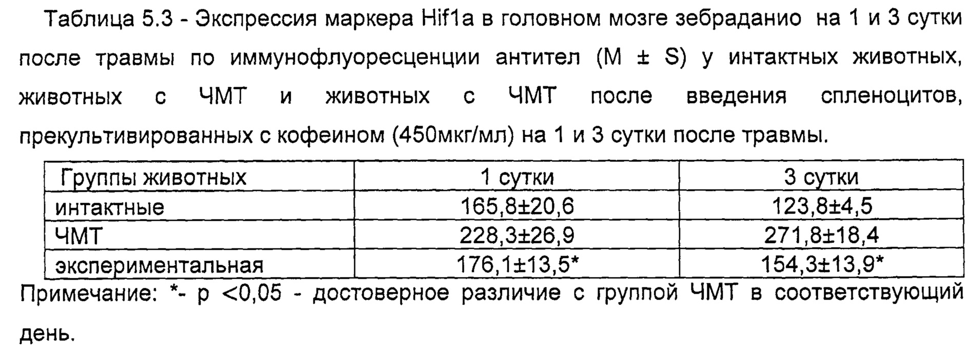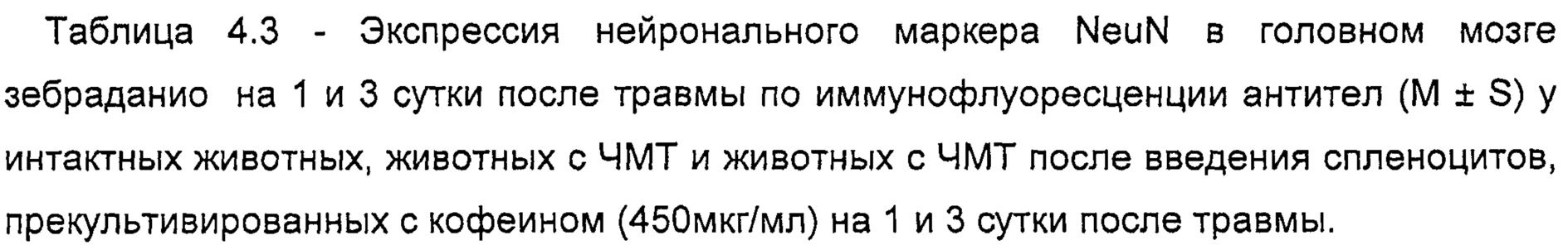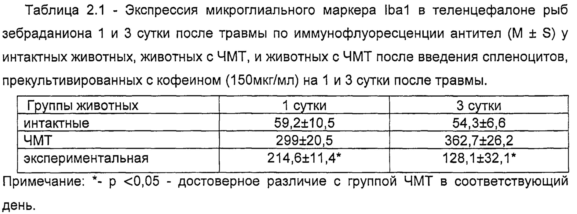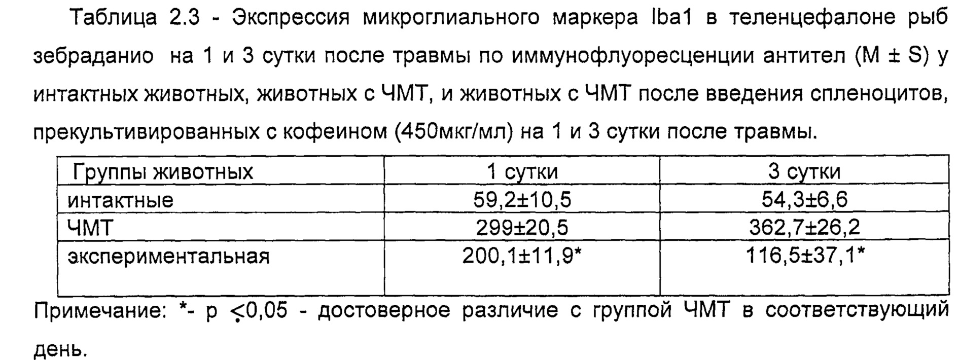 Изобретение относится к медицине, а именно к невропатологии. Забор зрелых периферических иммунных клеток производят у зебраданио с закрытой черепно-мозговой травмой (ЧМТ). Затем клетки подвергают in vitro экспозиции с кофеином в действующих концентрациях 150-450 мкг/мл в течение 20-25 минут. Отмывают от кофеина и вводят отмытые клетки в кровоток зебраданио с закрытой черепно-мозговой травмой в дозе 80×103 клеток на особь. Способ позволяет исключить непосредственное введение в организм животного кофеина, который воздействует на все органы и ткани организма, ускорить восстановительные процессы после ЧМТ за счет обработки периферических зрелых иммунных клеток кофеином in vitro и внутривенного введения модулированных кофеином сингенных иммунных клеток. 15 табл., 15 пр.